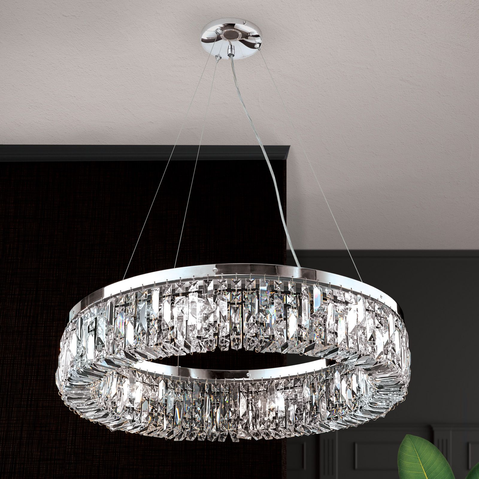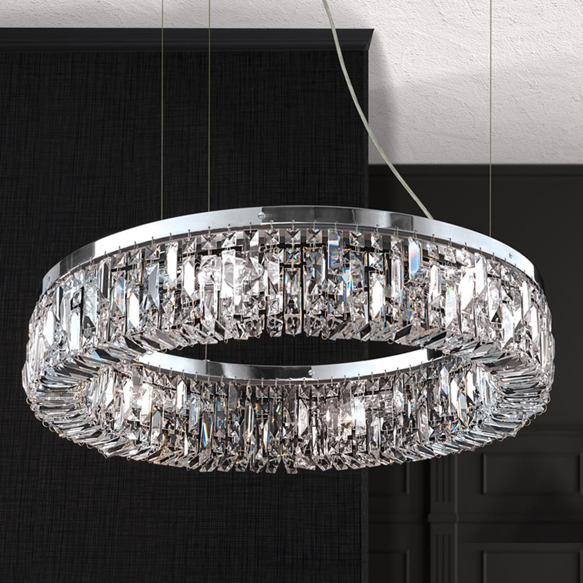Eindrucksvolle Lichtspiele lassen sich mit dem Kronleuchter RING in modern, aber auch klassisch eingerichtete Räume zaubern. Ob über einem Esstisch angebracht oder im Eingangsbereich, aufgrund seines geringen Durchmessers von 59 cm kann er vielseitig eingesetzt werden. Egal, wo er seinen Platz findet, er sorgt für eine glanzvolle und ausreichende Ausleuchtung des Raumes. Eine beachtliche Anzahl an SCHÖLER CRYSTAL® Kristallen in Prismenform angebracht an einem ringförmigen Messinggestell runden das Gesamtbild perfekt ab und machen ihn zu einem wunderschönen Blickfang. Die Leuchtmittel sind hinter dem Kristallbehang angebracht, wodurch die Leuchte ihr einzigartiges Funkeln erhält. Der Luster ist mit 6 E14-Fassungen ausgestattet, die mit maximal 40 Watt bestückt werden können. Erhältlich in den Oberflächen Chrom und Gold.