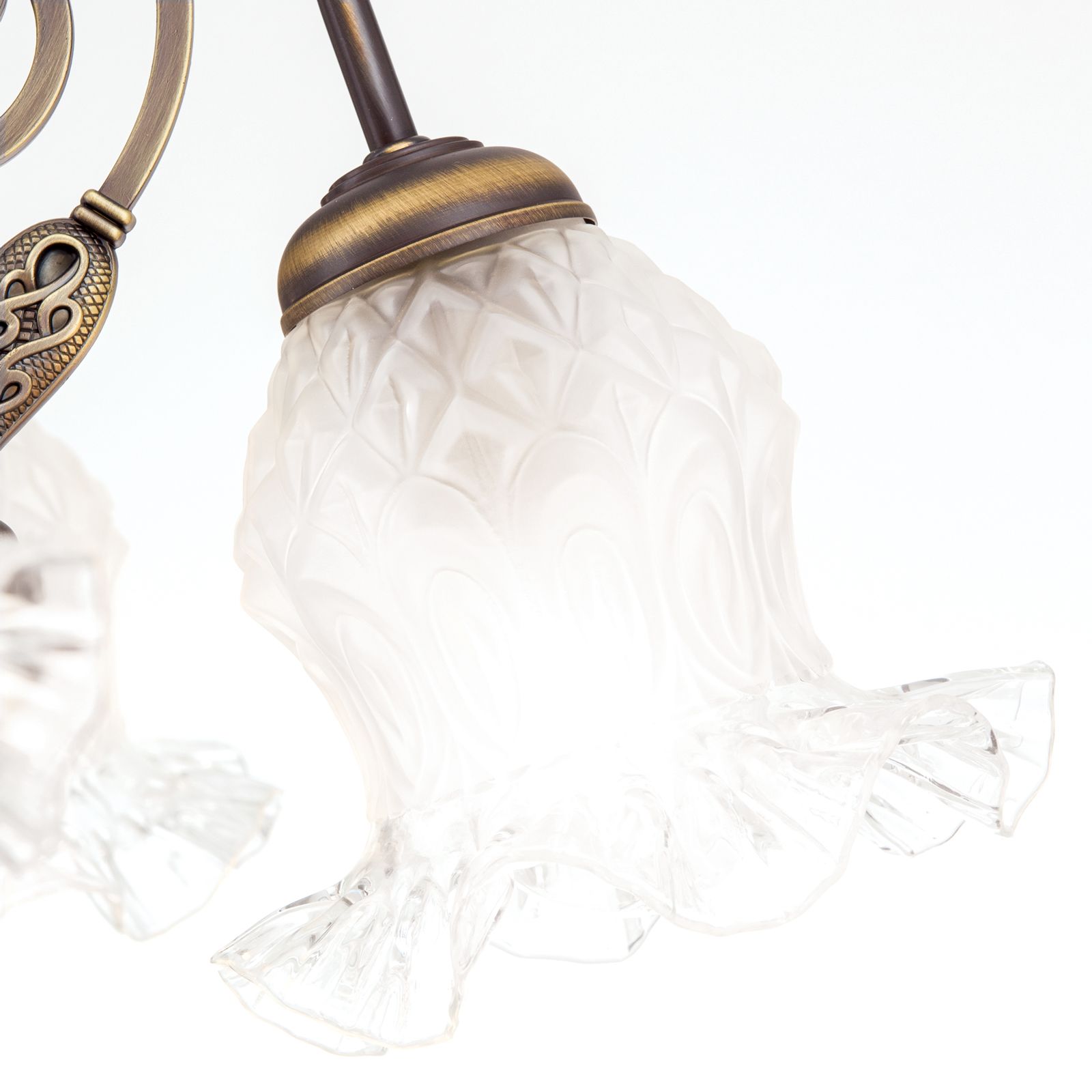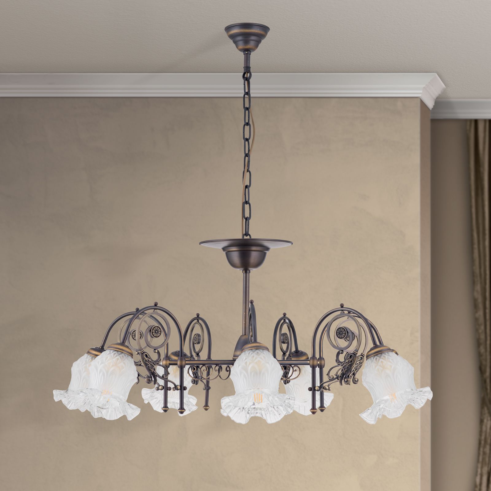 Ein besonderes Highlight dieses Kronleuchters sind die Blütengläser, die die Leuchtmittel umgeben. Diese Gläser verleihen dem Kronleuchter RINGSTRASSE eine romantische und verspielte Note und sorgen für eine sanfte Lichtstreuung, die Ihren Raum in ein warmes und einladendes Ambiente taucht.