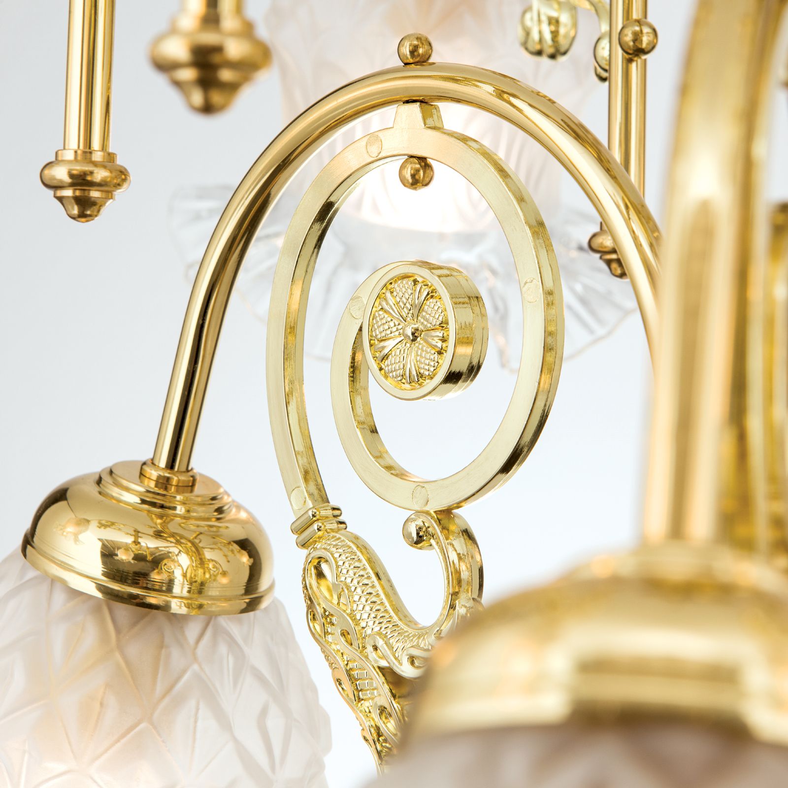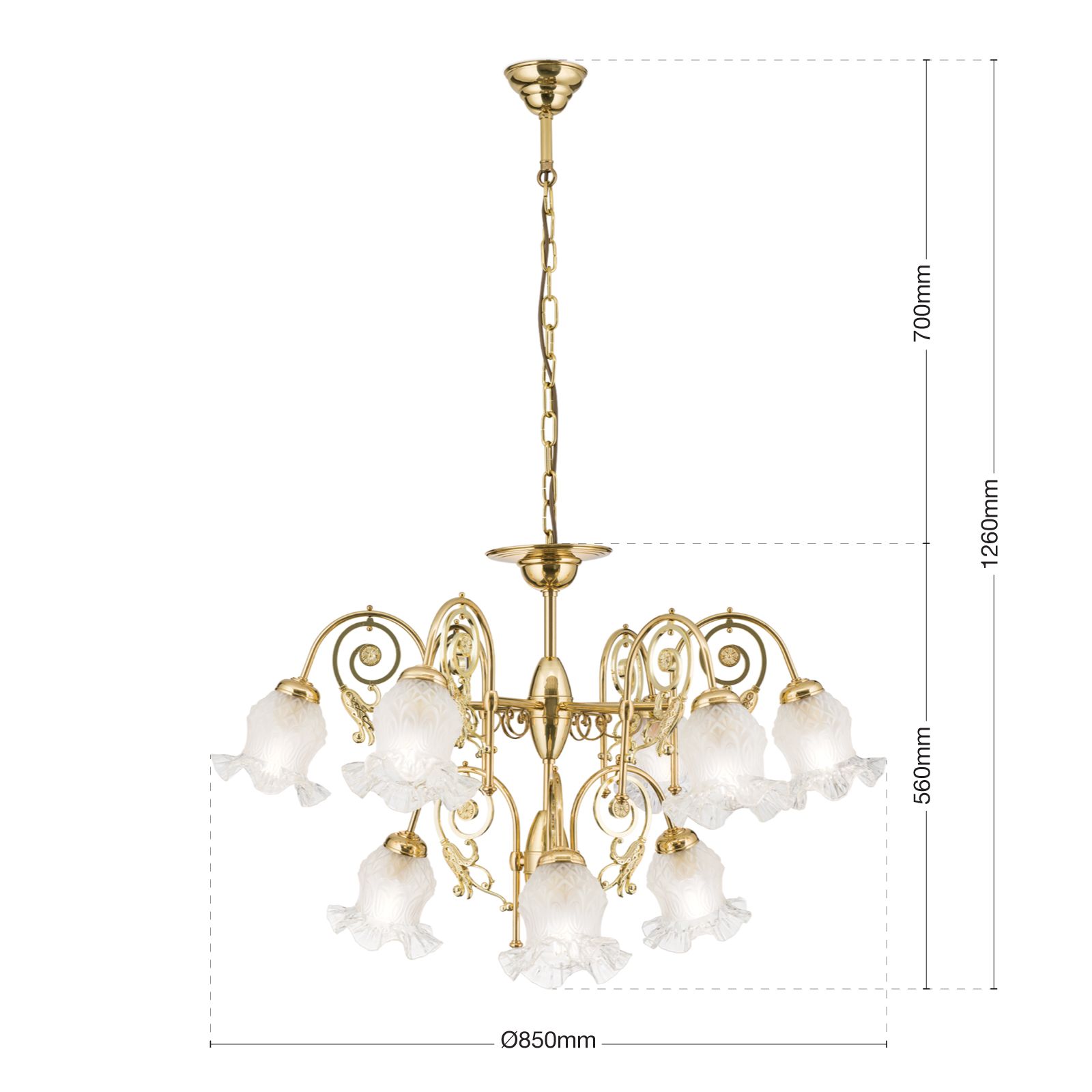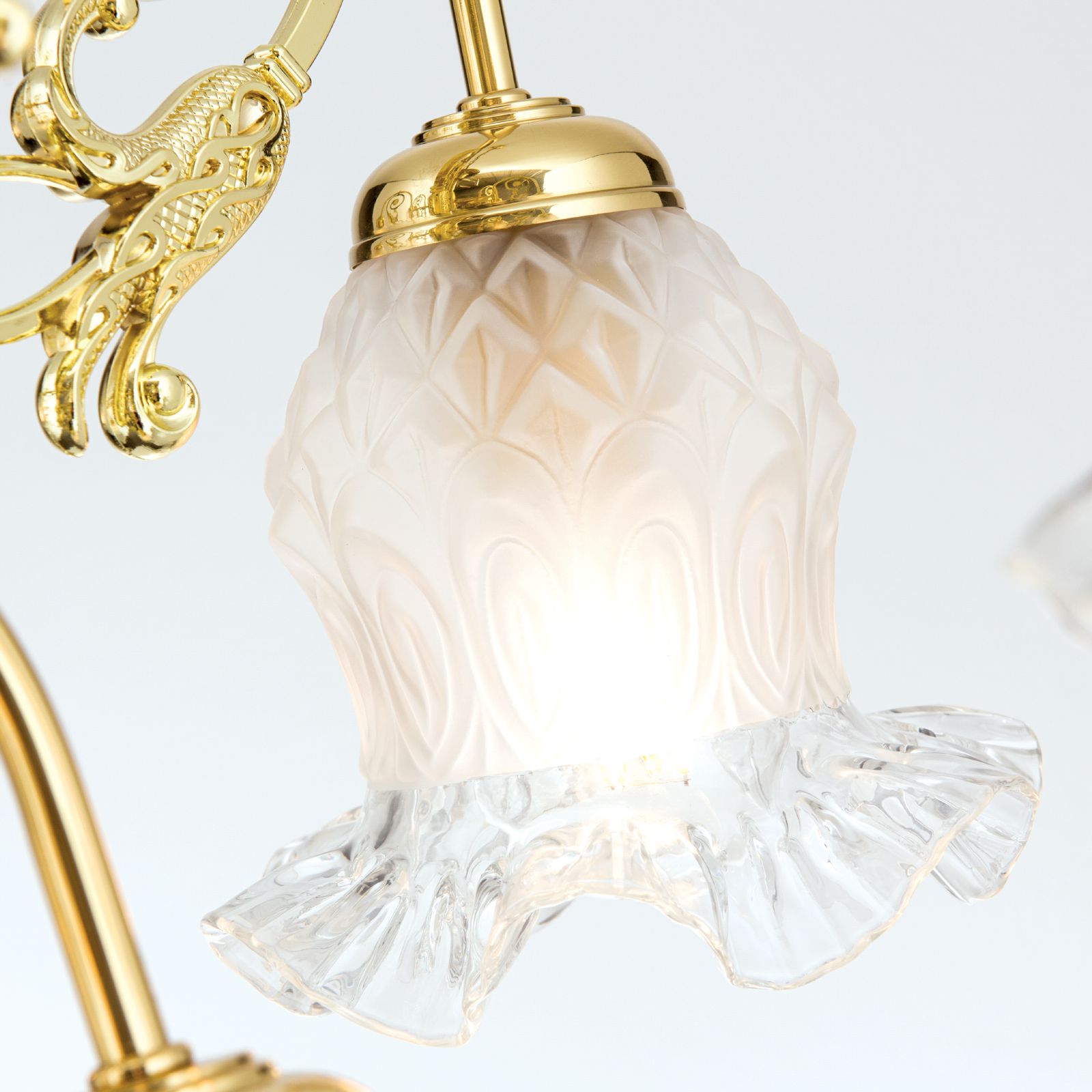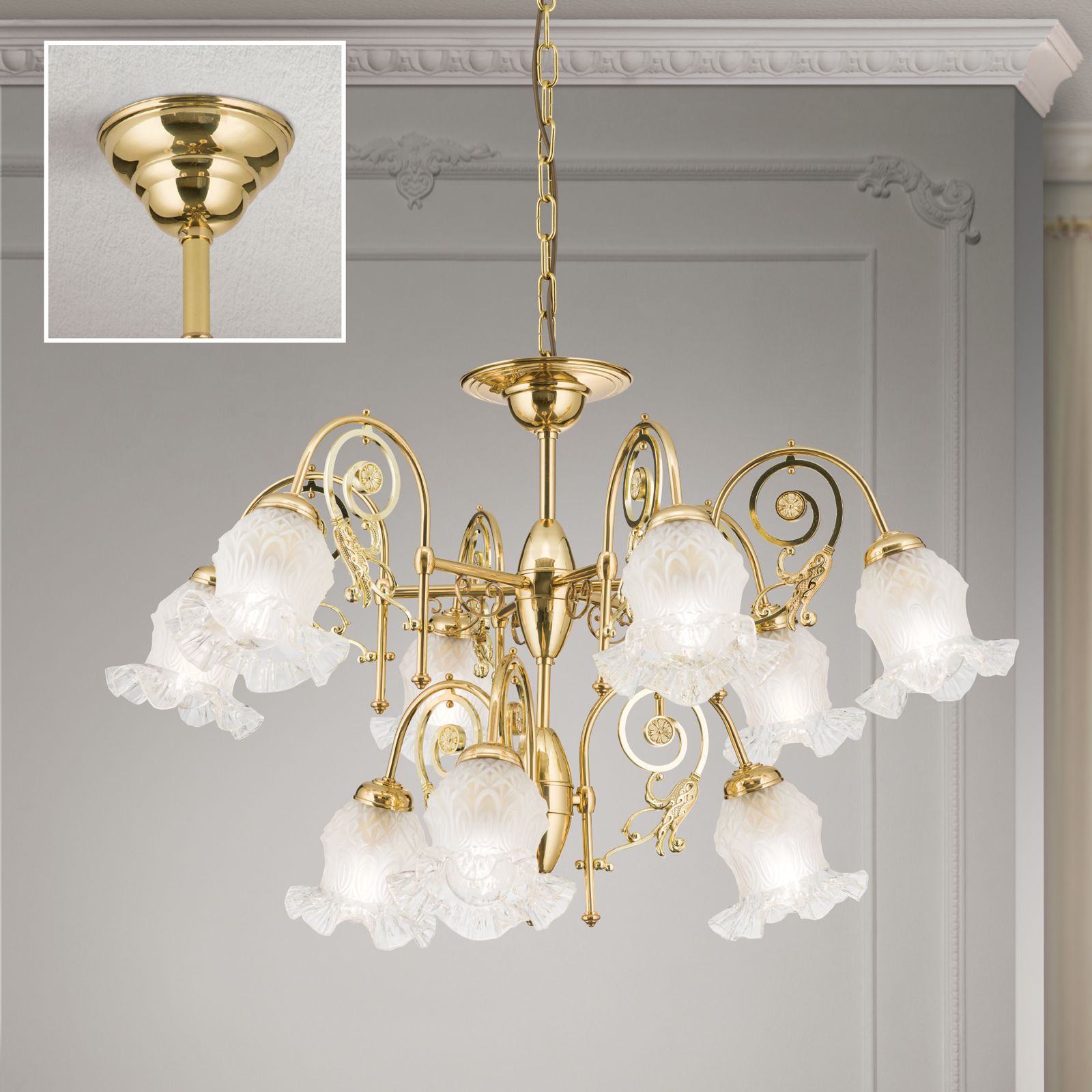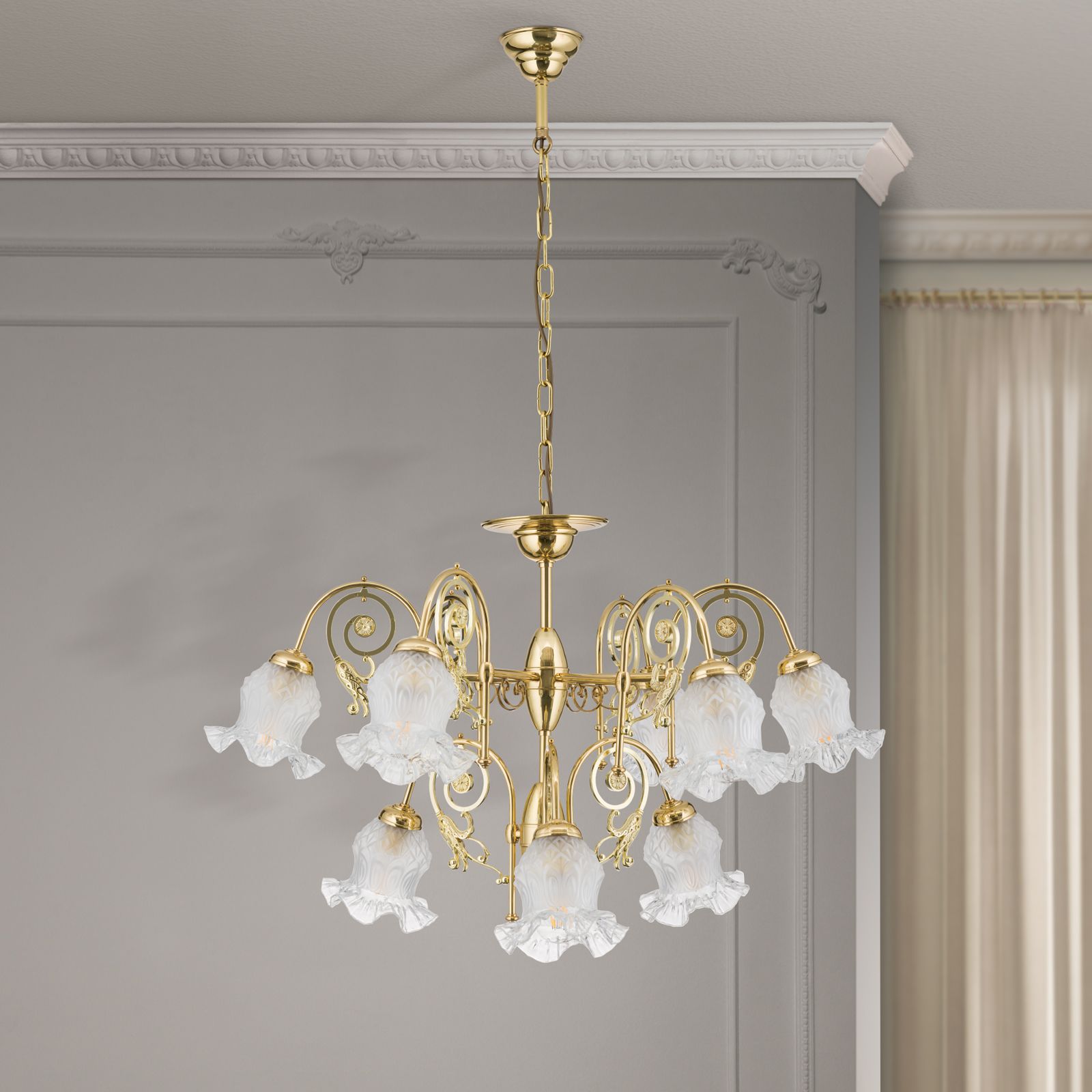 Ein besonderes Highlight dieses Kronleuchters sind die Blütengläser, die die Leuchtmittel umgeben. Diese Gläser verleihen dem Kronleuchter RINGSTRASSE eine romantische und verspielte Note und sorgen für eine sanfte Lichtverteilung, die Ihren Raum in ein warmes und einladendes Ambiente taucht.