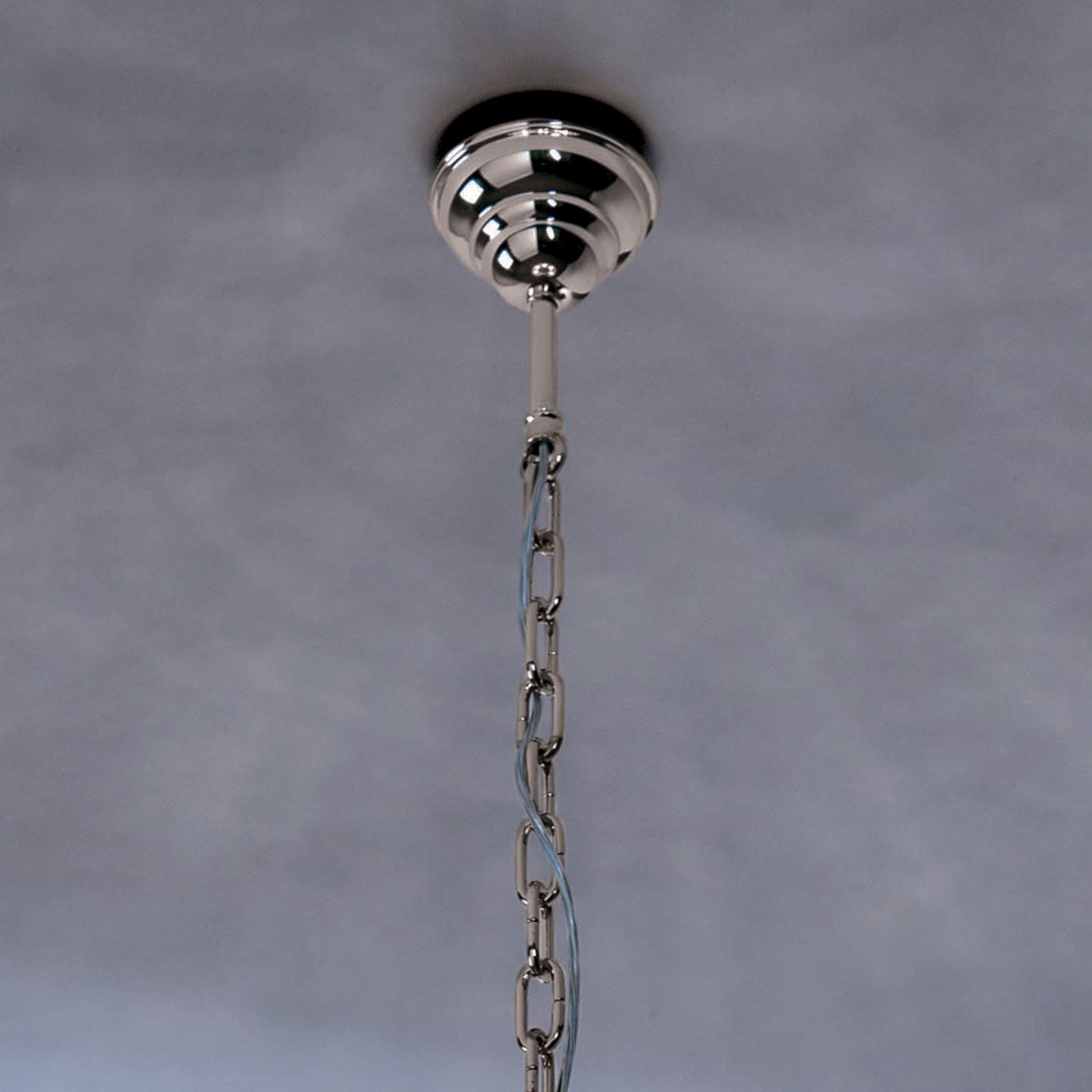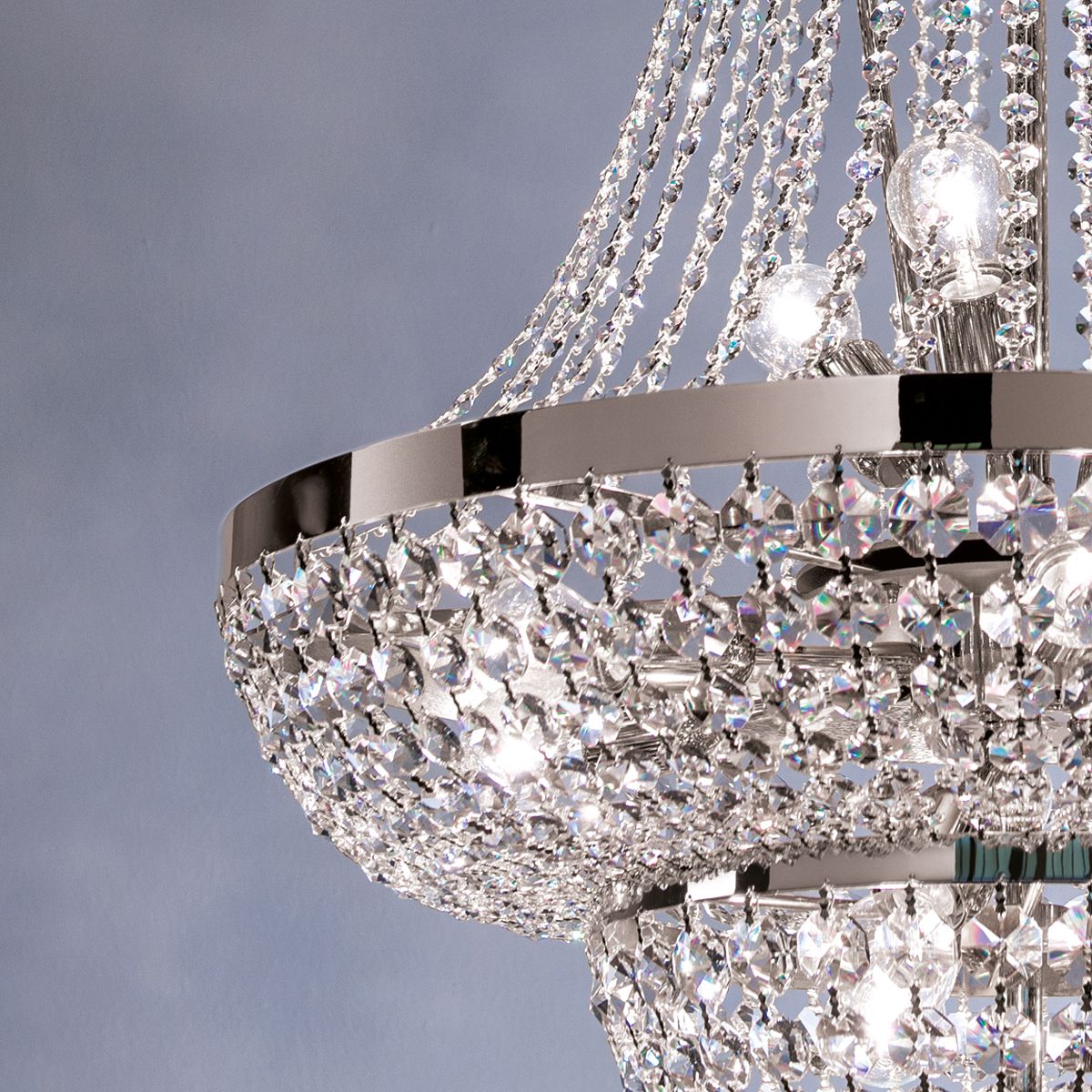 Der Kronleuchter mit einer Höhe von 107 cm und einer Abhängung von 70 cm sowie einem Durchmesser von 70 cm ist aus Vollmessing gefertigt und verchromt oder vergoldet erhältlich. Aufgrund seiner Dimensionen eignet er sich für die glamouröse Ausstattung von Festsälen, Foyes oder auch privaten Räumlichkeiten mit hoher Decke.