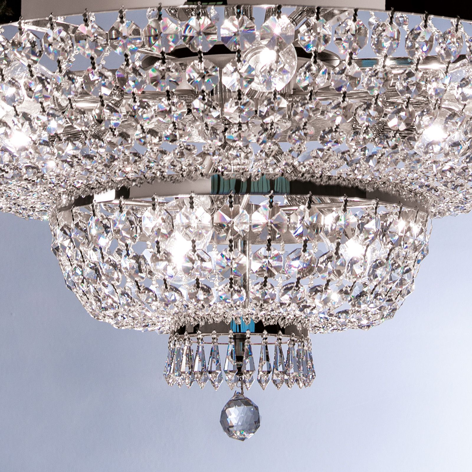 Er besteht aus 4 Ringen, die mit unzähligen Kristallkoppen bestückt sind. Für das gewisse Etwas sorgt eine facettierte Kristallkugel, die zentral an einer von tropfenförmigen Kristallen eingefassten Zierplatte angebracht ist und sich in dieser widerspiegelt.