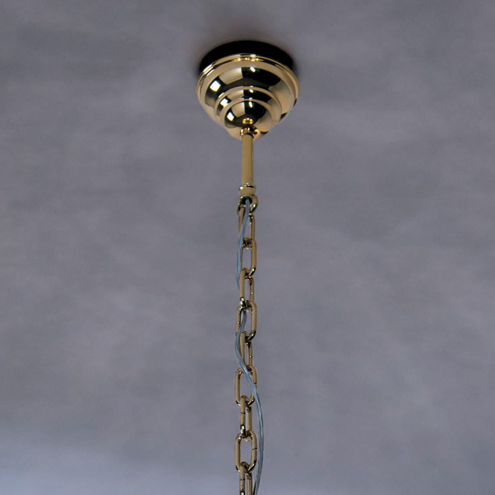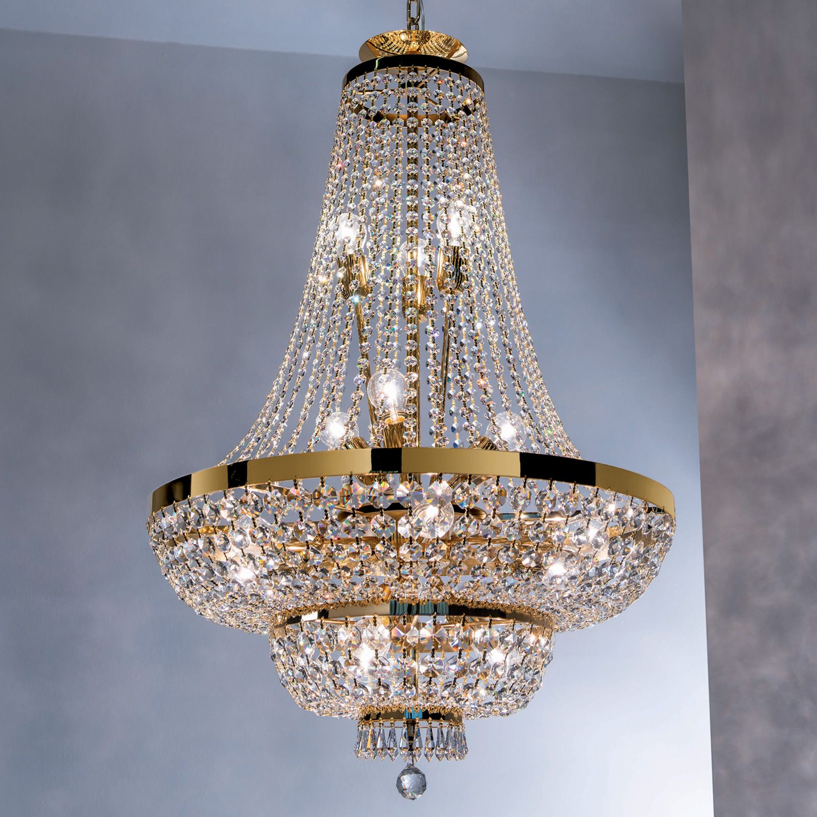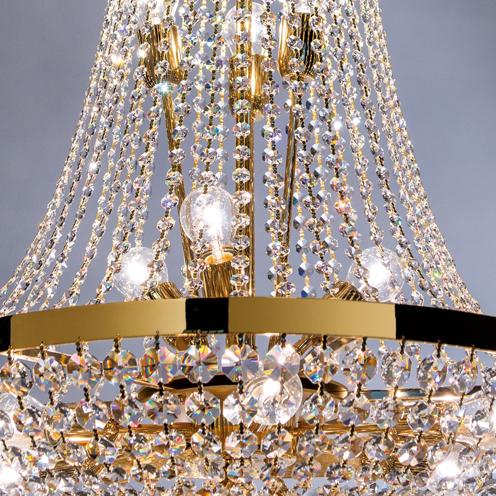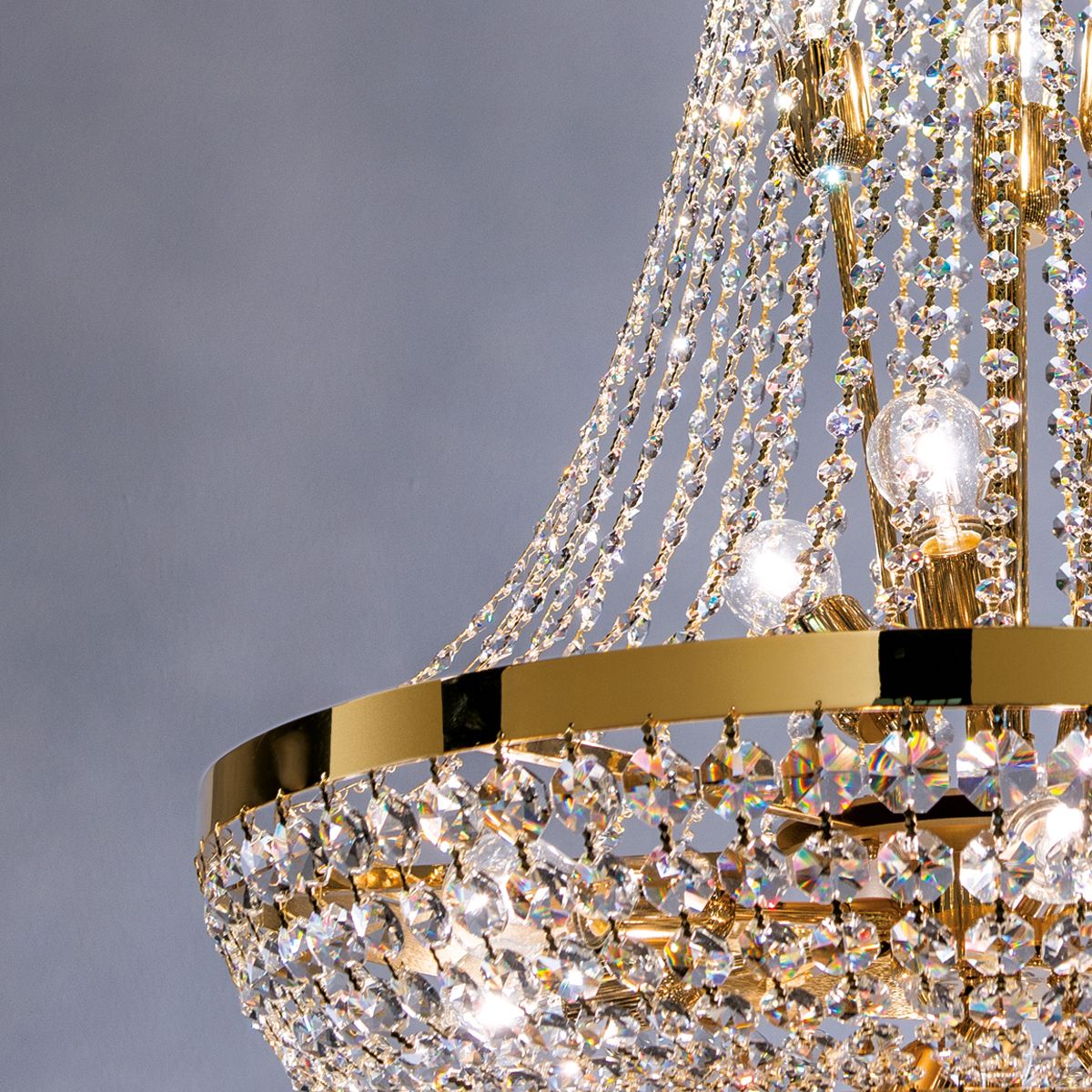 Der Kronleuchter mit einer Höhe von 107 cm und einer Abhängung von 70 cm sowie einem Durchmesser von 70 cm ist aus Vollmessing gefertigt und verchromt oder vergoldet erhältlich. Aufgrund seiner Dimensionen eignet er sich für die glamouröse Ausstattung von Festsälen, Foyes oder auch privaten Räumlichkeiten mit hoher Decke.