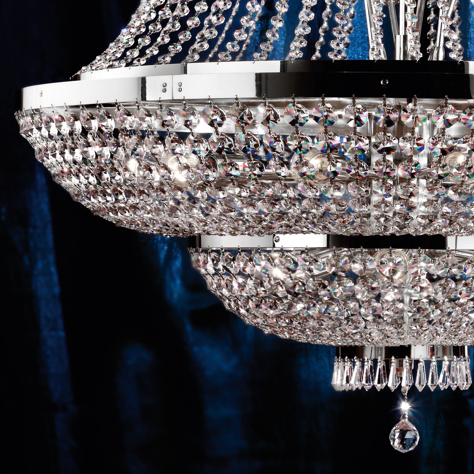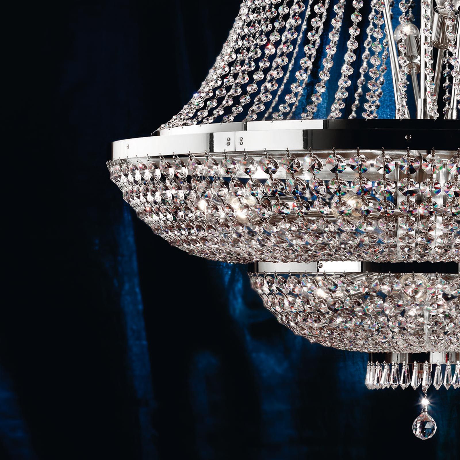 Der faszinierende Kronleuchter SHERATON verspricht einen glanzvollen Auftritt bei gehobenen Anlässen und wird zum sicheren Blickfang jedes Raumes. Nicht nur im Privatbereich, sondern auch im Objektbereich wird er eingesetzt und sorgt dort für festliche Eleganz.