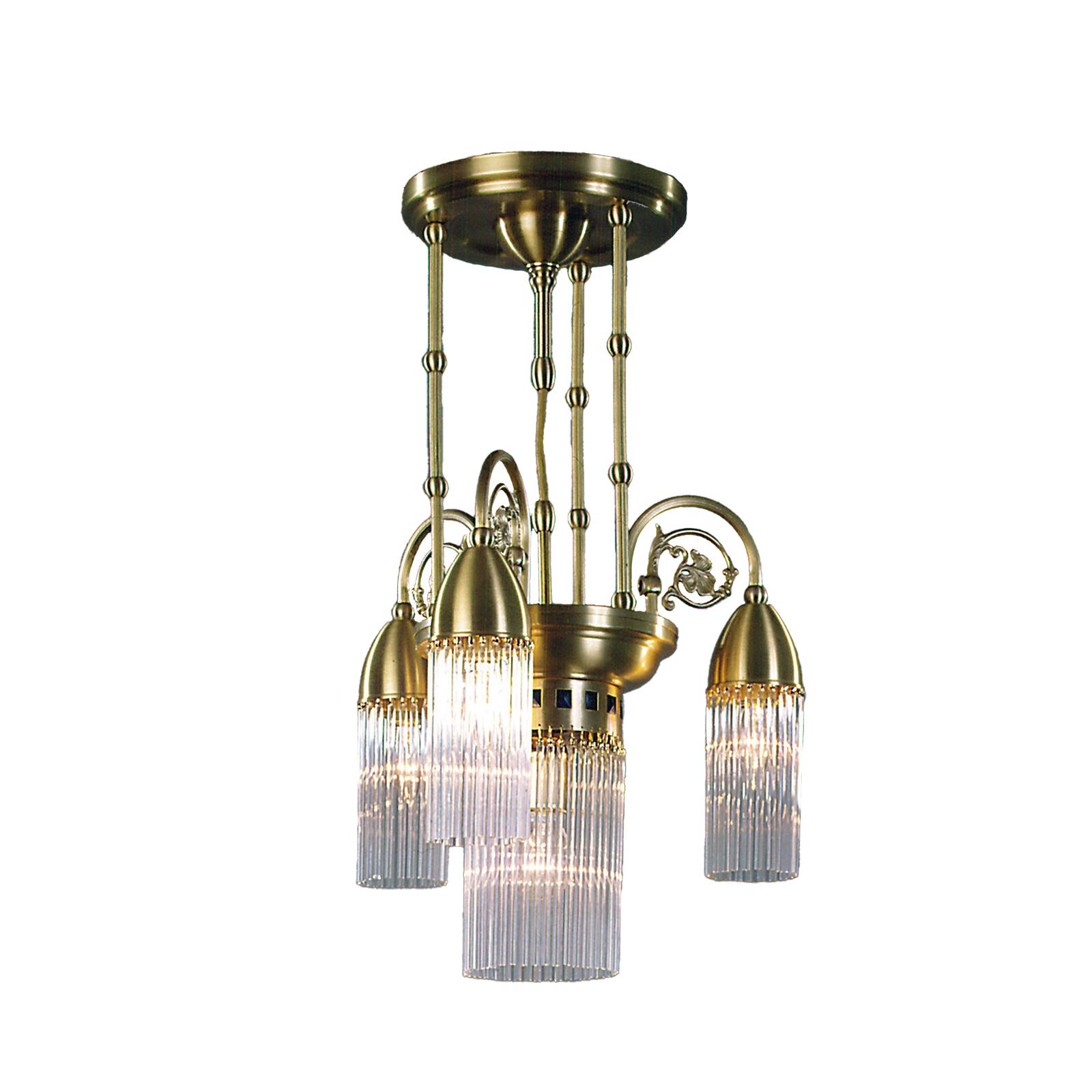 Der 4-flammige Luster aus der STÄBCHENSERIE verzaubert durch das Lichtspiel der Vollglasstäbchen mit den Reflexionen der messingenen Oberfläche. Der bewusste Kontrast von reduzierten Formen und träumerischen Rankenverzierungen prädestiniert diesen Leuchter für eine Einbindung in barocke, antike Ensembles, aber auch in modernere Möblierungen. Das freundliche, warm zurückstrahlende Licht, das von dieser Leuchte ausgeht, passt gut in ein Schlafzimmer aber auch in einen Eingangsbereich oder Treppenaufgang. Die Leuchte ist mit drei E14-Fassungen zu je maximal 40 Watt und einer E27-Fassung zu maximal 60 Watt ausgestattet.