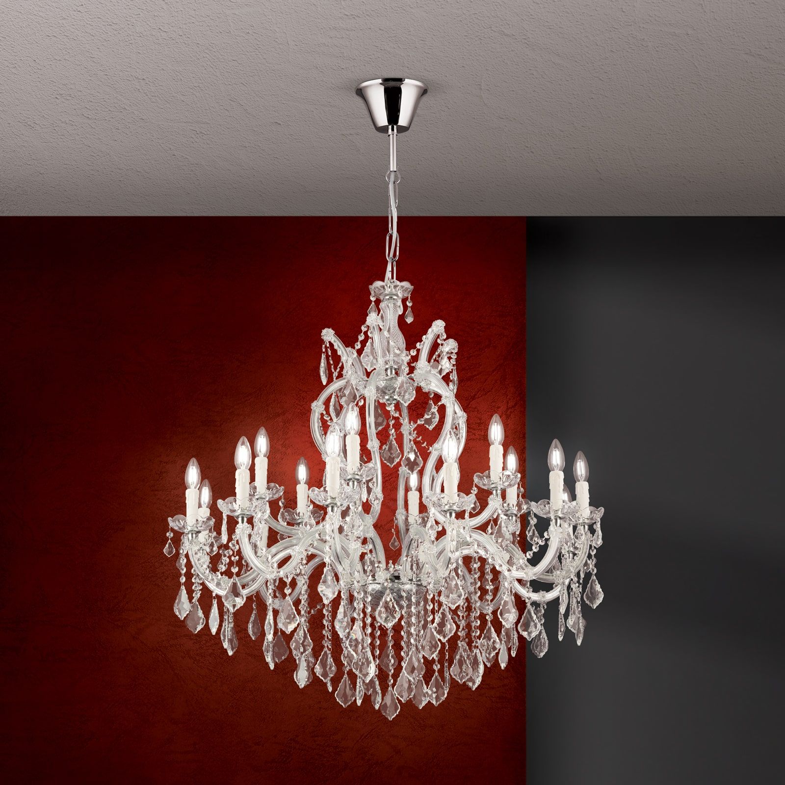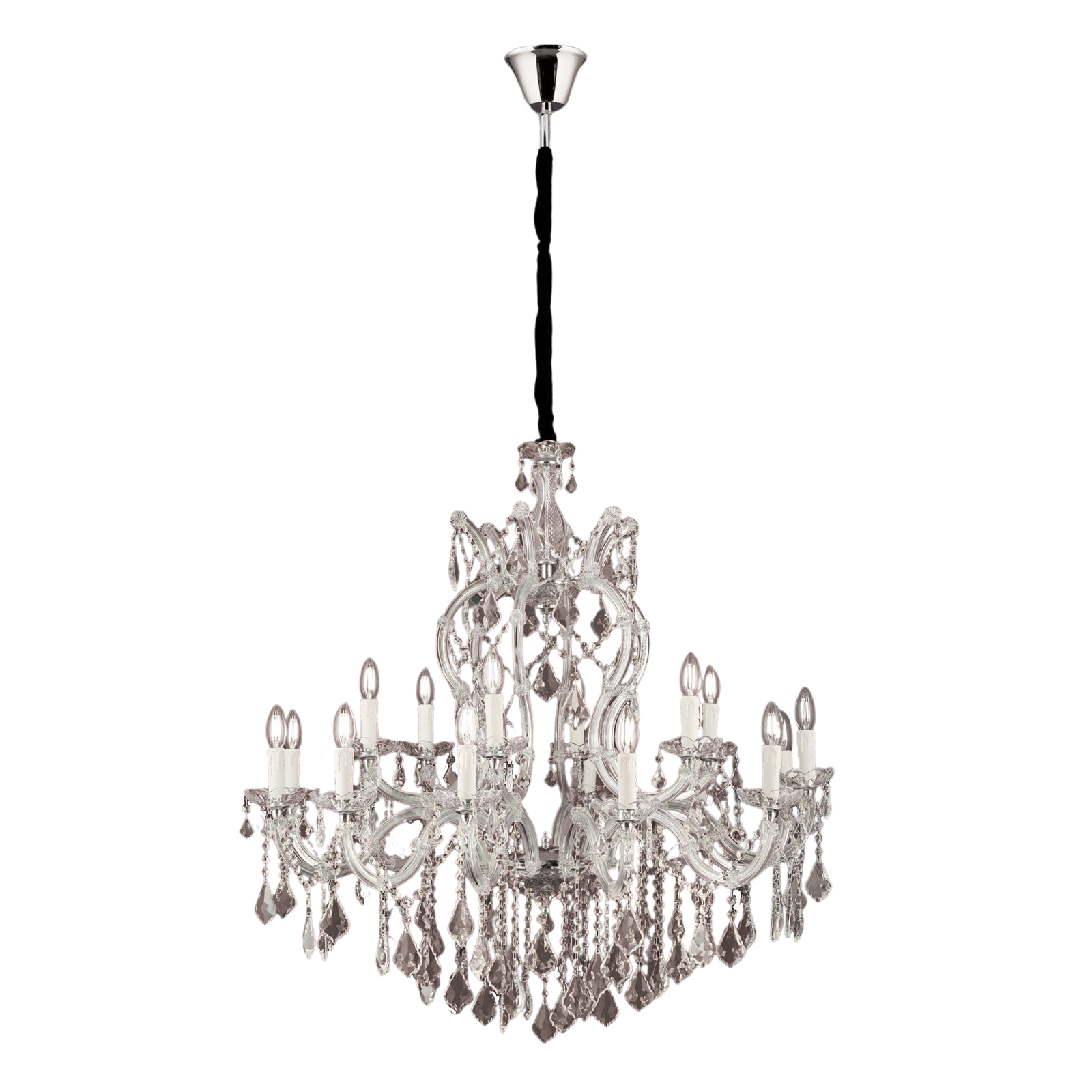 Der 18-flammige Luster aus der THERESA-Serie in Silber entfaltet für uns seinen königlichen Prunk in Ballsäälen, großen Salons, über Festtafeln - oder man weidet sich daran aus purer Lebensfreude! Achtzehn in zwei Stöcken - unten 12, oben 6 -angeordnete Flammen in Kerzenoptik stehen in gläsernen Wachstropfschalen. Die Arme sind in Ringelreih miteinander durch Perlenketten mit Kristallbehang verbunden. In der Mitte geht alles in ein prachtvolles Gefüge aus Bögen und Pendeln aus K9 Kristallen über. Seide, Brokat, Damast, warme Farben, Holz sind die natürlichen Gefährten dieses Lusters. Der Kronleuchter ist mit achtzehn E14-Fassungen à bis zu 40 Watt ausgestattet.