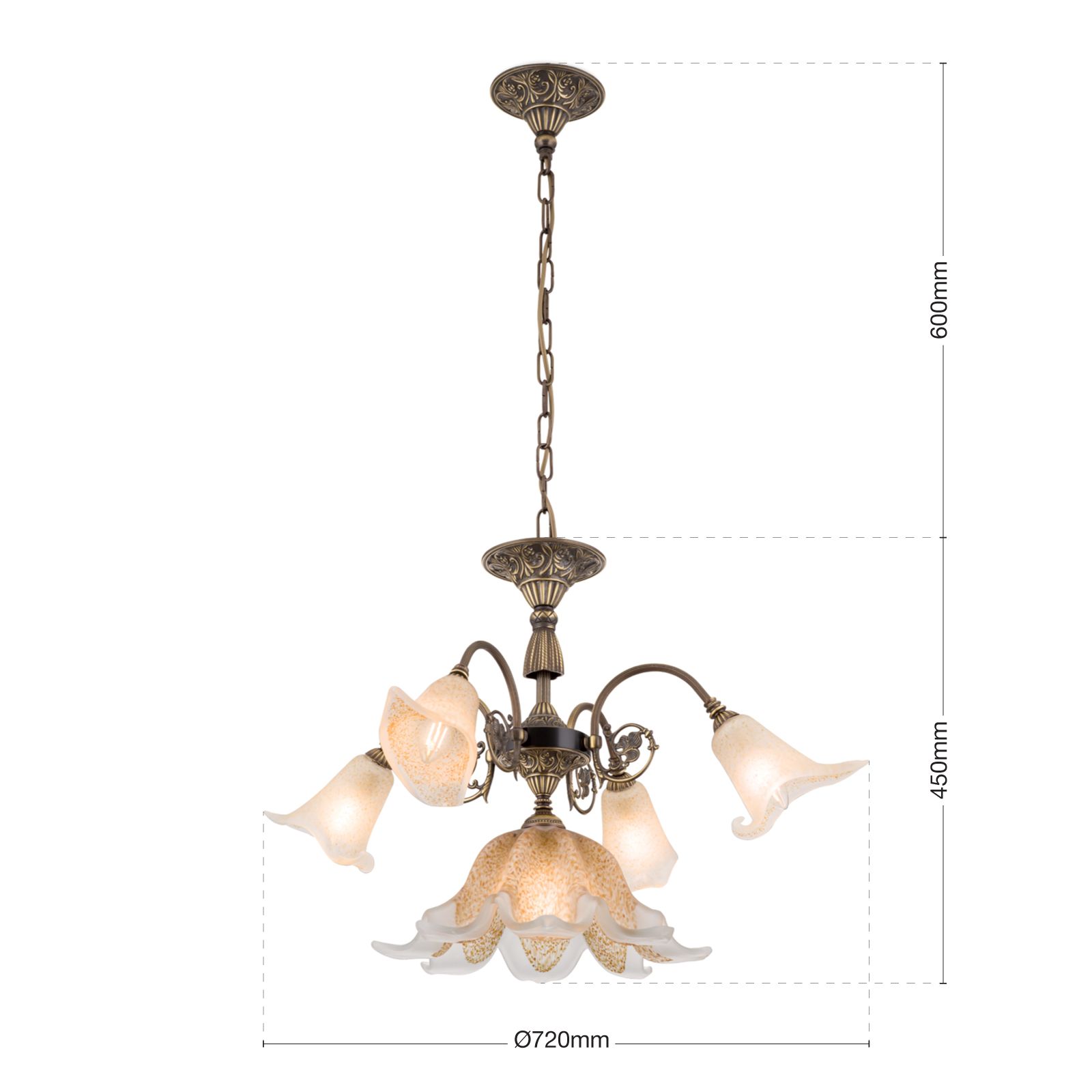 In Räumen wie Esszimmer, Küche, Schlafzimmer und Arbeitsbereich erzeugt dieser Kronleuchter eine angenehme Grundstimmung, dank der gleichmäßigen Lichtverteilung durch die matt satinierten Glasschirme. Die Leuchte verfügt über vier E14-Fassungen sowie eine E27-Fassung.