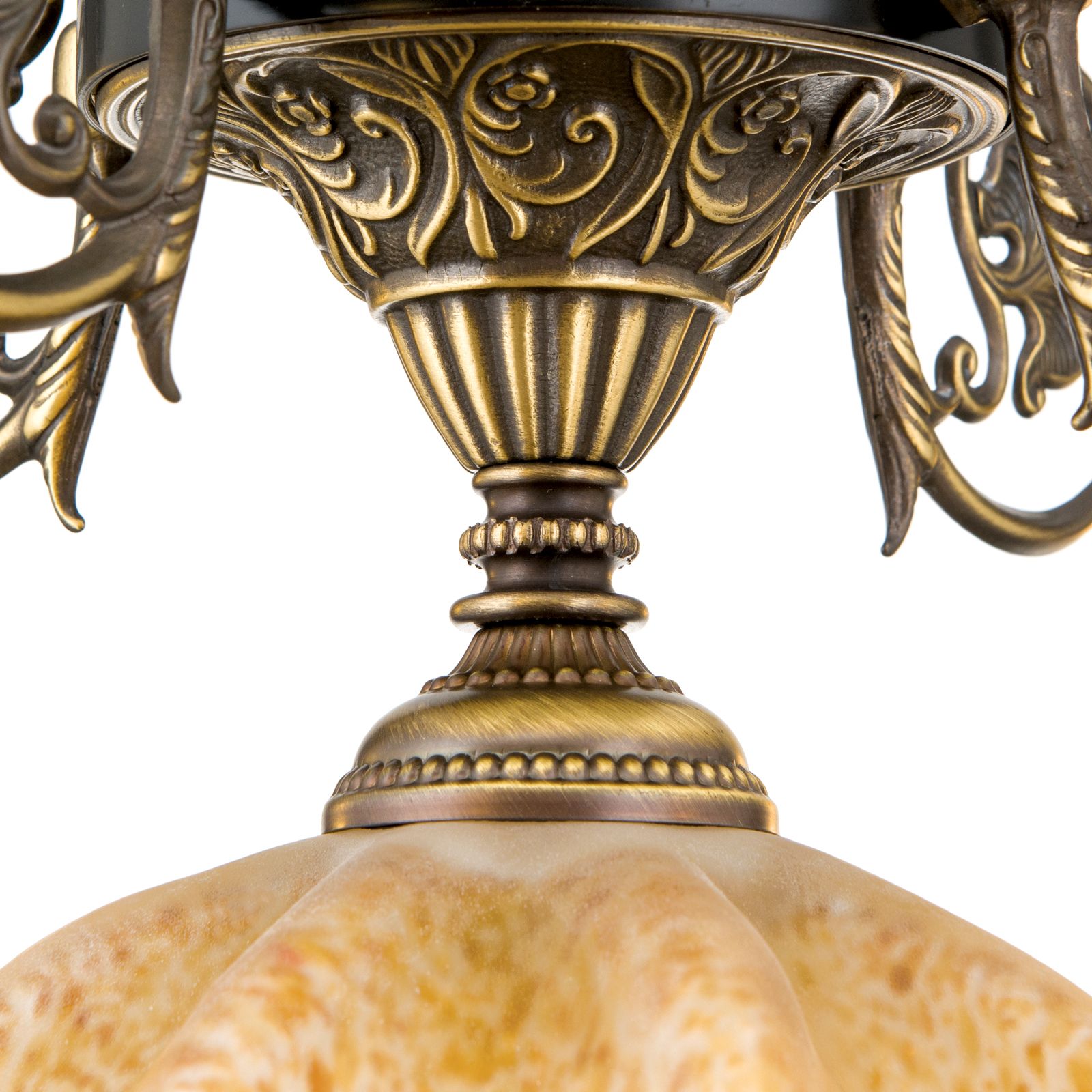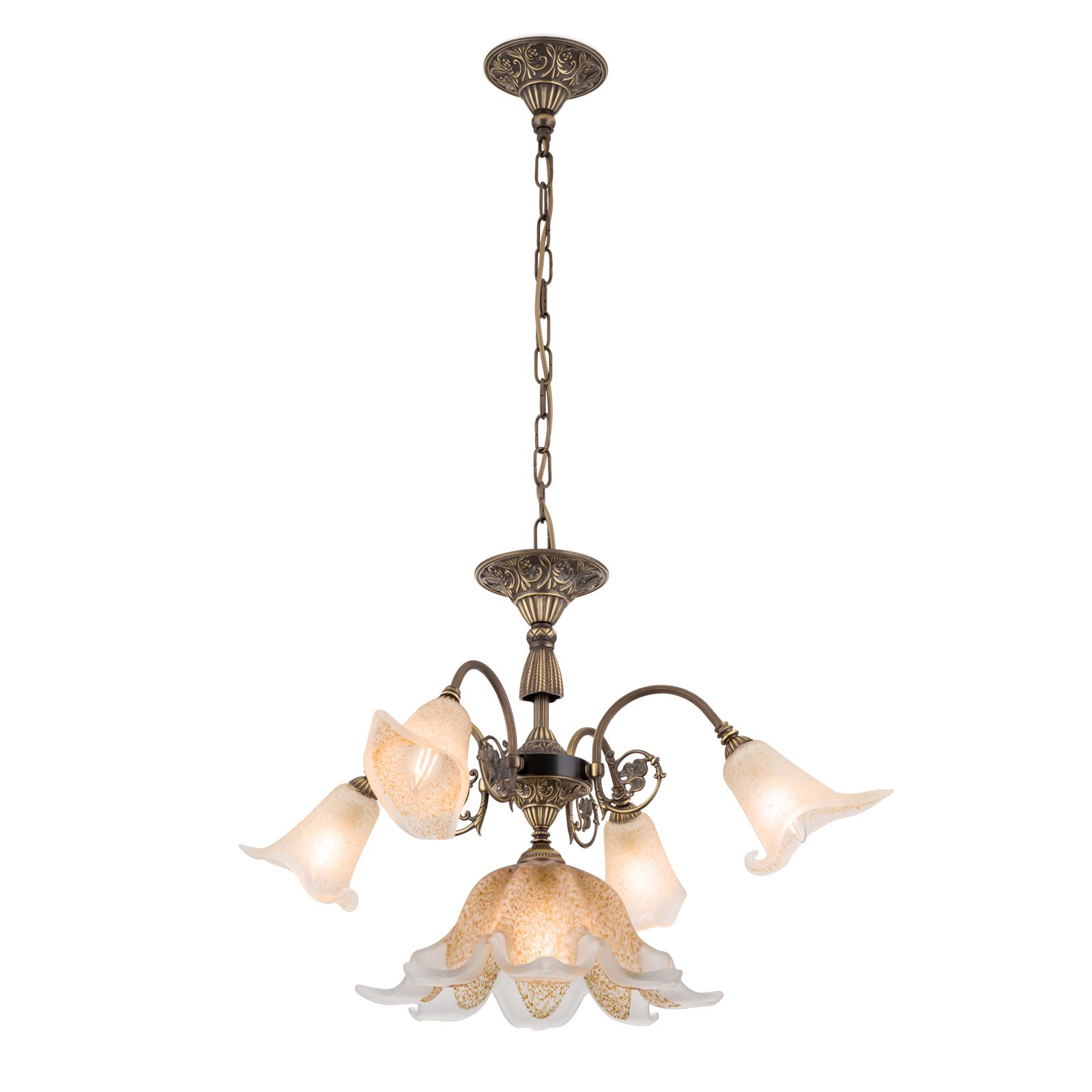 Der 5-flammige Luster aus der TOSCA-Serie ist ideal geeignet, um einem antik-historistischen Interieur eine romantische Note hinzuzufügen, dank seiner kunstvollen Verspieltheit. Das Gestell des Kronleuchters besteht aus Vollmessing und ist in einer Altpatina-Oberfläche gehalten. Die aufwendigen Verzierungen erstrecken sich von Kanneluren über Quasten, Ranken und Blattwerk bis hin zu Voluten auf der Deckenrosette. Ein zentrales, großes Blütenmotiv ziert das Zentrum des Kronleuchters.