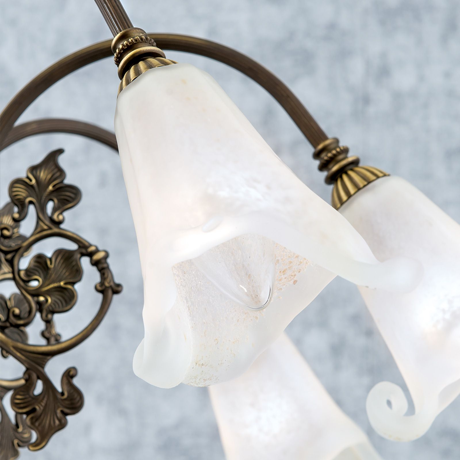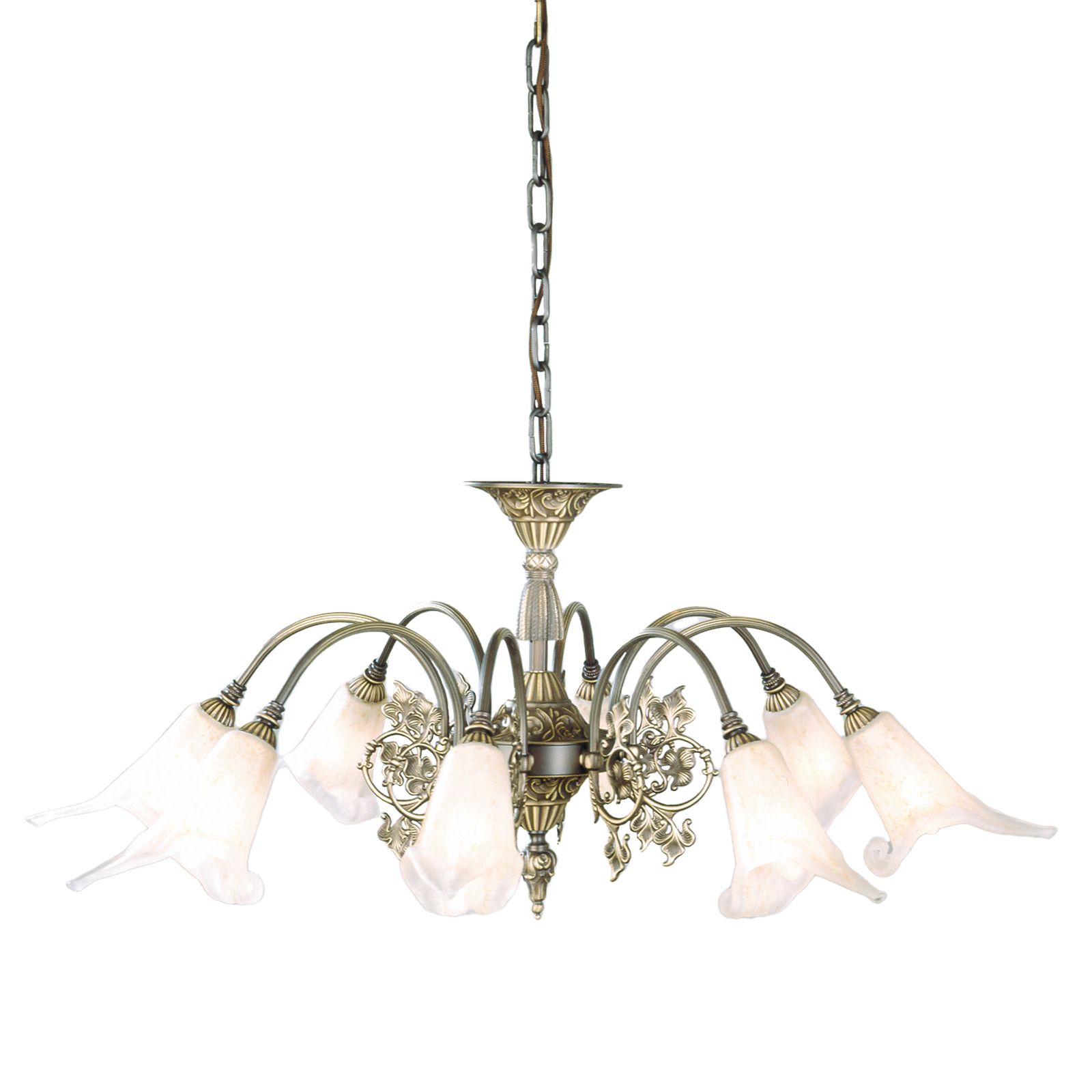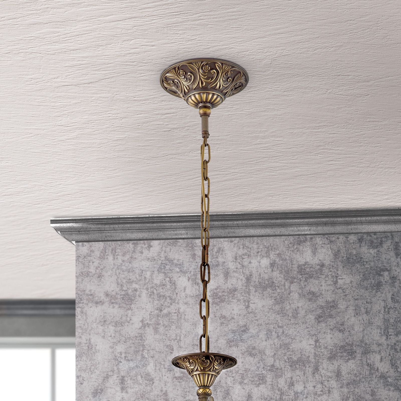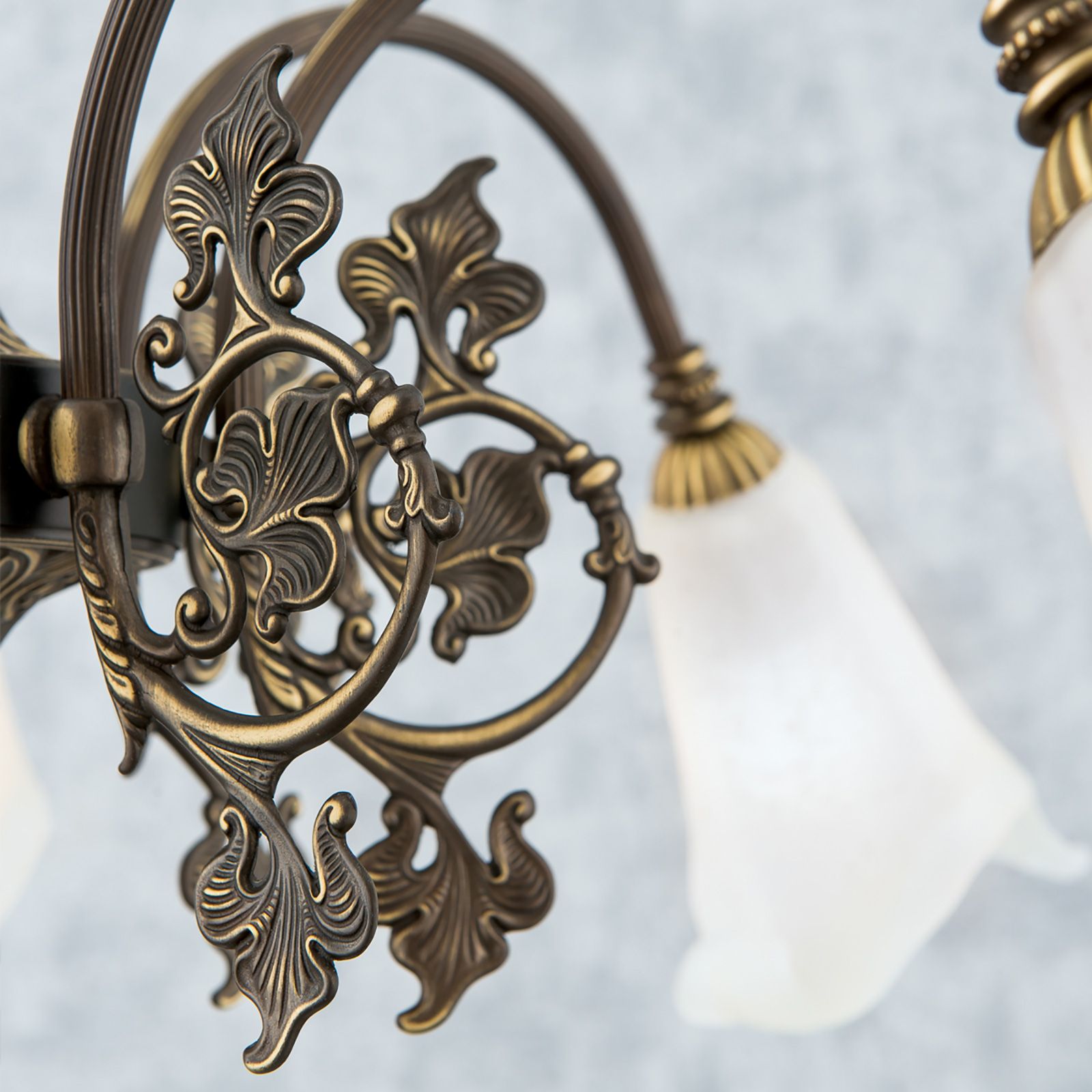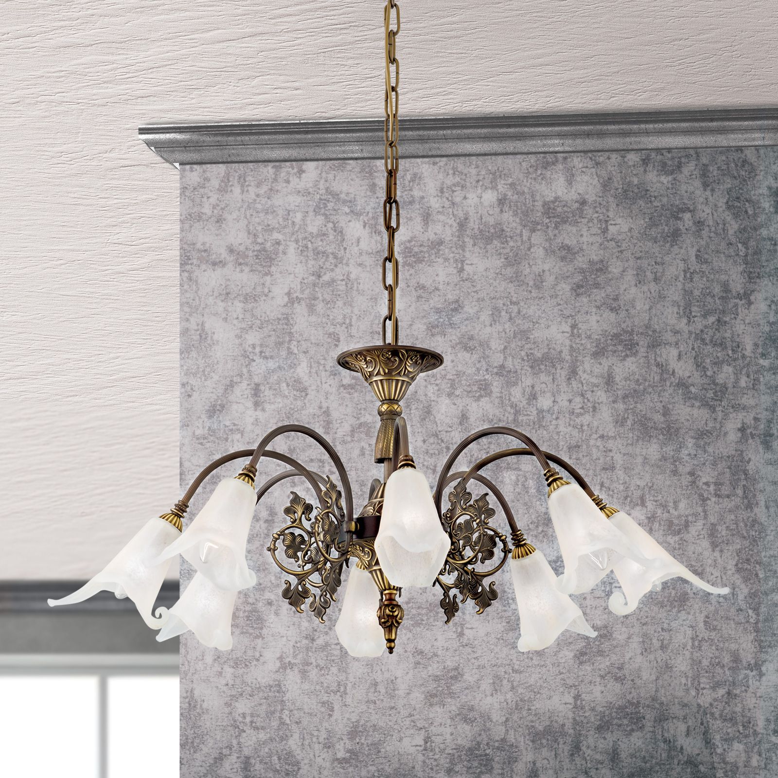 Der 8-flammige Kronleuchter aus der TOSCA-Reihe verspricht eine effektvolle Inszenierung des Lichtes. Acht kunstvoll geschmückte Arme beschreiben einen eleganten Bogen vom zentralen Schaft weg weit in den Raum. An den Enden richten die Lampenschirme in Blütenform ihre Strahlen abwärts in den Raum. Das satinierte Glas der Schirme streut ein weiches, pastelliges Umgebungslicht. Blumen, Blüten, Blattwerk und handschattierte Verzierungen verstärken die barocke Opulenz. Ein hoher Raum im Wohnbereich erfährt mit diesem Luster eine eindrucksvolle Aufwertung. Mit Stuckdeko und Antikmöbeln erhält man ein exklusives Ensemble. Die Leuchte verfügt über acht E14-Fassungen zu je höchstens 40 Watt.