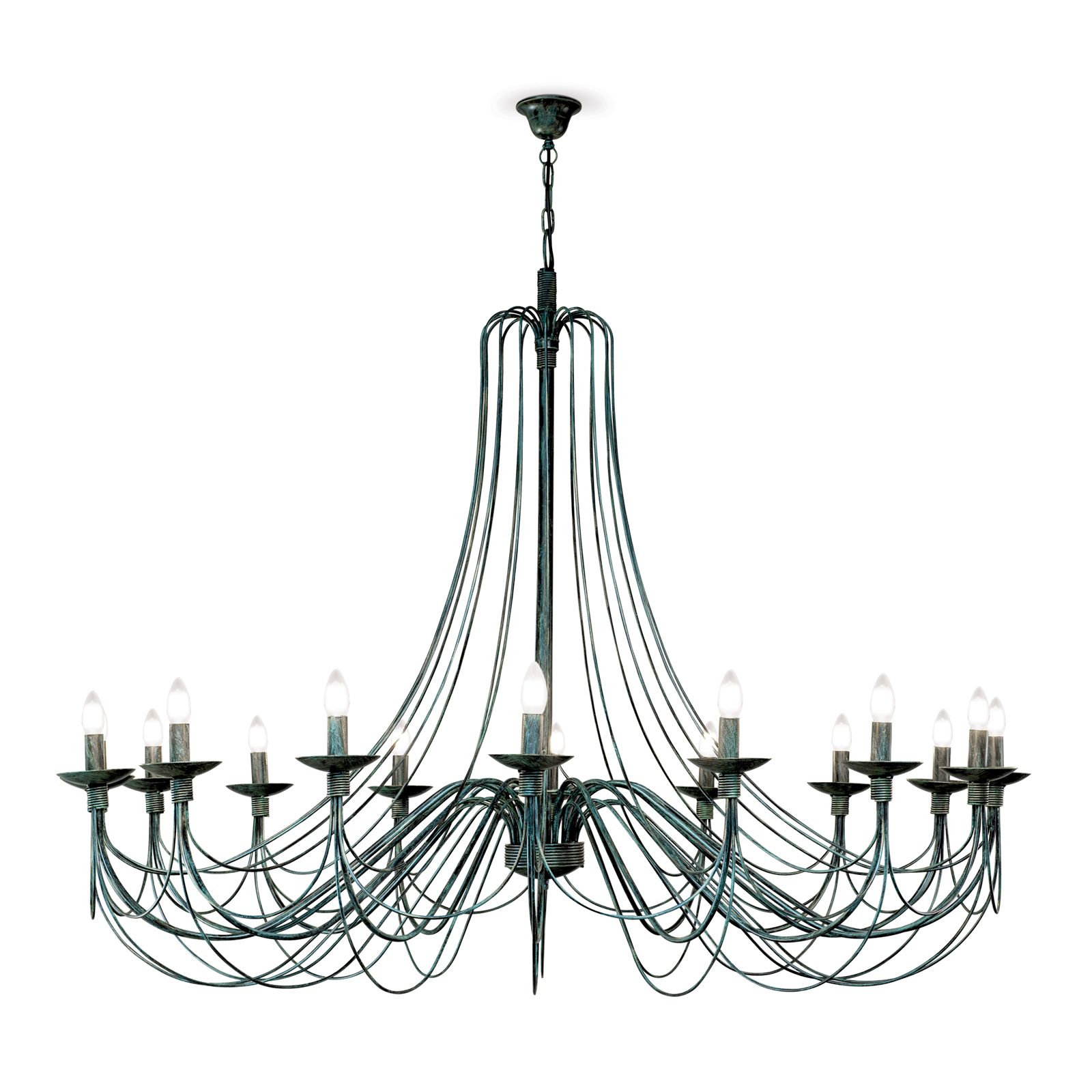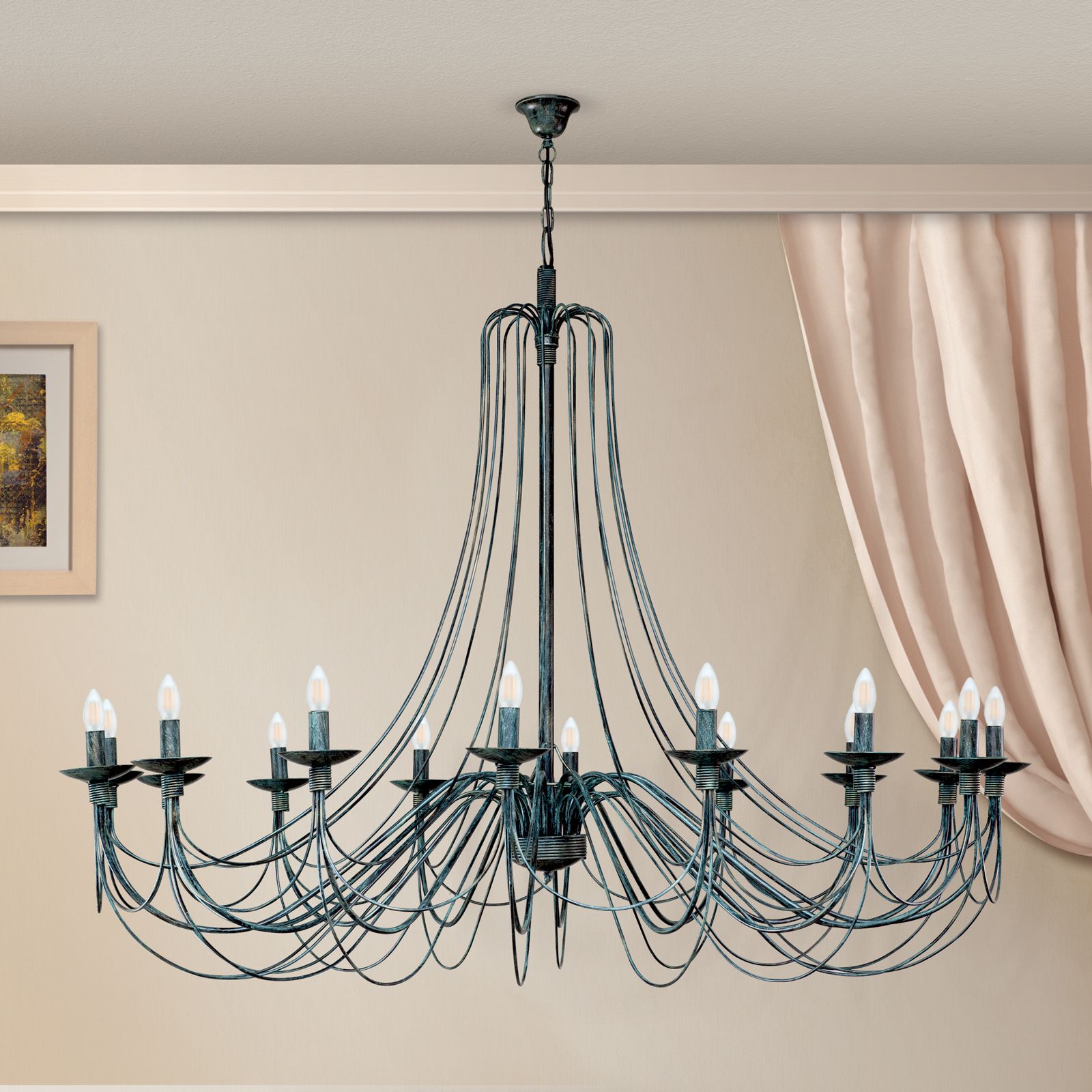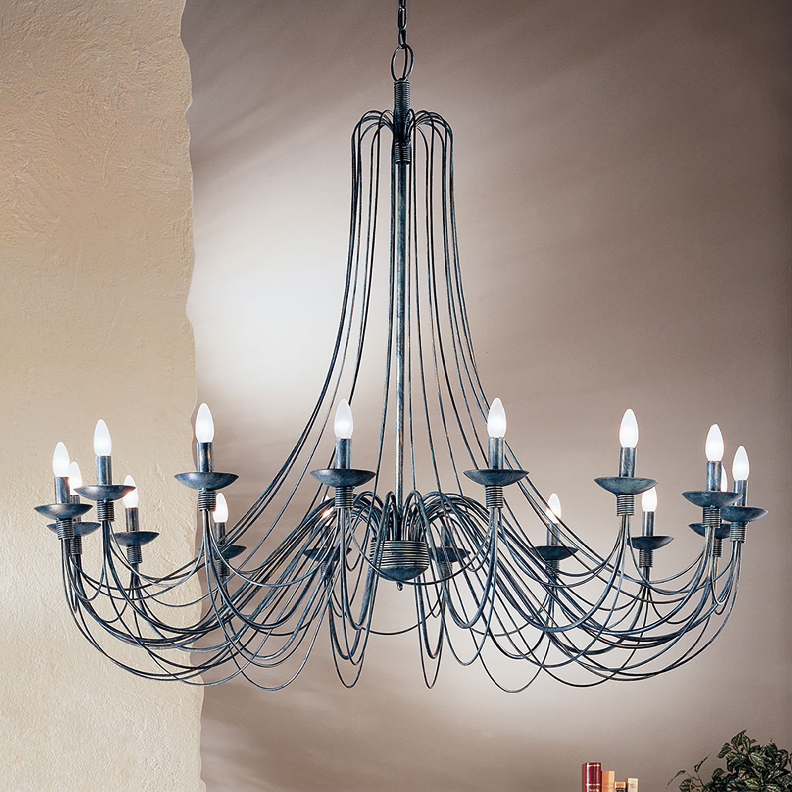 Der 16-flammige Luster aus der VELA-Serie ist eine zeitgemäße Interpretation klassischer Luster. Im Kreis angeordnete Flammen werden schnörkellos über S-Bögen mit dem Schaft verbunden. Dieser strebt empor und ergießt sich in fontänenartigem Schmiedeeisenfiligran zurück zu den Flammen. Es ist eine Art Kreislauf der Linien. Am oberen Ende des Schaftes befindet sich ein Ring, in den eine 250 Zentimeter lange Kette gehakt ist. Sechzehn E-14-Fassungen für je maximal 40 Watt werden ihre Pracht in großen Räumen, bei Festen und Banketts entfalten.