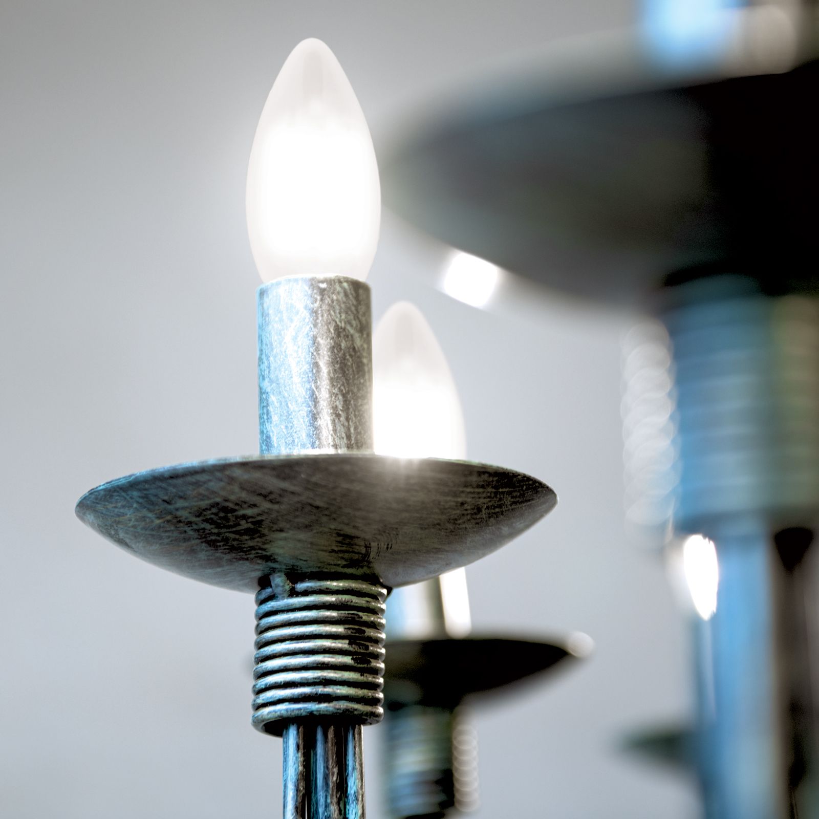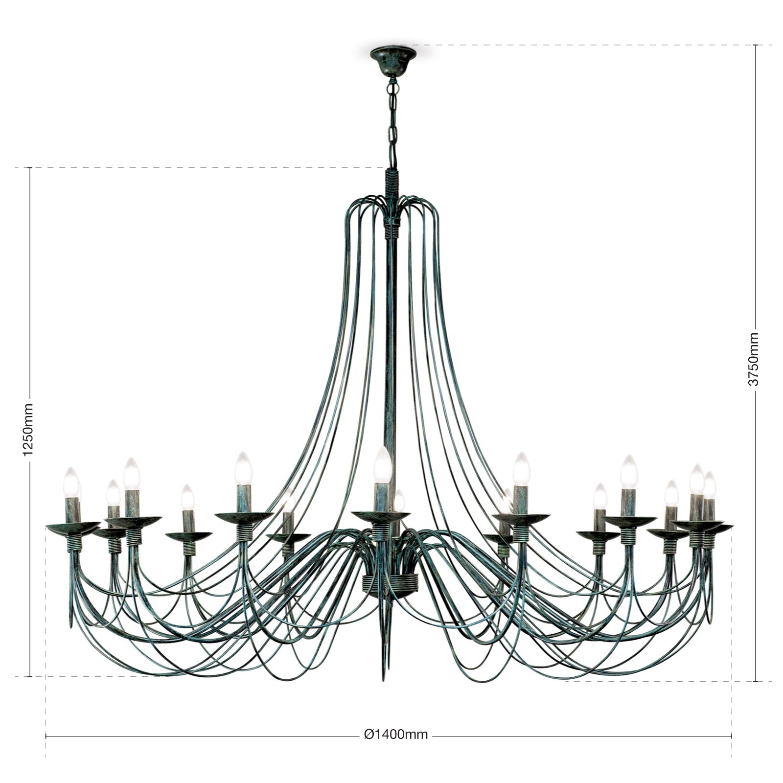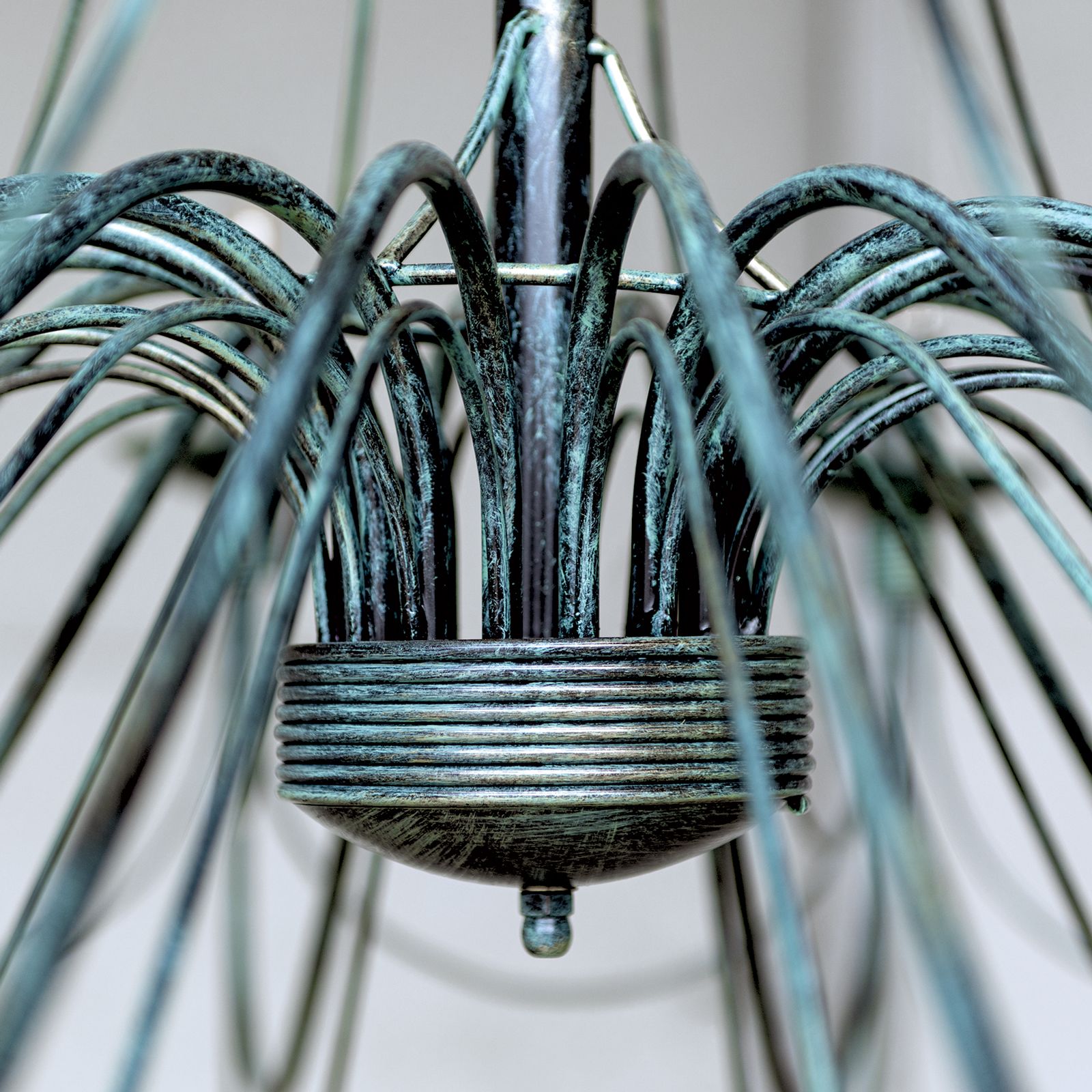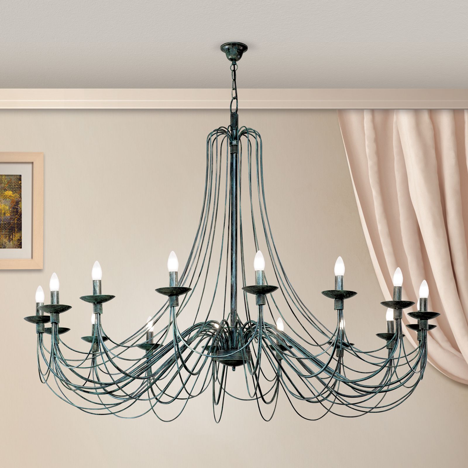 Der 16-flammige Luster aus der VELA-Serie ist eine zeitgemäße Interpretation klassischer Luster. Im Kreis angeordnete Flammen werden schnörkellos über S-Bögen mit dem Schaft verbunden. Dieser strebt empor und ergießt sich in fontänenartigem Schmiedeeisenfiligran zurück zu den Flammen. Es ist eine Art Kreislauf der Linien. Am oberen Ende des Schaftes befindet sich ein Ring, in den eine 250 Zentimeter lange Kette gehakt ist. Sechzehn E-14-Fassungen für je maximal 40 Watt werden ihre Pracht in großen Räumen, bei Festen und Banketts entfalten.