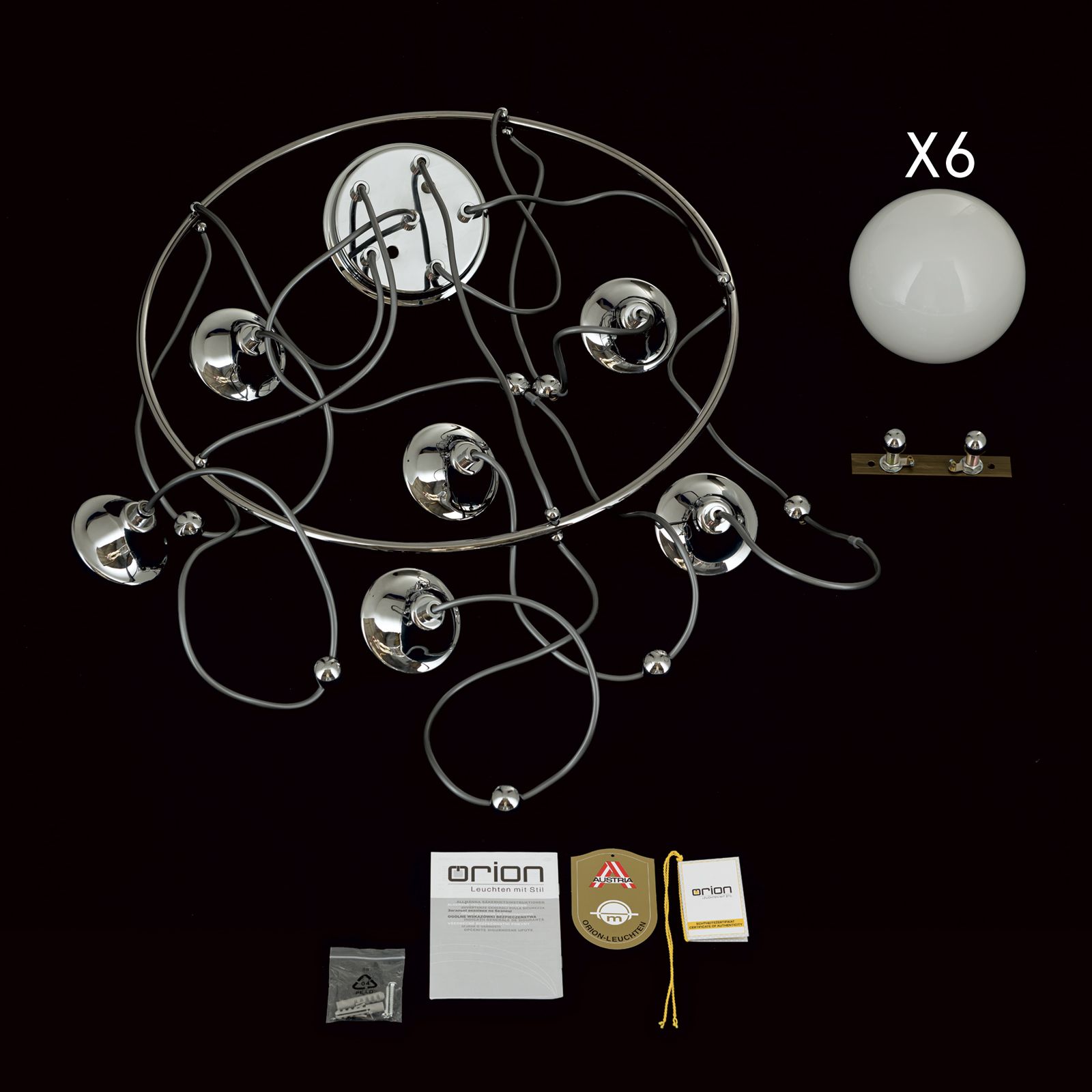 Die Pendelleuchte verfügt über sechs E14-Fassungen. Wenn Sie sich für energieeffiziente LED-Lampen entscheiden, können sie einen bewussten Beitrag zu Umwelt und Klima beitragen.