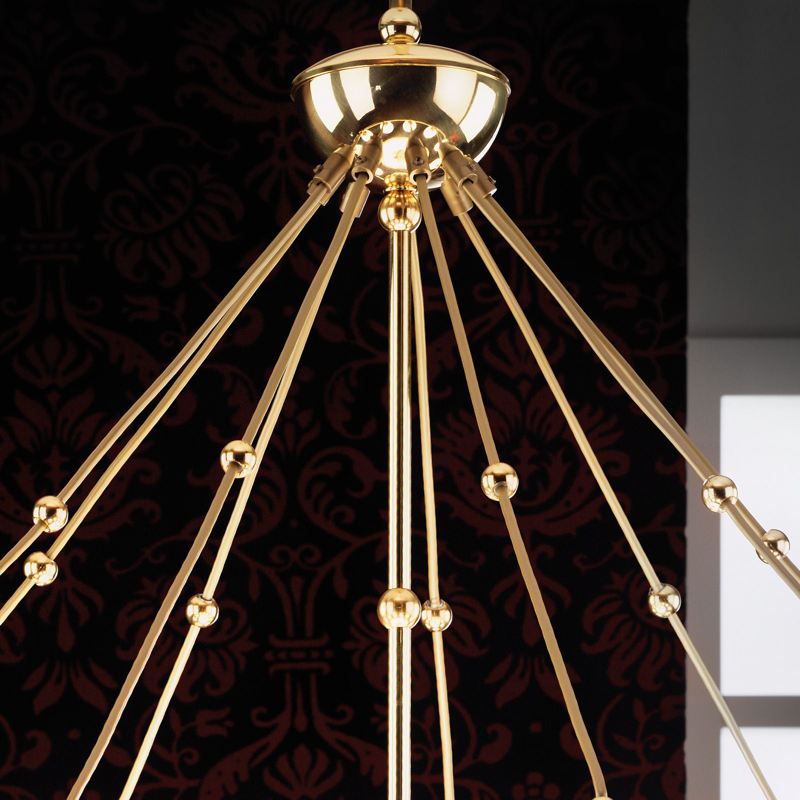 Die Pendelleuchten der Kollektion ALT WIEN sind inspiriert von den ikonischen Brioni Leuchten von Adolf Loos von 1914. Diese interessante Komposition - eine Mischung aus Art déco und moderner Pendelleuchte - setzt einen großen Glasschirm ins Zentrum eines Kranzes aus neun Schirmen. Dadurch entsteht ein ausladender Leuchtkörper mit beachtlichen Maßen: Bei einer Höhe von knapp über einem Meter ergibt der Durchmesser beeindruckende 95 Zentimeter. Das erlaubt die Ausleuchtung von sehr großen, loftartigen Räumen. Die äußeren Schirme werden durch einen schmalen Messingreif verbunden. Ein breites, mit einem Ziergitter versehenes Messingband fasst die große Lichtkuppel ein. Trotz ihrer Dimensionen ist diese Leuchte dezent zurückhaltend in ihrer Wirkung. Die Pendelleuchte ist mit neun E14-Fassungen für je bis zu 40 Watt und drei E27-Fassungen zu je maximal 60 Watt ausgestattet.