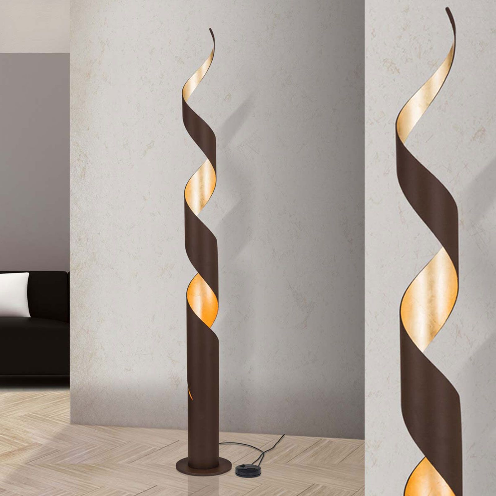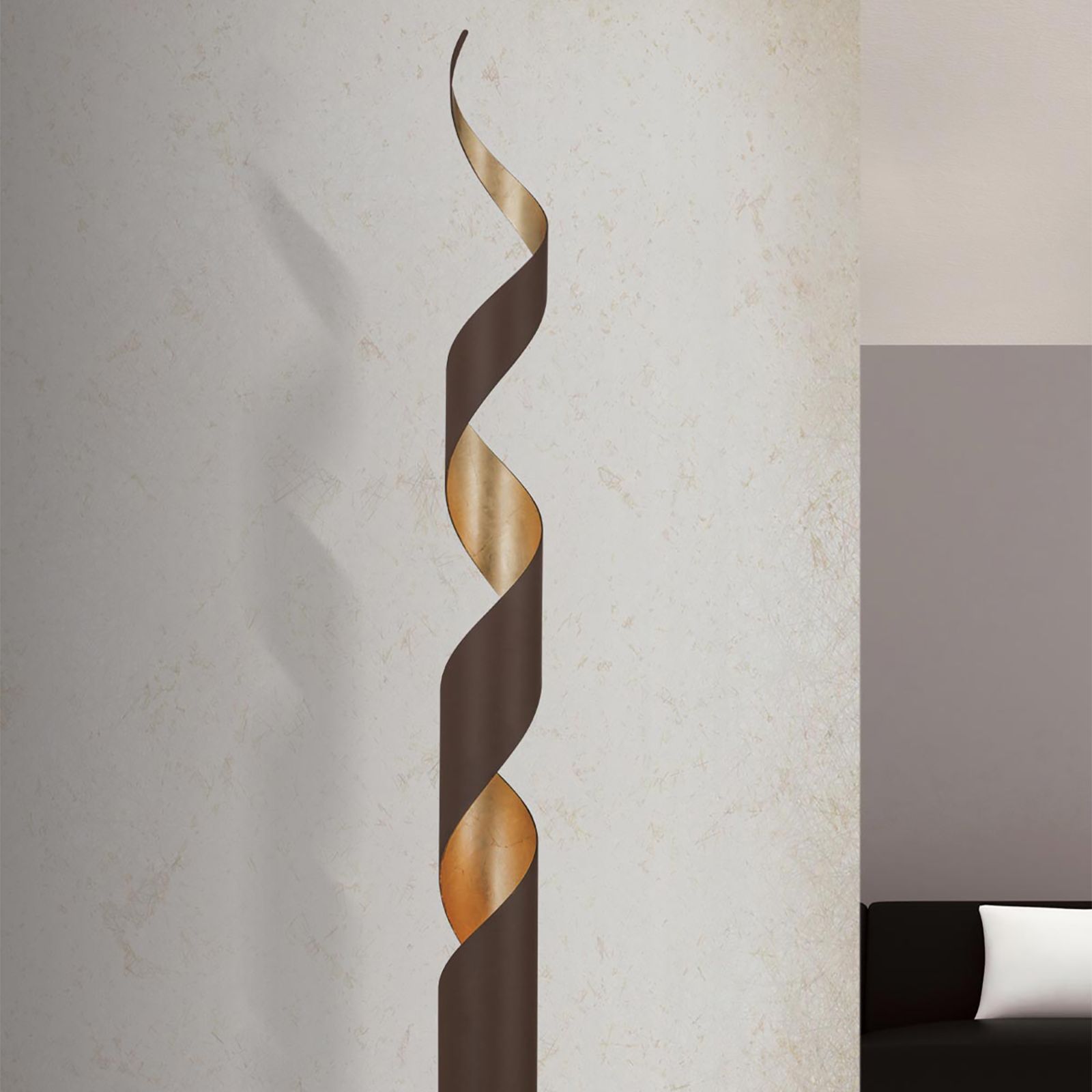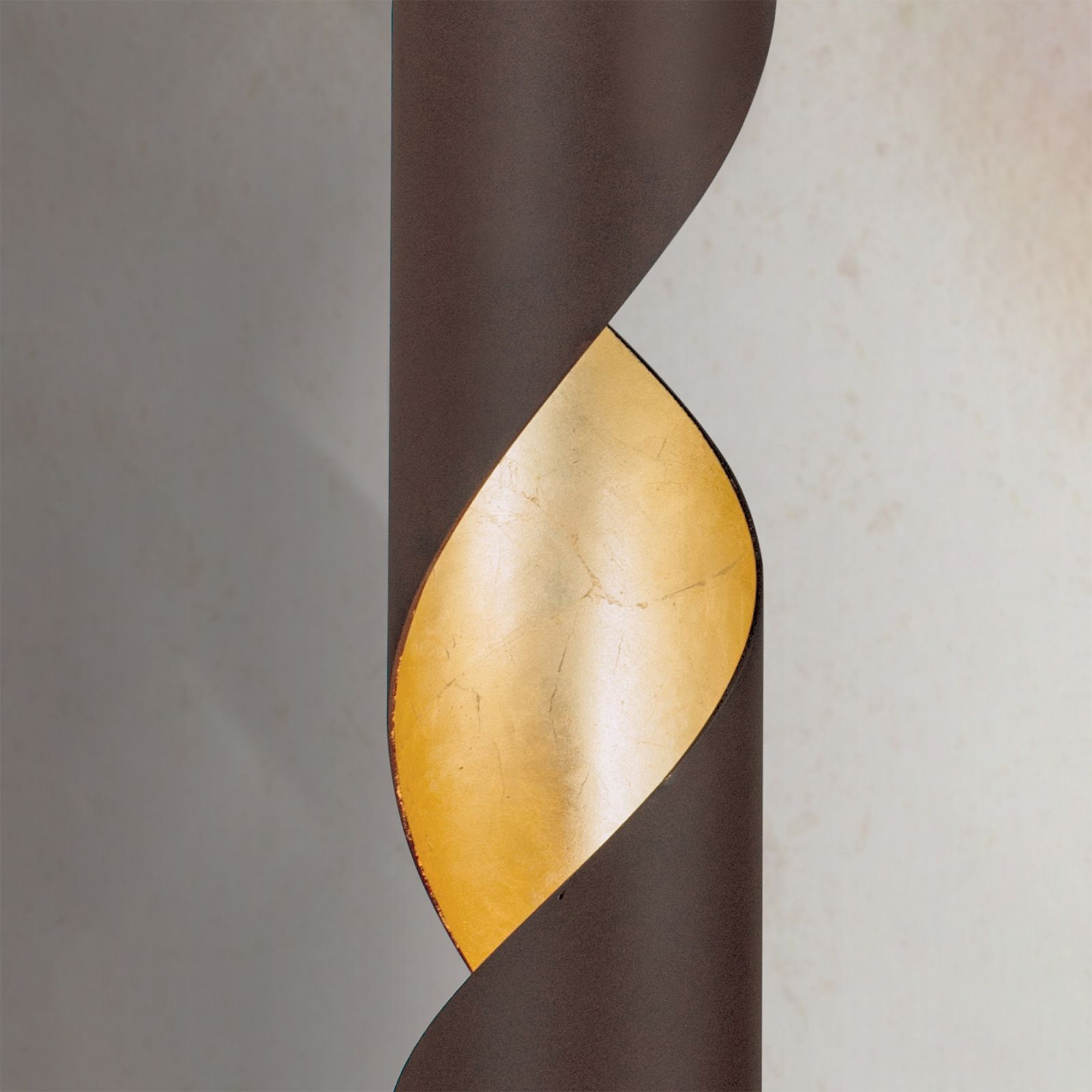 Ein unverkennbares Design mit 2 Metern Höhe prägen die Stehlampe ELIANO. Der von außen in mattem braun gehaltene Stahl schwingt sich gedreht nach oben, während auf der Innenseite strukturiertes Blattgold für einen strahlenden Akzent sorgt. So haucht das Licht den warmen Erdtönen neues Leben ein und erweckt die feurige Komponente von ELIANO.