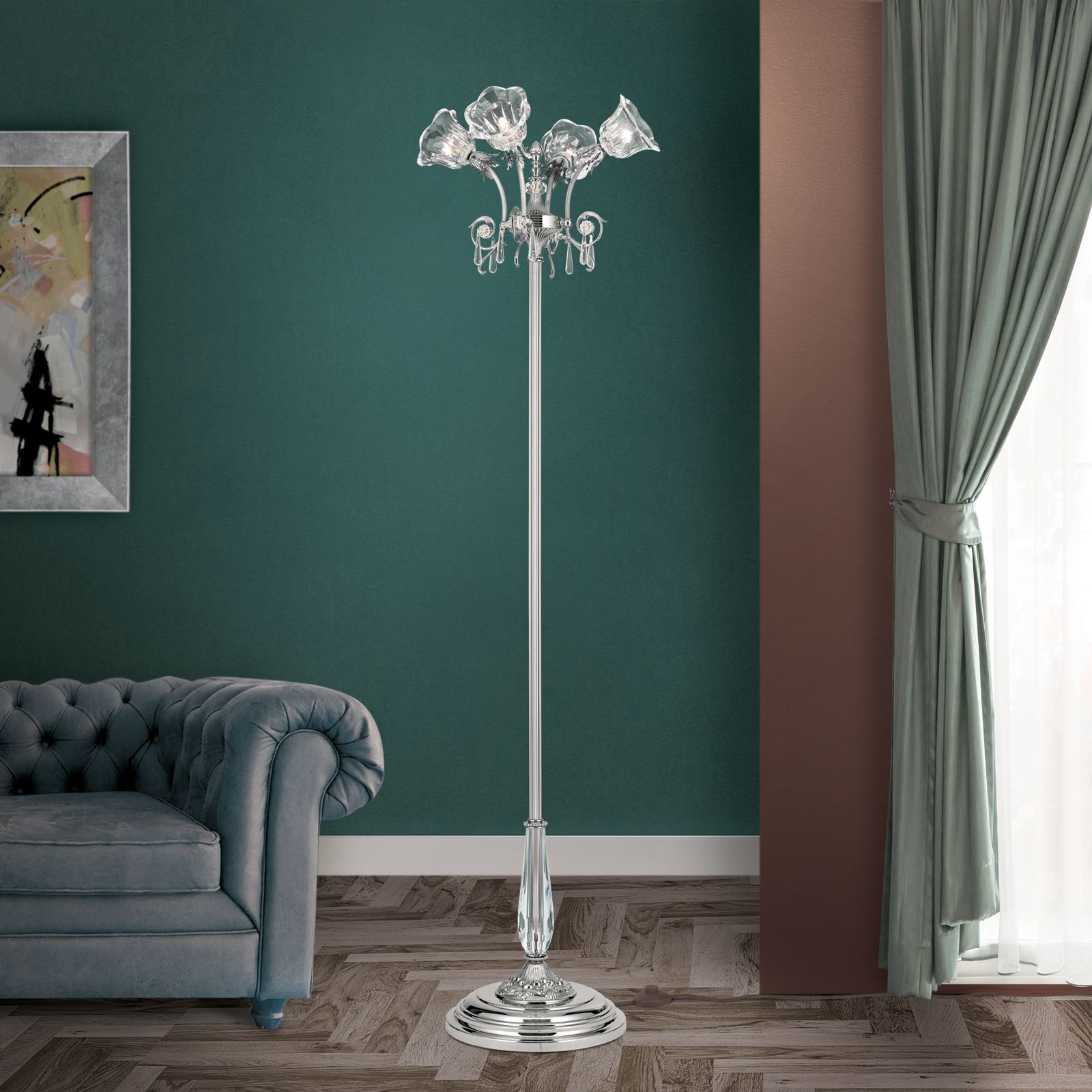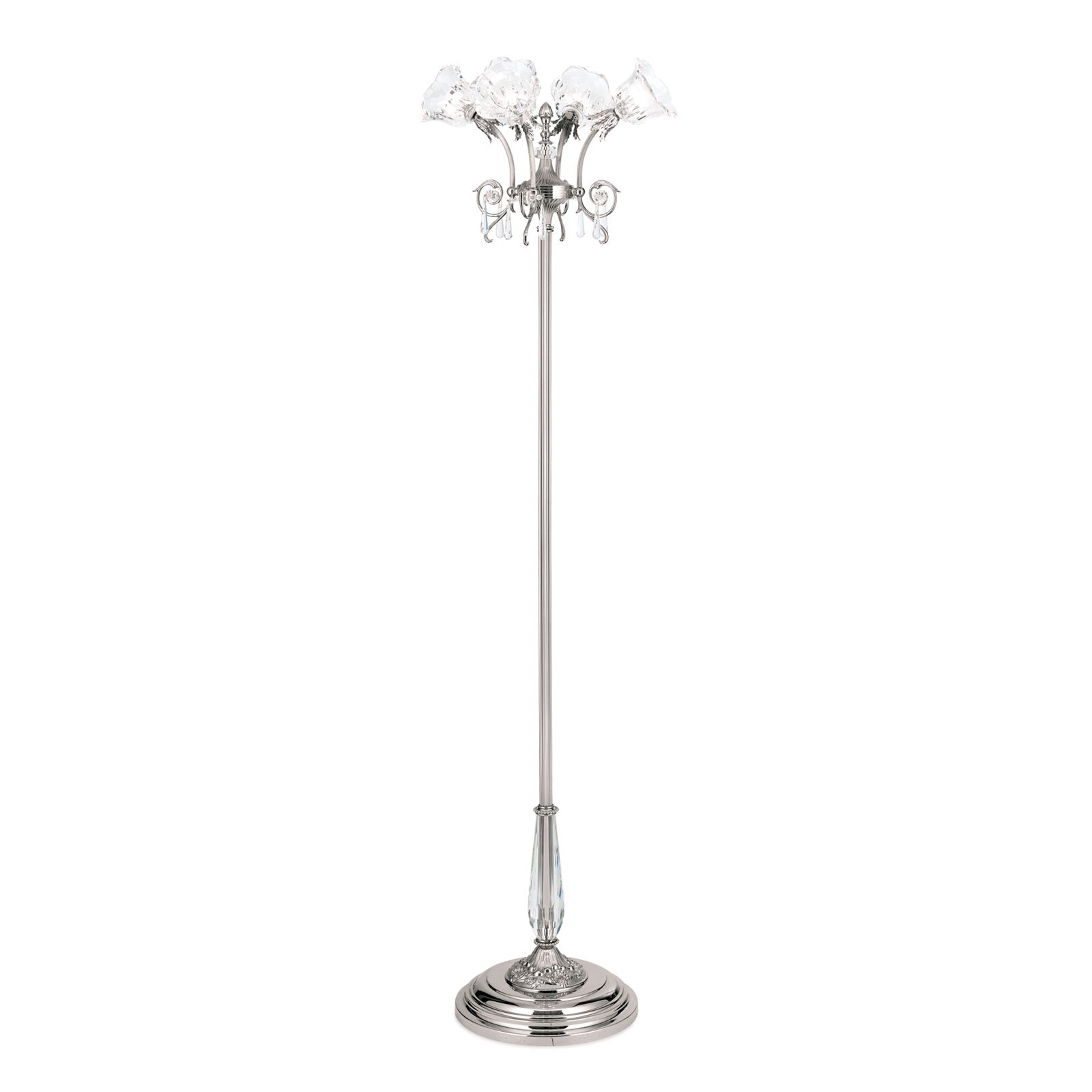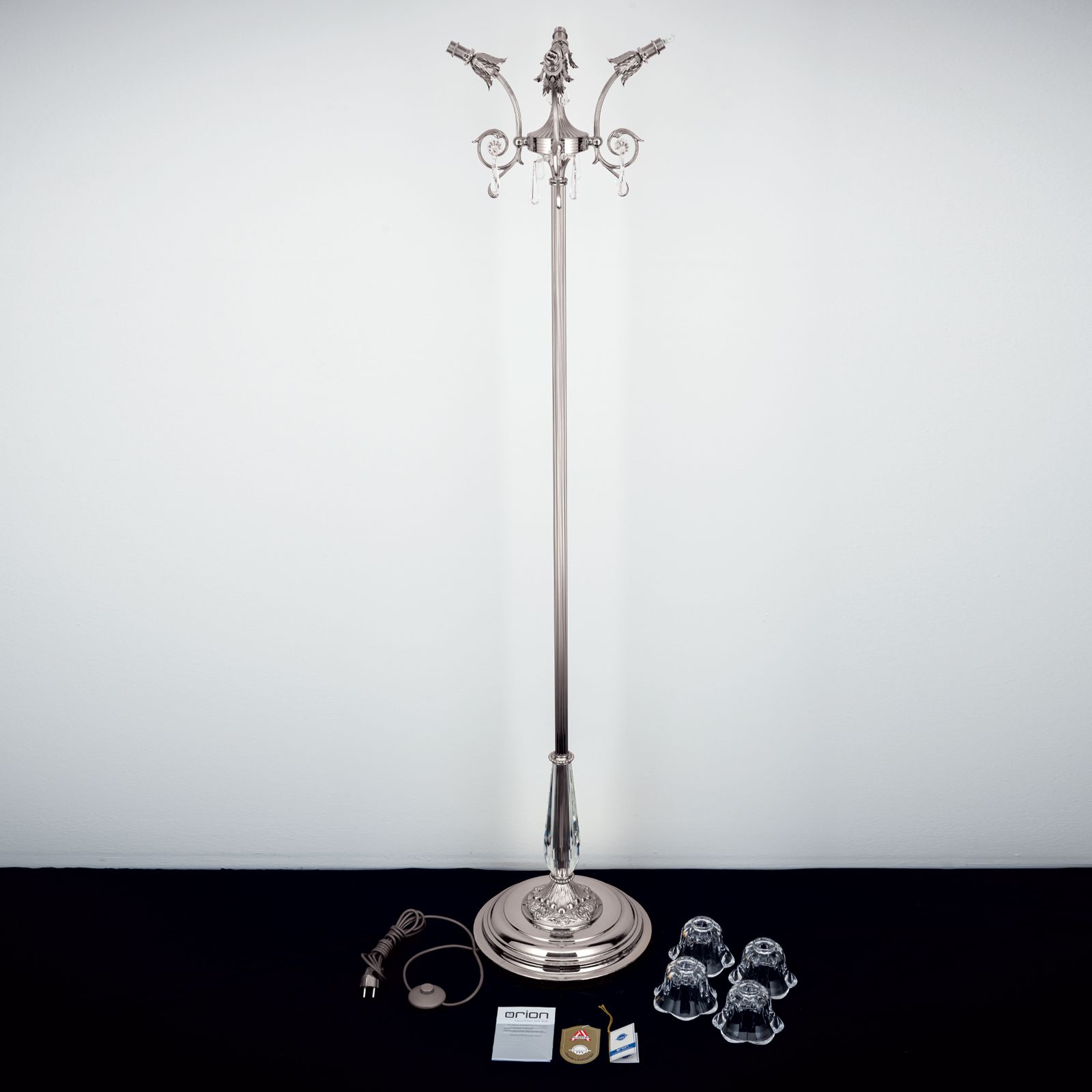 Das kannelierte Gestell ist aus Vollmessing gefertigt. Der solide Standfuß ist mit einem prächtigen Kristalltropfen, der die Stange einschließt, versehen. Die schwungvollen Arme strecken sich schräg Richtung Decke empor und sind mit tropfenförmigen 1A Vollschliff Kristallglas bestückt, die für zusätzliches Glitzern sorgen. Der tulpenförmige Schirm besteht aus klaren Kristallglas, welcher durch die an den Armen altsilbernen Akanthusblätter noch mehr an eine Blüte erinnert. Vollendet wird das Design mit einer formschönen Säule, die ebenfalls von einem Kristall ergänzt wird.
