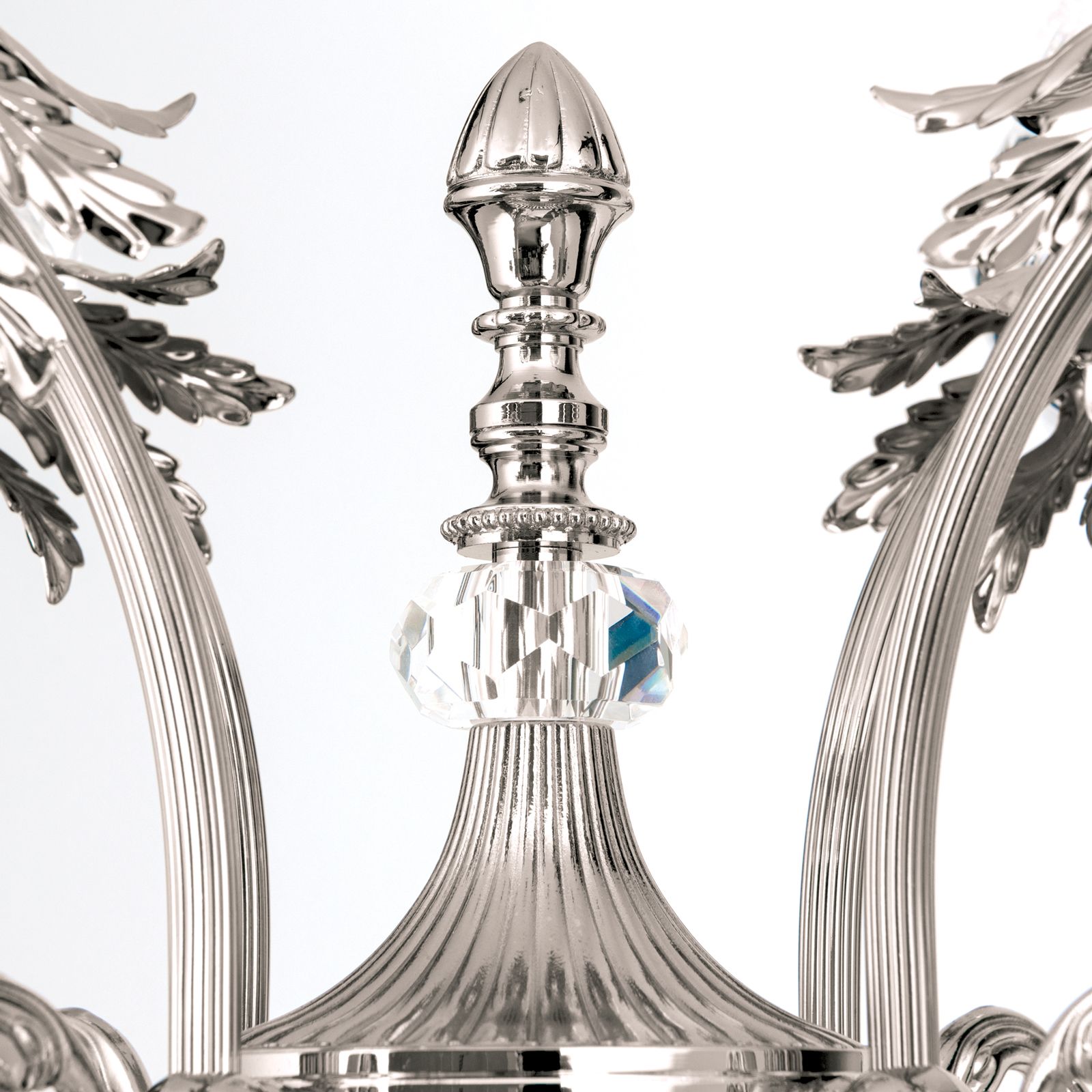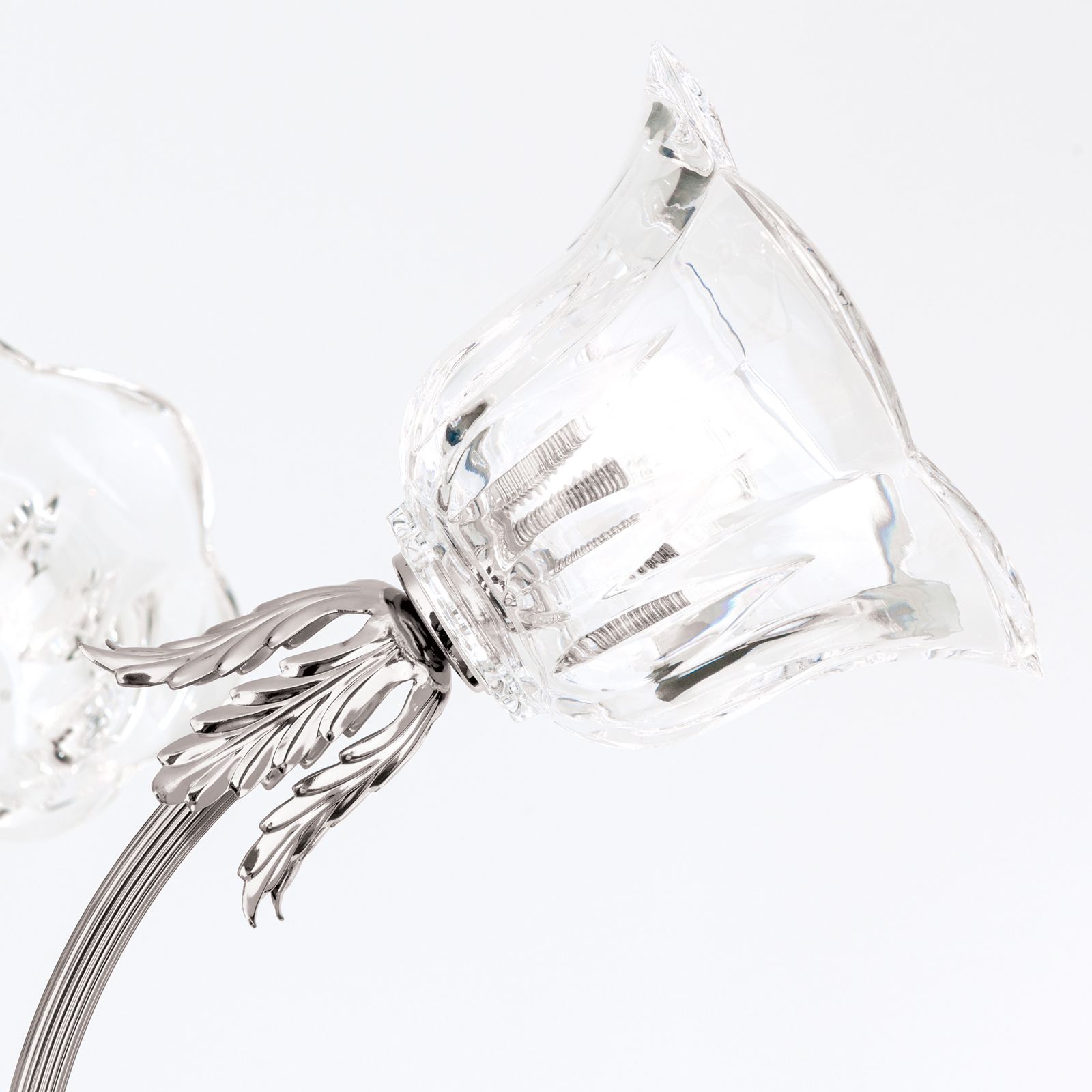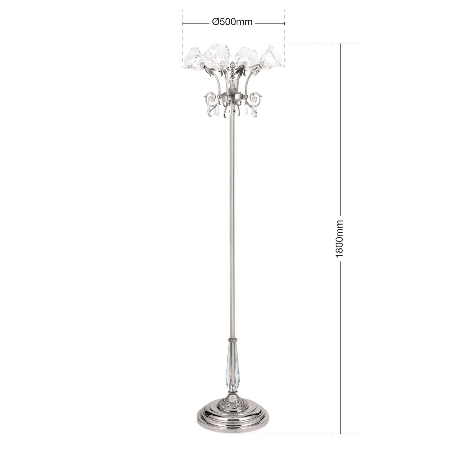 Das kannelierte Gestell ist aus Vollmessing gefertigt. Der solide Standfuß ist mit einem prächtigen Kristalltropfen, der die Stange einschließt, versehen. Die schwungvollen Arme strecken sich schräg Richtung Decke empor und sind mit tropfenförmigen 1A Vollschliff Kristallglas bestückt, die für zusätzliches Glitzern sorgen. Der tulpenförmige Schirm besteht aus klaren Kristallglas, welcher durch die an den Armen altsilbernen Akanthusblätter noch mehr an eine Blüte erinnert. Vollendet wird das Design mit einer formschönen Säule, die ebenfalls von einem Kristall ergänzt wird.