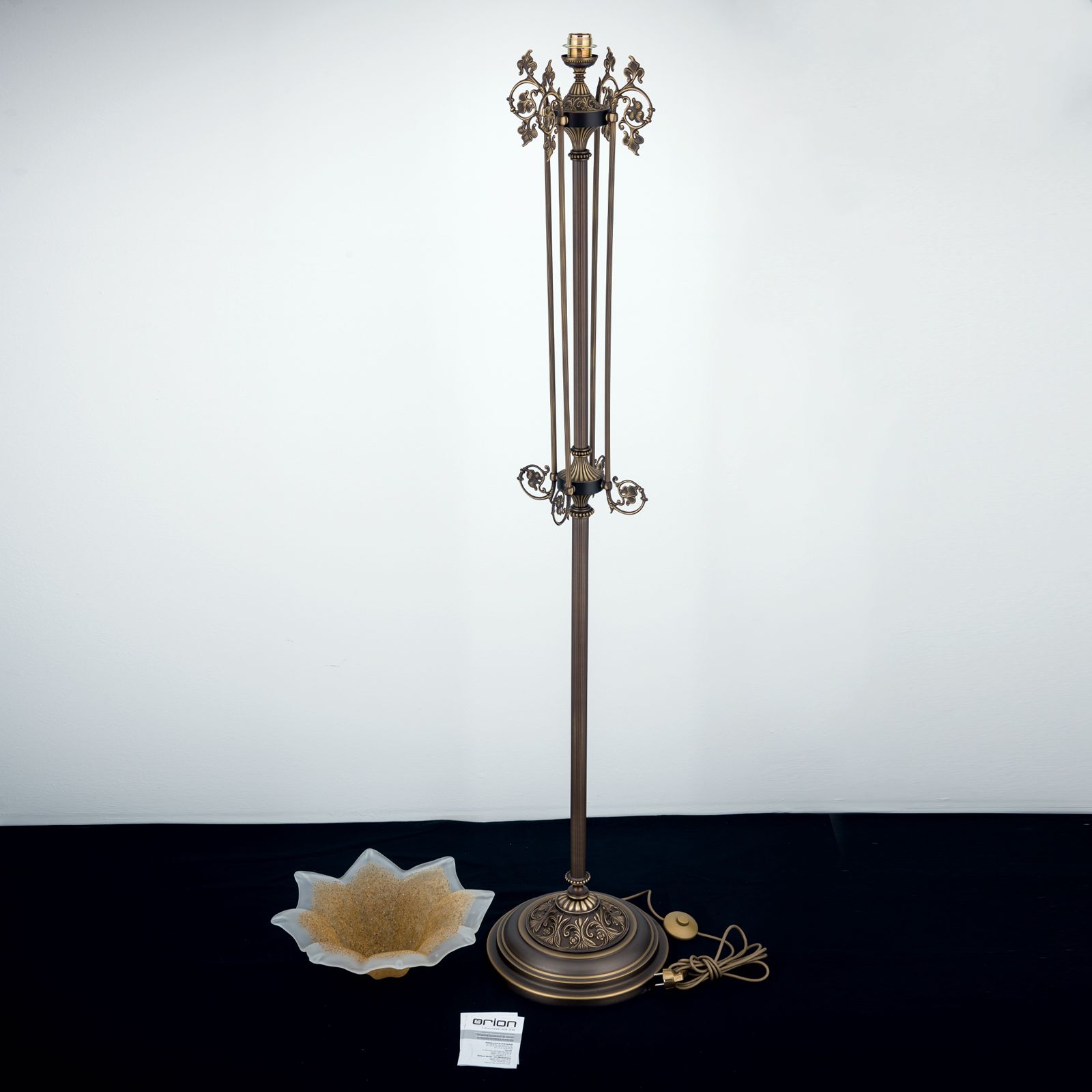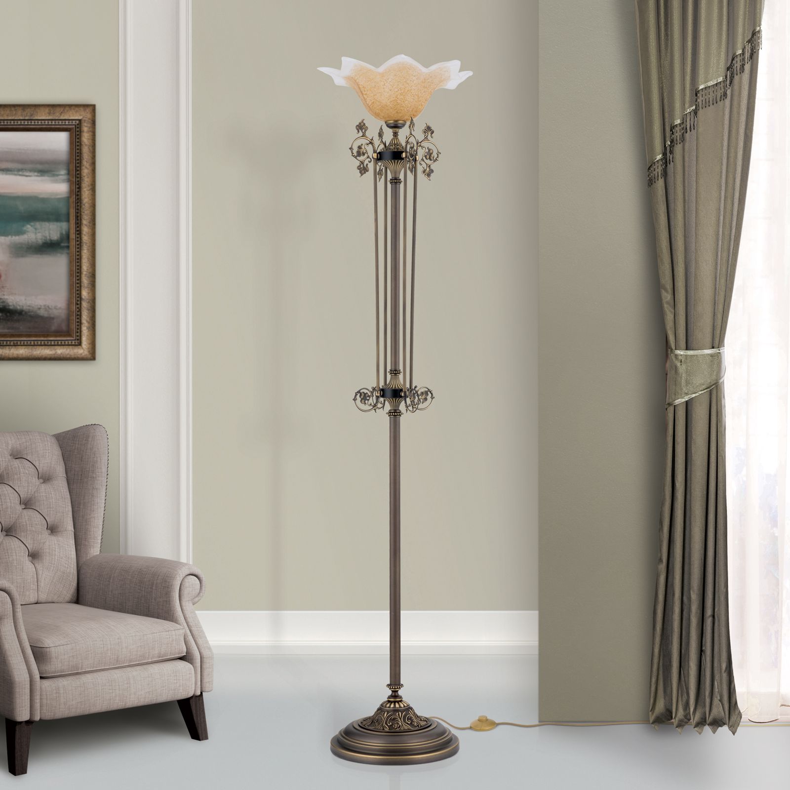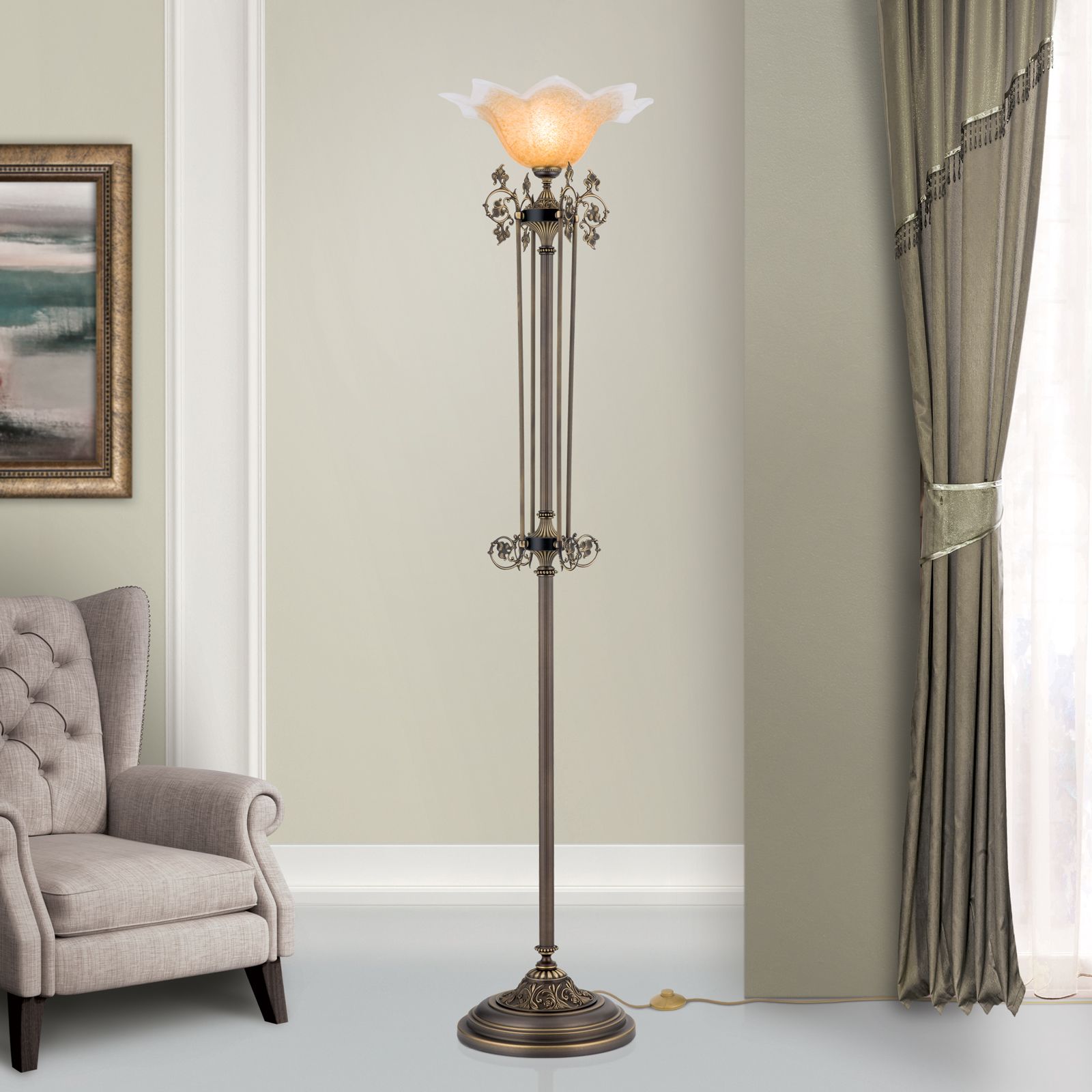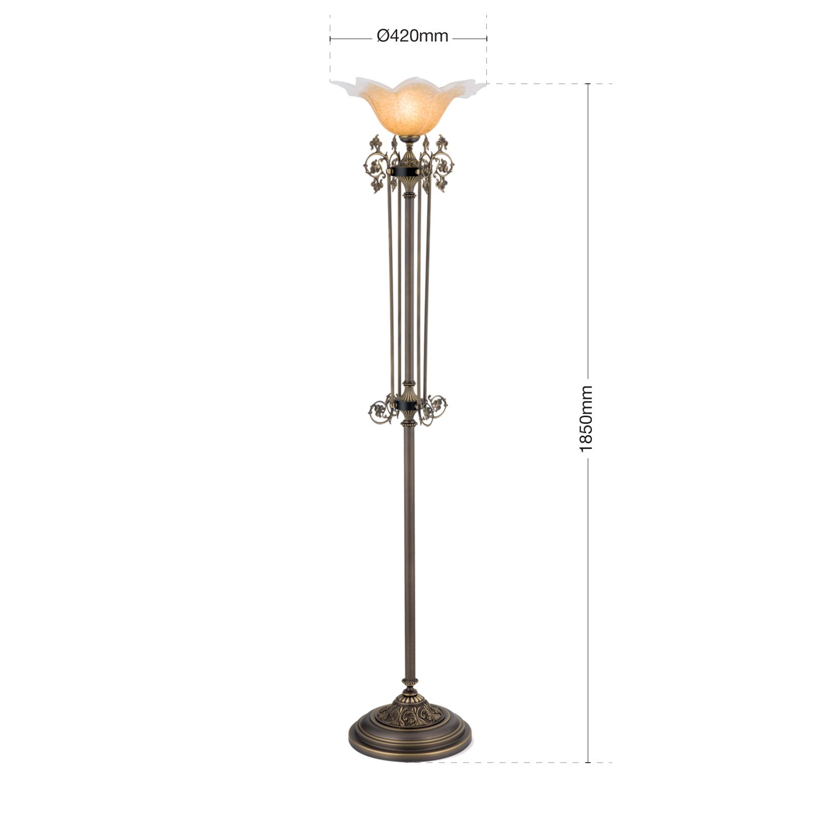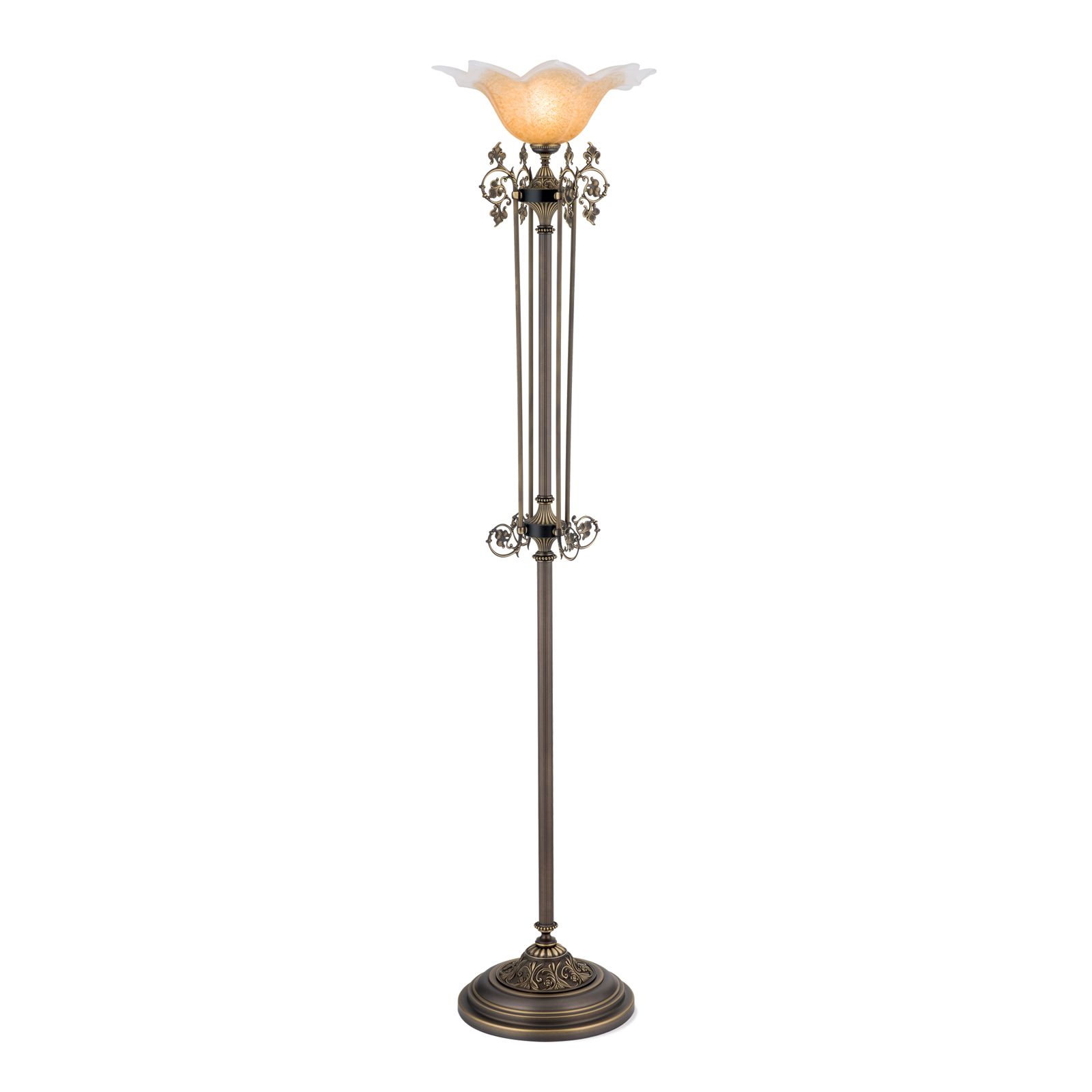 Die Stehlampe aus der TOSCA-Kollektion ist eine traumhafte Inszenierung von Romantik und Schönheit. Die kannelierte, elegant-schlanke Säule wird flankiert von vier filigranen Spangen mit Voluten, Rank- und Blattwerk. Das Aufwärtsstreben der Komposition kulminiert in einer sich zur Decke öffnenden Blüte aus satiniertem Glas. Das Licht verteilt sich schwerpunktmäßig nach oben, gibt aber gleichzeitig durch den matten Schirm ein weiches Umgebungslicht an den Raum ab. Diese Stehlampe setzt einen verträumten Gestaltungsakzent in Antikmöbelensembles. Neben einem Sofa, Fauteuil oder in einem Raumbereich, den man besonders hervorheben will, wird diese Leuchte beste Figur machen. Die Stehlampe verfügt über eine E27-Fassung für bis zu 60 Watt.