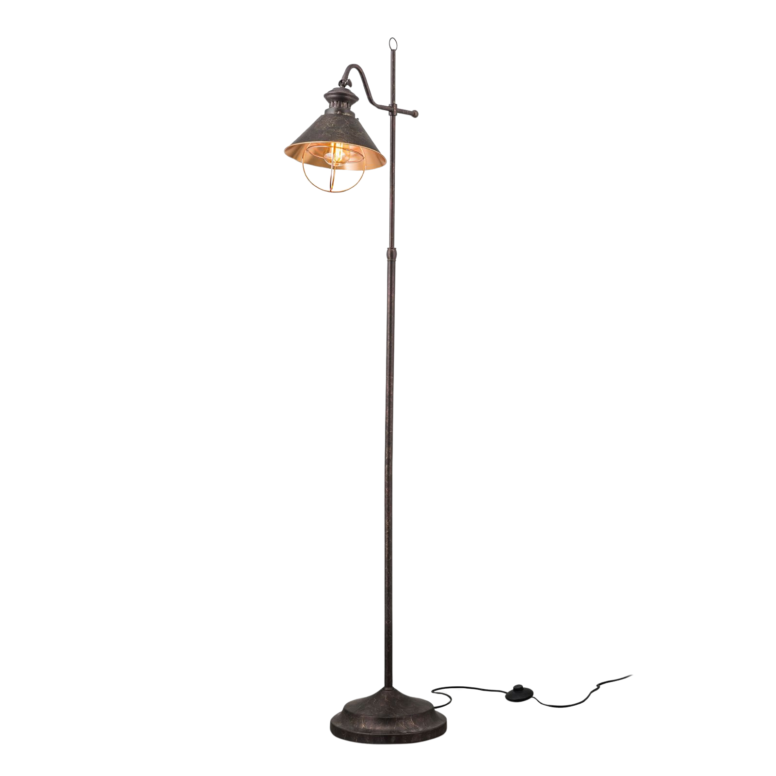 Für eine optimale Ausleuchtung sorgt der neigbare Kopf, welcher sich rasch und problemlos einstellen lässt. Das Highlight der Leuchte ist jedoch der Schirm selbst. Eine Kombination aus Kupferschwarz und Kupfer macht sie zu einem wahren Designobjekt. Dabei sorgt die Innenwand für eine schimmernde und warme Lichtwirkung. Das rustikale Design wird durch ein kupferfarbenes Drahtgestell unterstützt, das das Leuchtmittel umgibt. Um die Reize dieser wunderbaren Leuchte voll und ganz auszuschöpfen, wird ein Leuchtmittel im Filament-Look empfohlen. Die Leuchte ist mit einer E27-Fassung versehen und kann mit maximal 60 Watt bestückt werden. Mit einem Fußtretschalter lässt sie sich komfortabel ein- und ausschalten.