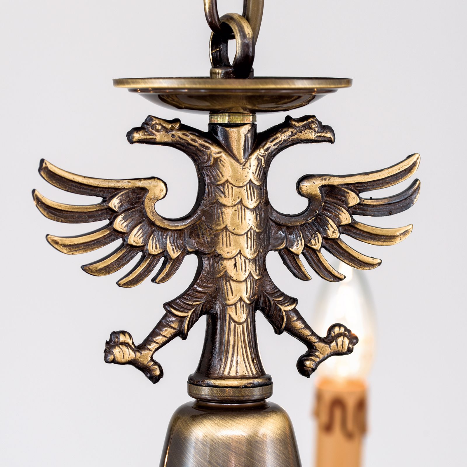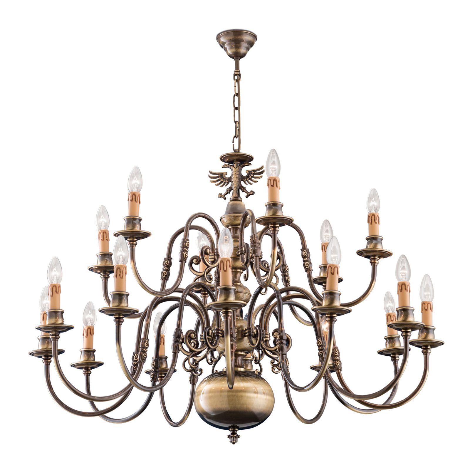 Der 18-flammige Kronleuchter aus der FLÄMISCH-Reihe macht seinem Namen alle Ehre: Ein am Schaftende aufgesetzter Doppeladler krönt den formvollendeten Luster. Zwei Lichterkränze - in der unteren Reihe zwölf Flammen, in der oberen deren sechs - gehen vielarmig in den Leuchtkörper über. Von der stiltypischen Kugel ragt eine vielfach gegliederte Säule auf, gekrönt von oben erwähntem Adler. Ein geräumiges Wohnzimmer mit Stilmobiliar ist der richtige Ort für diese Pracht. Der Kronleuchter liefert über 18 E14-Fassungen mit je bis zu 40 Watt genügend Leistung für eine festliche Beleuchtung.