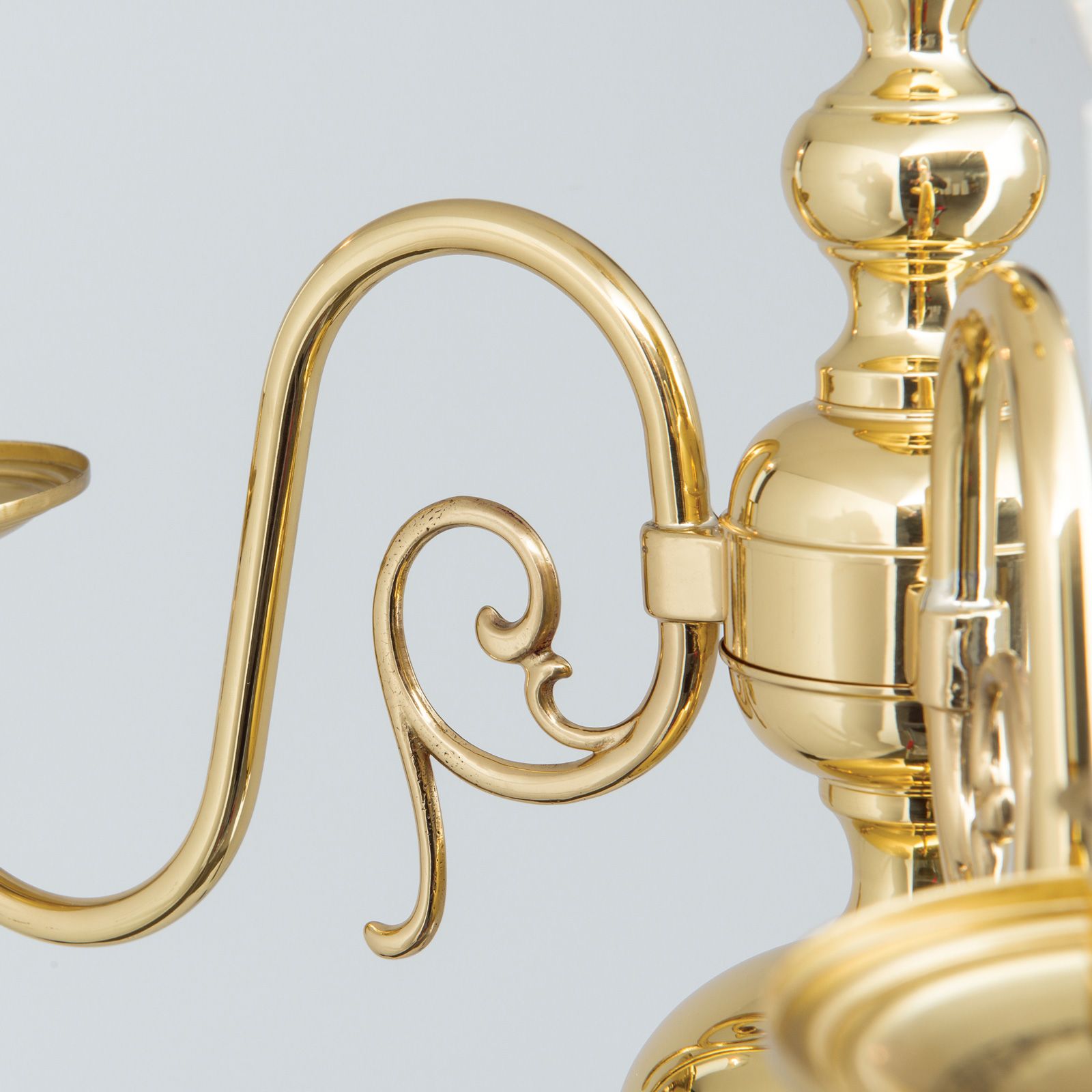 Der 3-flammige Kronleuchter aus der Reihe FLÄMISCH hat genau die richtigen Dimensionen und die nötige Lichtkapazität, um einen kleinen Raum, etwa ein Schlafzimmer, zu beleuchten. Die drei Flammen erzeugen eine heimelige, intime Stimmung, der Messingkörper mit seinen feingliedrigen Armen spielt mit den Lichtreflexen. Entschließt man sich zum Einsetzen von Windstoßlampen, begibt man sich atmosphärisch auf eine Zeitreise in die Epoche eines Rubens, Vermeer oder Rembrandt. Eine Einrichtung mit warmen Farbtönen viel Holz und Stoff, wird durch diesen Luster hervorragend ergänzt. Der Stilluster liefert mit drei E14-Fassungen je bis zu 40 Watt.
