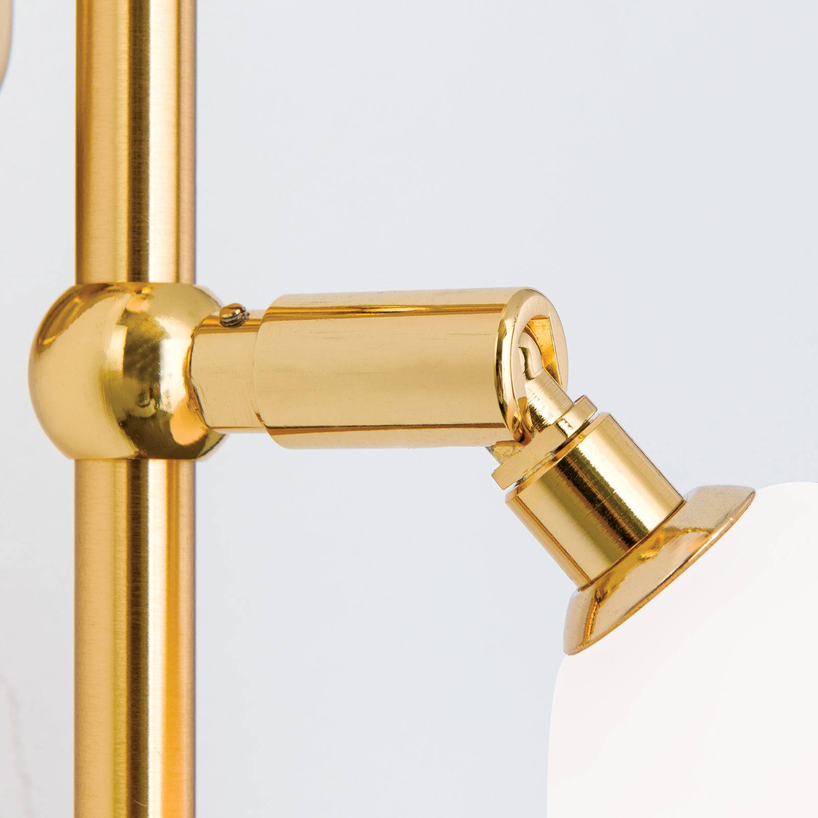 Der Opalglasschirm sorgt zudem für eine weiche und homogene Verteilung des Lichts. Aufgrund seines funktionalen und schlichten Designs und einem satinierten oder gold-matten Oberflächenfinish lässt sich der Strahler in zahlreiche Wohnräume integrieren.