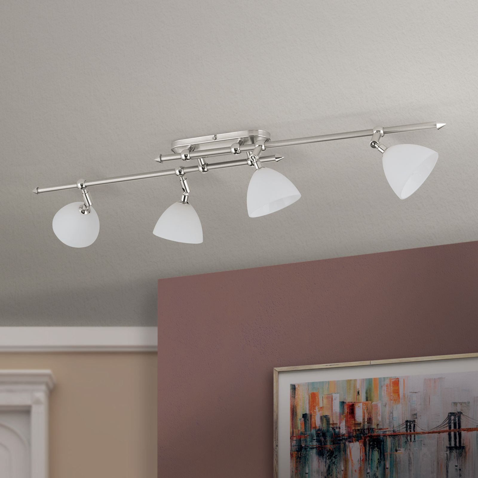 OPALDESIGN ist ein vierflammiger Deckenstrahler, der für mehr Flexibilität bei der Ausrichtung des Lichtscheins sorgt, da alle einzelnen Strahler dreh- und schwenkbar sind.