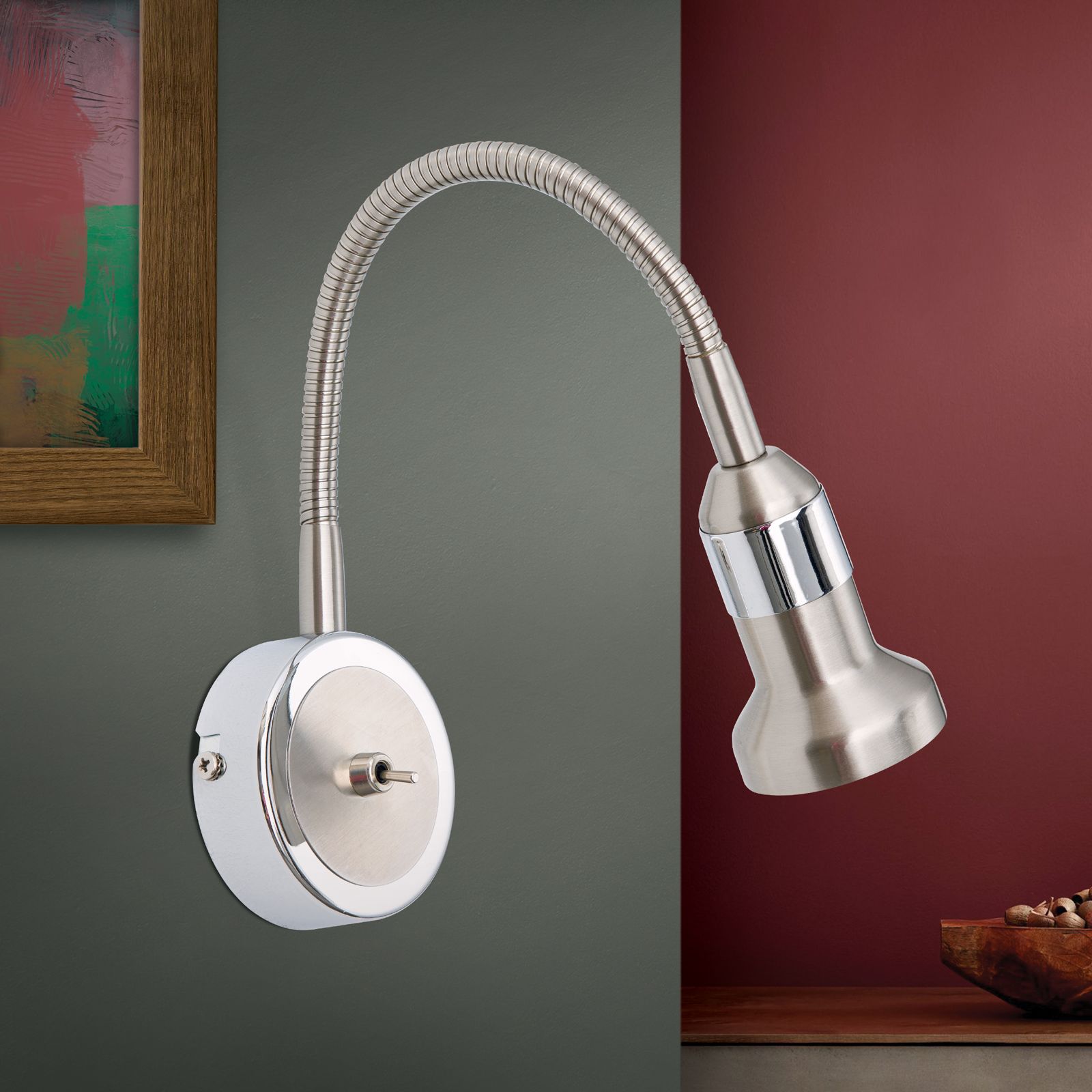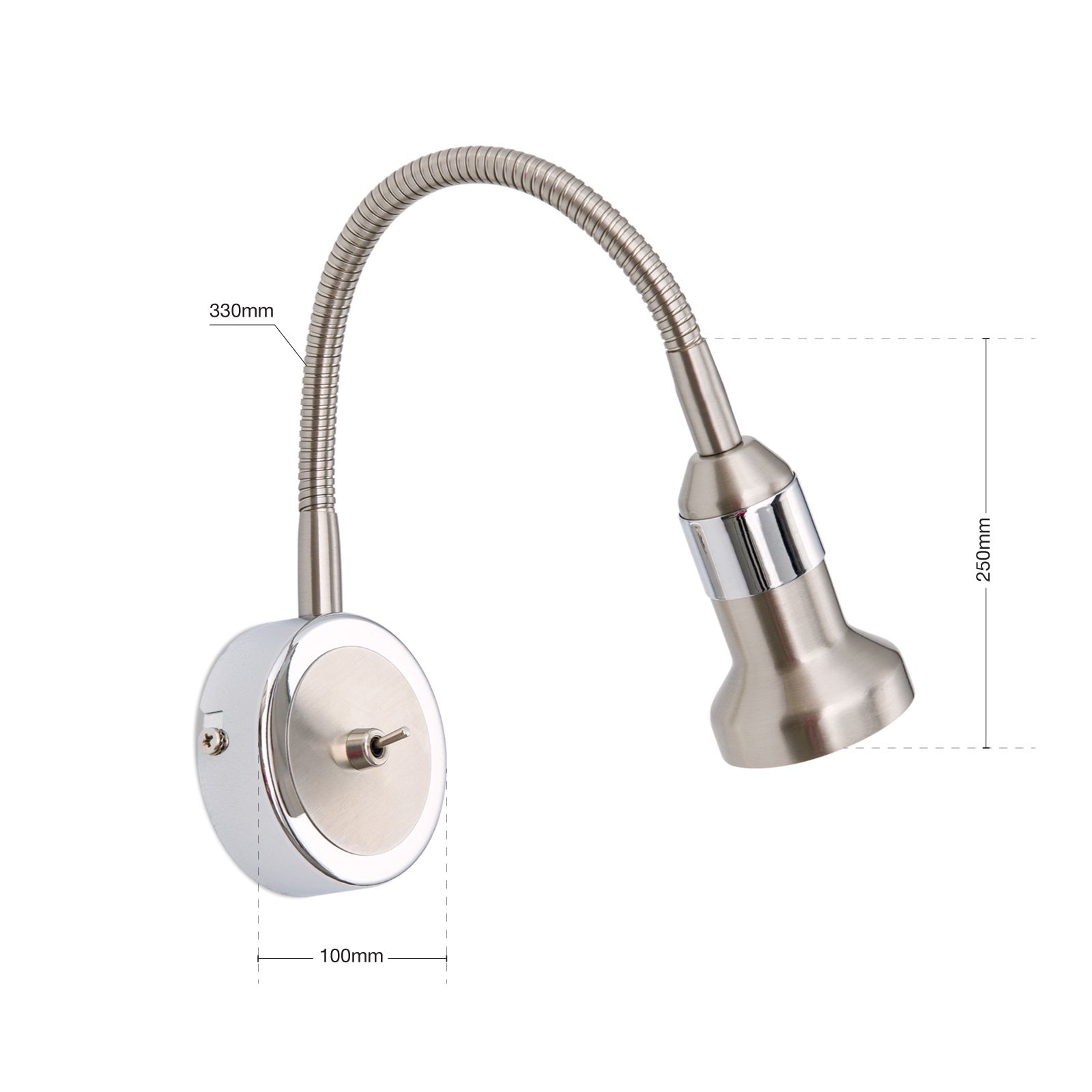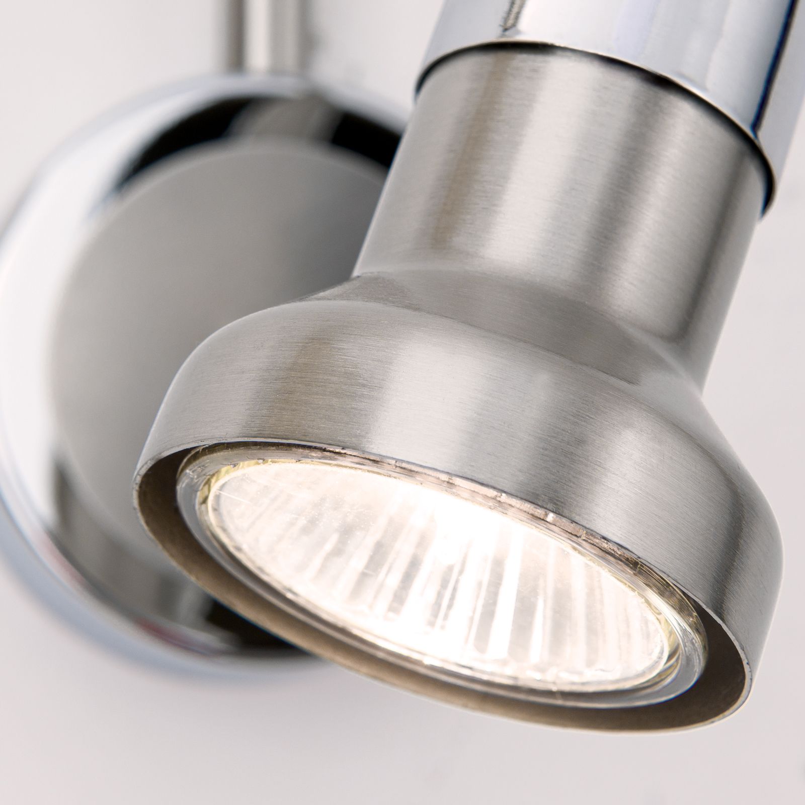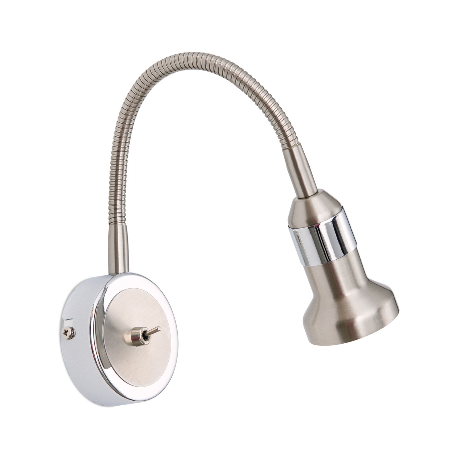 Der 1-flammige Wandstrahler der SEBA-Reihe gibt eine punktuelle Beleuchtung ohne störendes Umgebungslicht ab, weshalb er sich besonders als Leselampe im Schlafzimmer eignet. Die Leuchte ist aus Stahl gefertigt und hat eine abwechselnd hochglanzpolierte und Nickel-matte Oberfläche. Dieser elegante visuelle Aspekt macht aus dem Strahler eine universell einsetzbare Lichtquelle, egal, ob in nüchtern-zeitgemäßen oder fröhlich-bunten Ensembles. Liebevolle Details wie der flexible Schwanenhals, der Retro-Kippschalter und die satinierten abgerundeten Kanten des Gehäuses runden das Design ab. Der Strahler verfügt über eine GU10-Fassung für maximal 50 Watt.