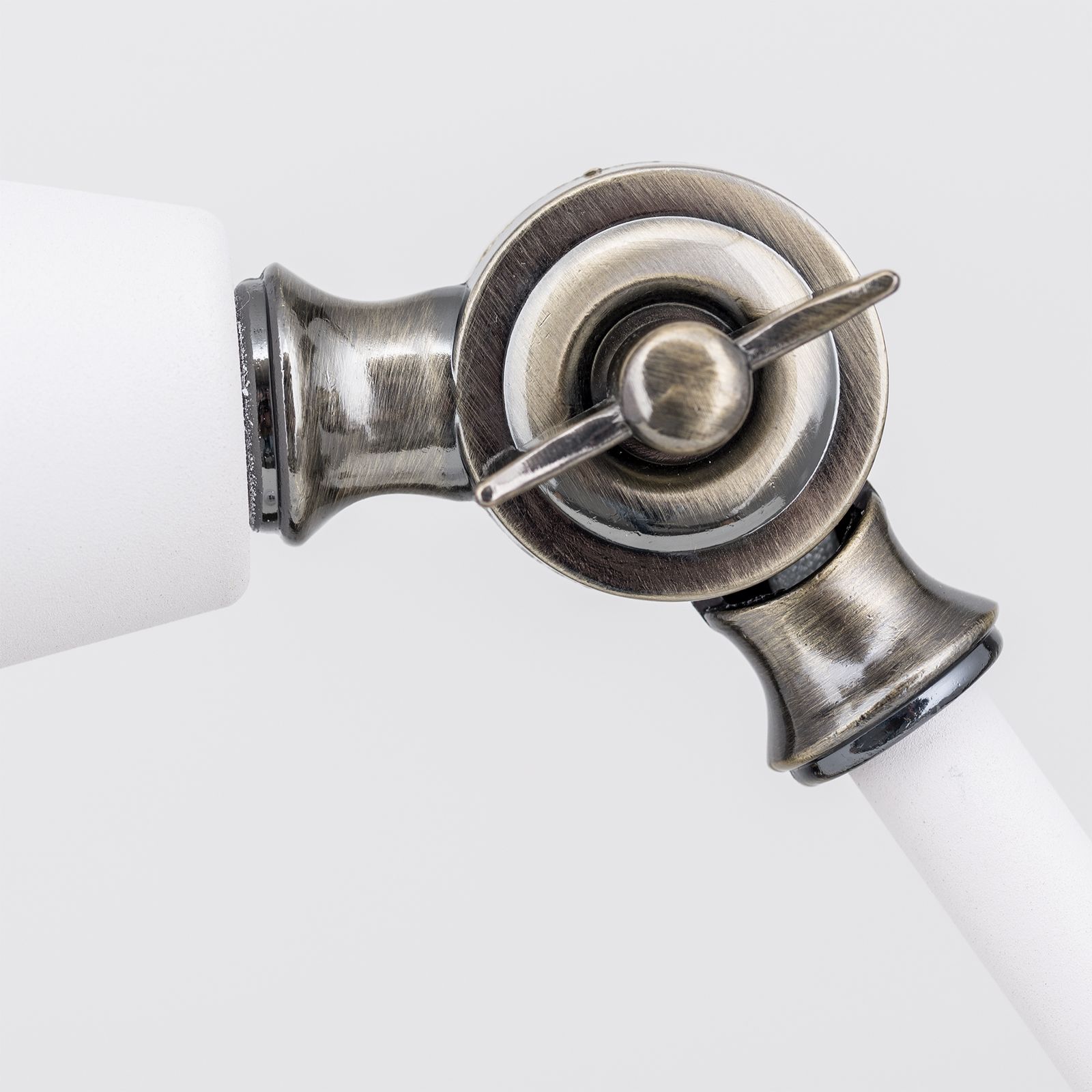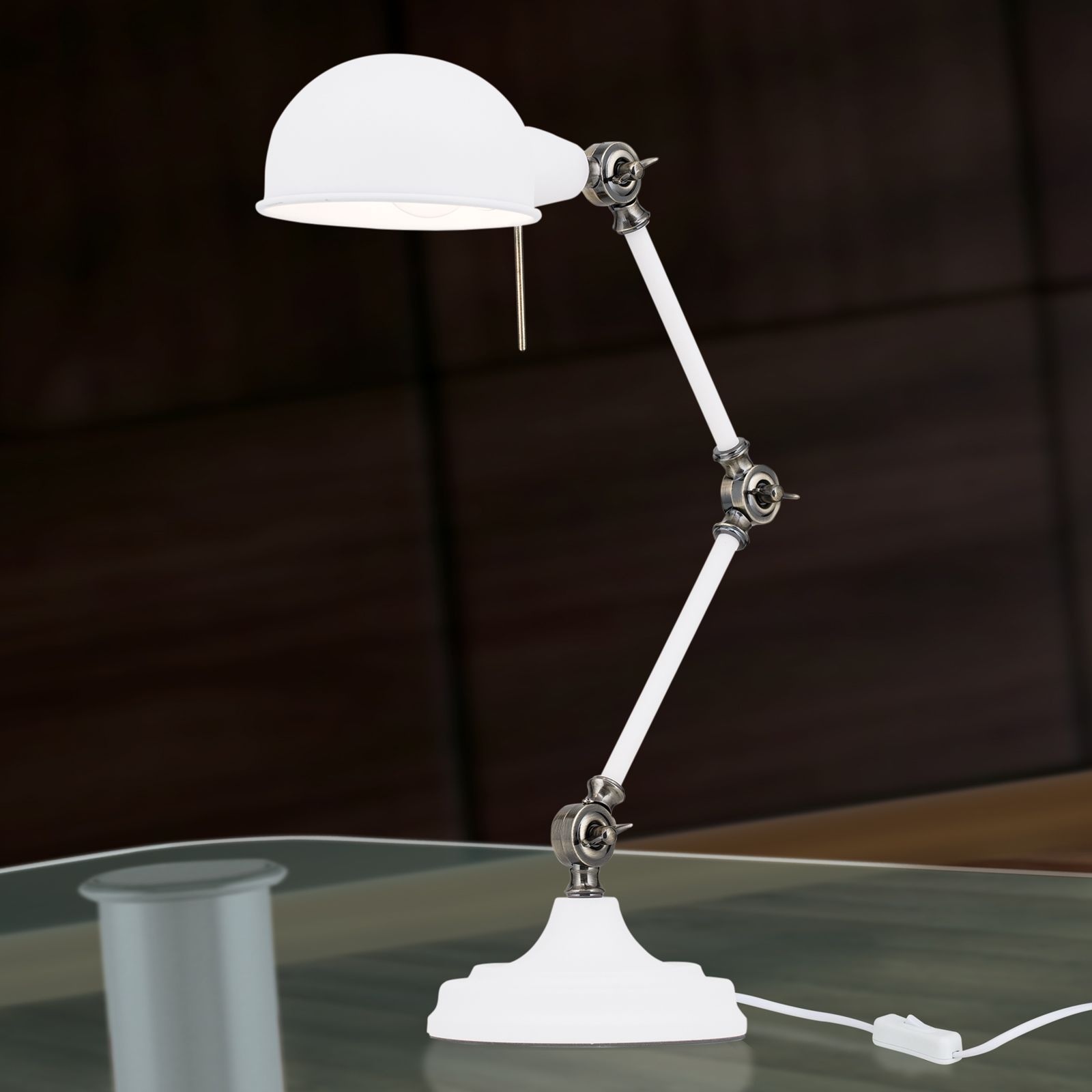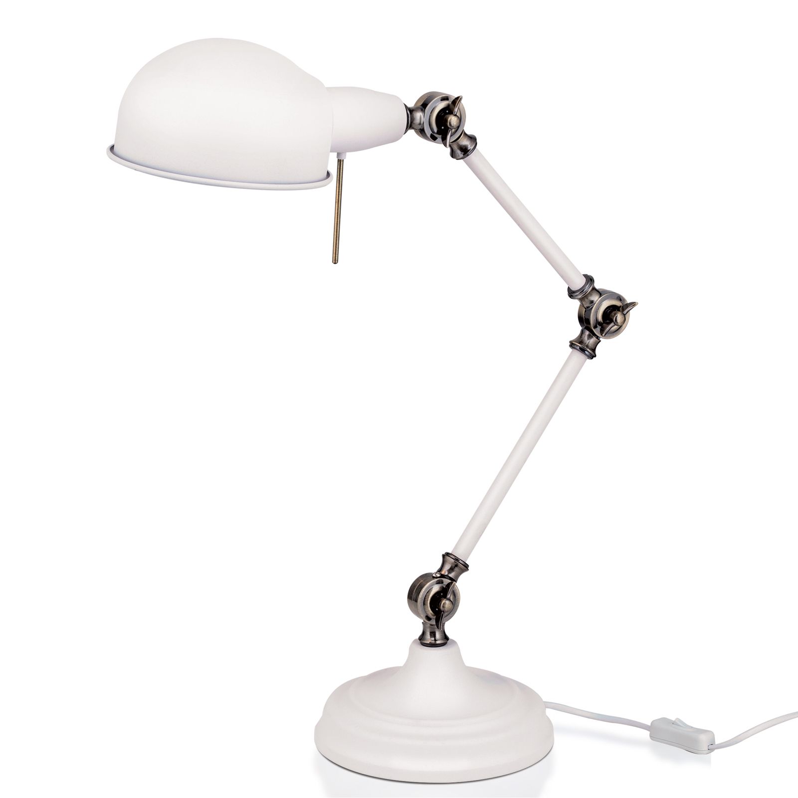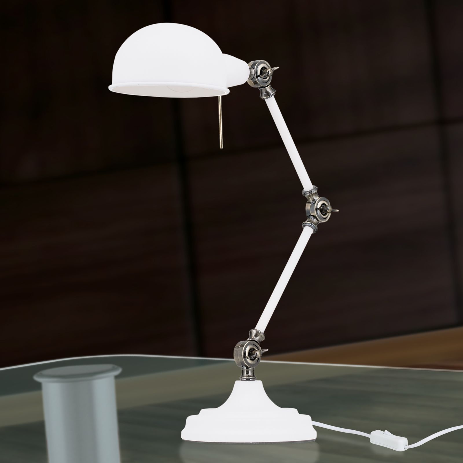 Durch ihre drei Gelenke mit Flügelmuttern kann die Tischleuchte frei verstellt und an die Arbeitsumgebung angepasst werden. Ihr massiver Standfuß sorgt dabei für hohe Stabilität. Der halbkugelförmige Reflektorschirm mit einem Haltegriff zur Ausrichtung und die massiven Gelenke verleihen ihr einen freundlichen Charme.