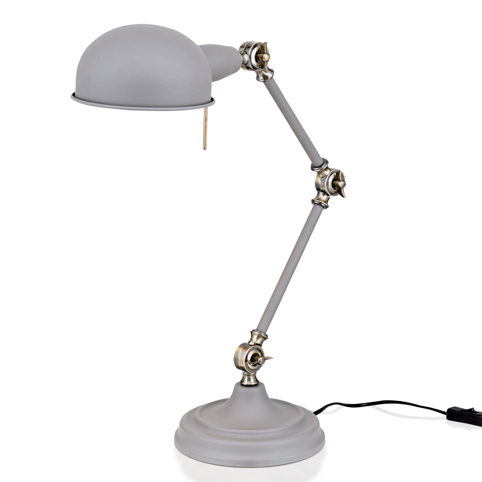 Durch ihre drei Gelenke mit Flügelmuttern kann die Tischleuchte frei verstellt und an die Arbeitsumgebung angepasst werden. Ihr massiver Standfuß sorgt dabei für hohe Stabilität. Der halbkugelförmige Reflektorschirm mit einem Haltegriff zur Ausrichtung und die massiven Gelenke verleihen ihr einen freundlichen Charme.