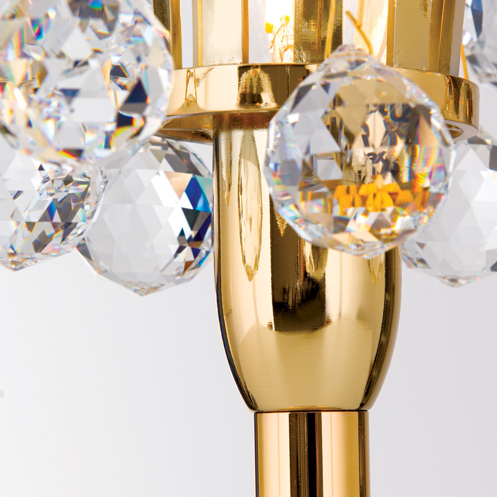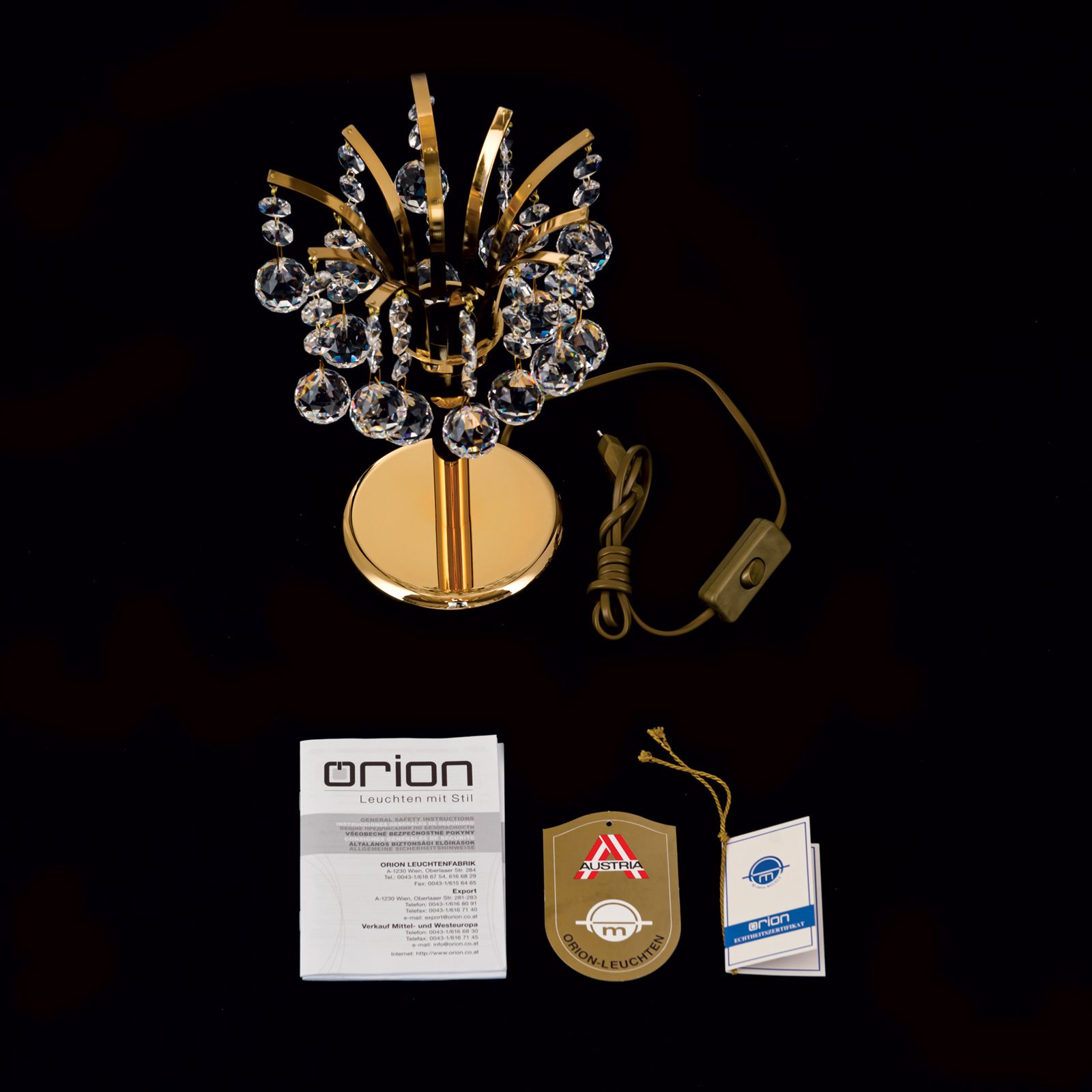 Die Tischleuchte KRISTALL KLASSISCH wird auf einer Kommode oder einem Schreibtisch in klassisch gestalteten Wohnräumen zum dekorativen Blickfang. Ausgestattet mit einer E14-Fassung kann sie mit maximal 40 Watt bestückt werden. An einem Kabel befindet sich ein Wippschalter mit dem sich die Leuchte ganz bequem ein- und ausschalten lässt. Unterschiedlich geschliffenen Kristalle aus dem Hause Asfour zaubern individuelle Lichtreflexionen in den Raum. Intensiviert wir das Funkeln durch die glänzenden Oberflächenveredelung. Das Vollmessinggestell teilt sich nach oben hin auf mehrere gebogene Streben auf die jeweils zu Ketten verbundene Koppen und facettierte Kugeln tragen und an Wasserfontänen erinnern.