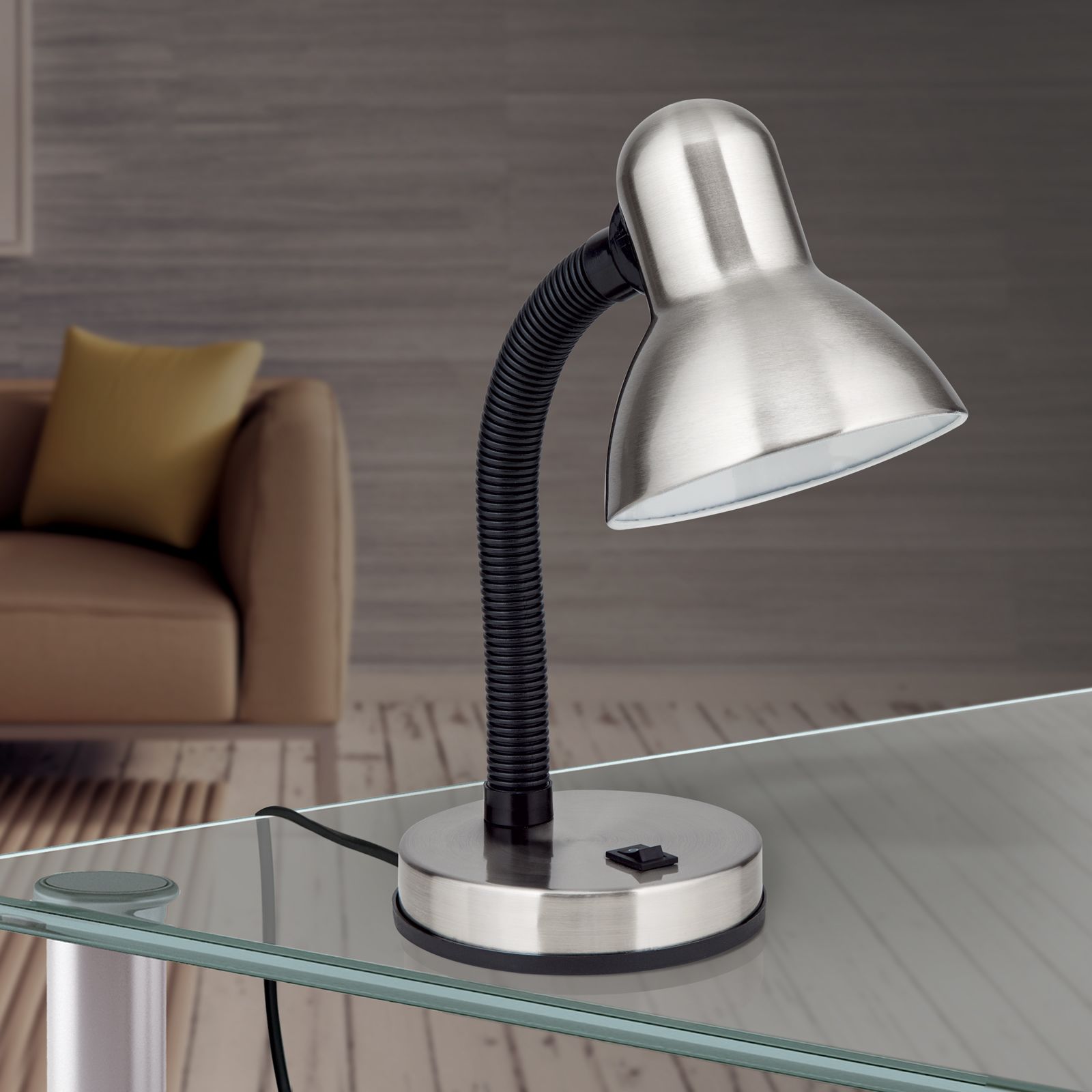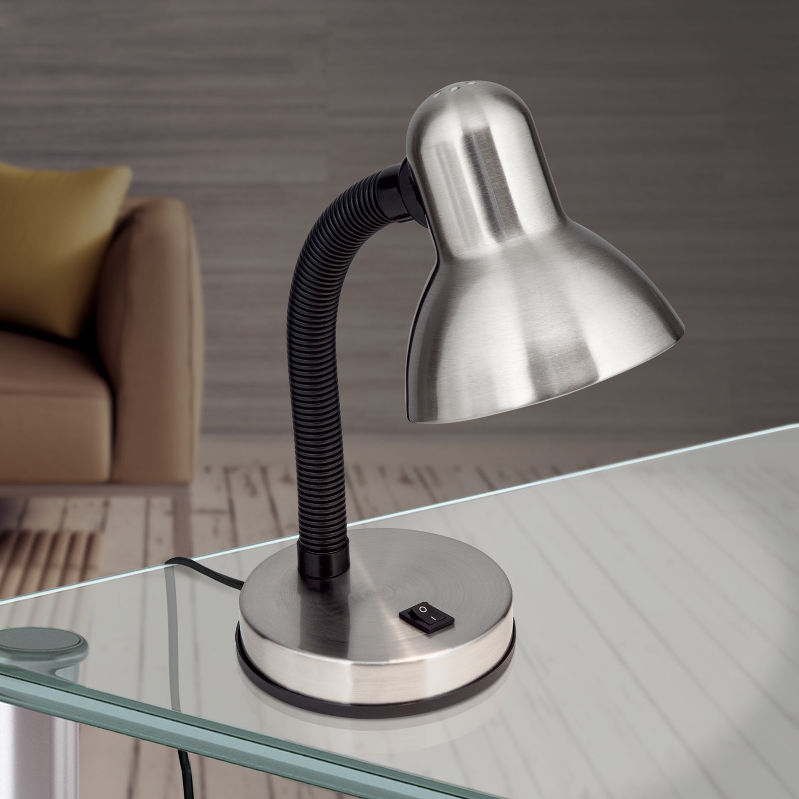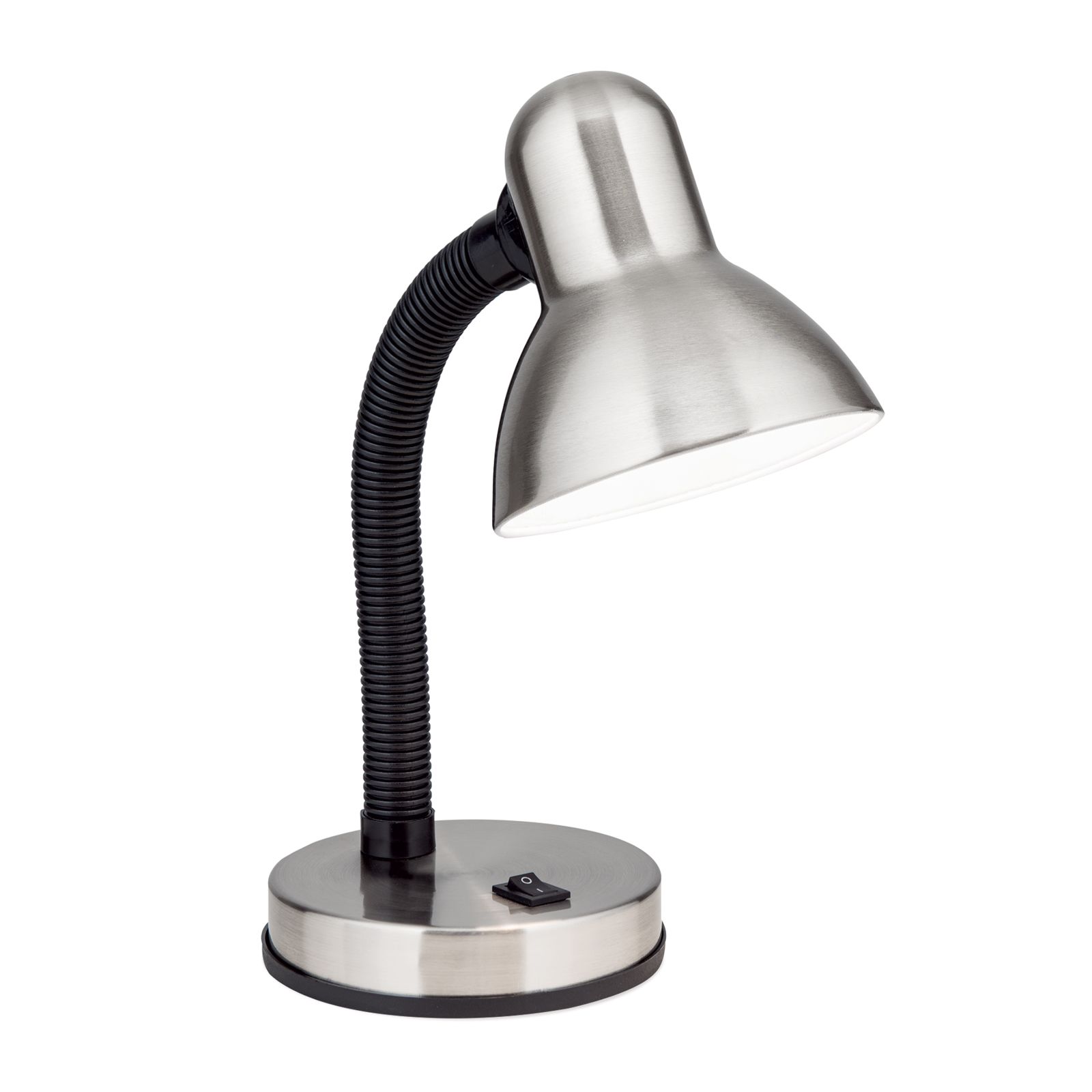 Die Tischlampe NEMO findet ihren Platz auf einem Schreibtisch, wo sie ihren Zweck als Lichtspender voll und ganz nachkommt. Sie leuchtet den gewünschten Bereich gut aus und kann unkompliziert mit einem integrierten Schalter ein- und ausgeschaltet werden. Zudem ist sie höhenverstellbar sowie schwenkbar, wodurch sich der Lichtstrahl nach Belieben einstellen lässt. Schirm und Lampenfuß sind aus Stahl gefertigt und durch einen breiten Schwanenhals miteinander verbunden. Diese Robustheit macht sie auch zur geeigneten Schreibitschlampe im Kinderzimmer. Die Leuchte ist mit einer E27-Fassung ausgestattet und kann mit maximal 60 Watt bestückt werden. Mit LED-Lampen eignet sie sich für den Einsatz als sparsame und dennoch starke Lichtquelle.