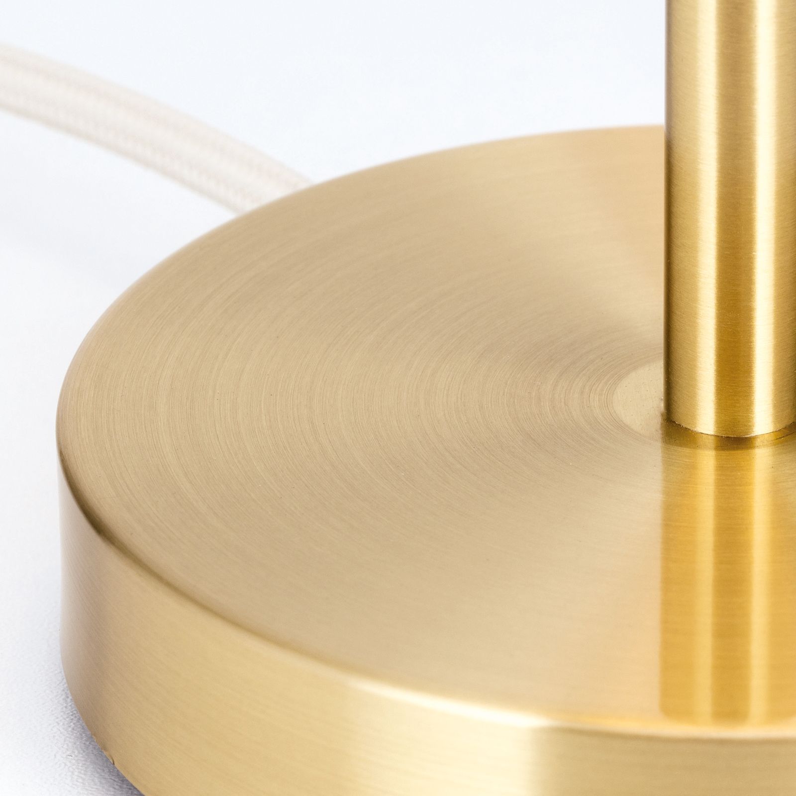 SHADE präsentiert sich in schlichter Eleganz und hochwertiger Ausführung. Die Klarheit des Designs basiert auf dem Verzicht von unnötigem Dekor und dem Fokus auf Form und Material. Das Gestell aus Vollmessing setzt sich aus einer zylindrischen Säule und einem ebenso geformten, flachen Lampenfuß zusammen. Auch der dezente Zugschalter folgt dieser Form. Darüber ergebt sich der konische, matt glänzende Textilschirm, dessen Oberfläche einen attraktiven Kontrast bildet.