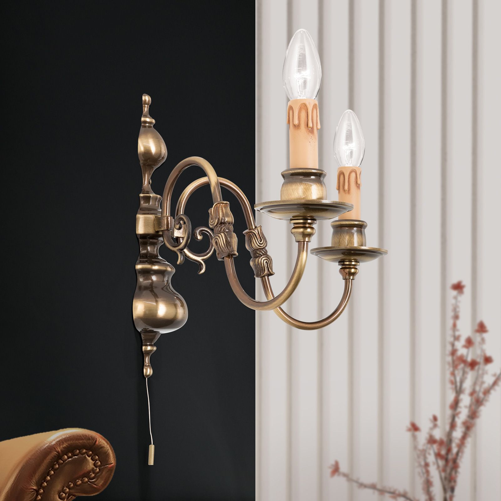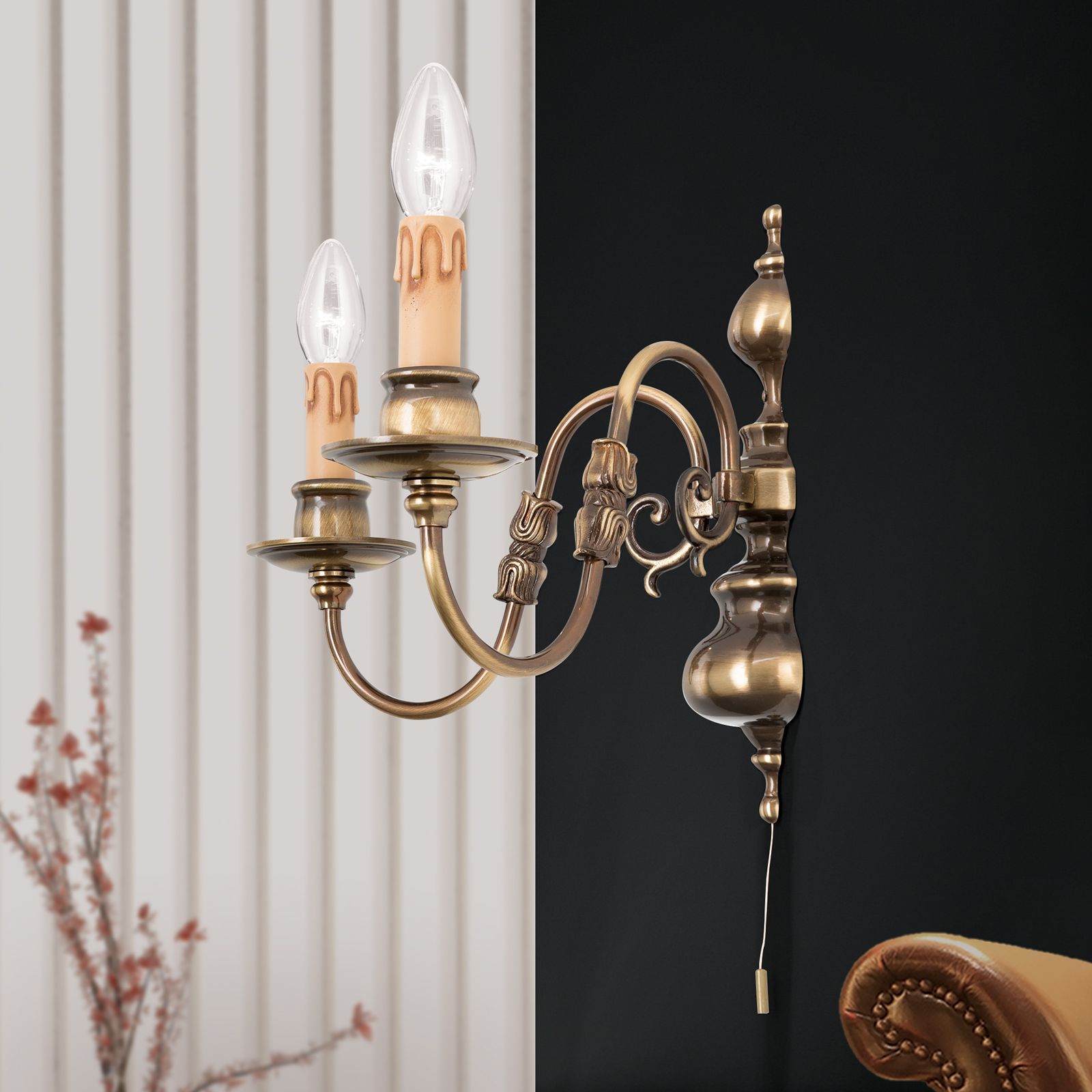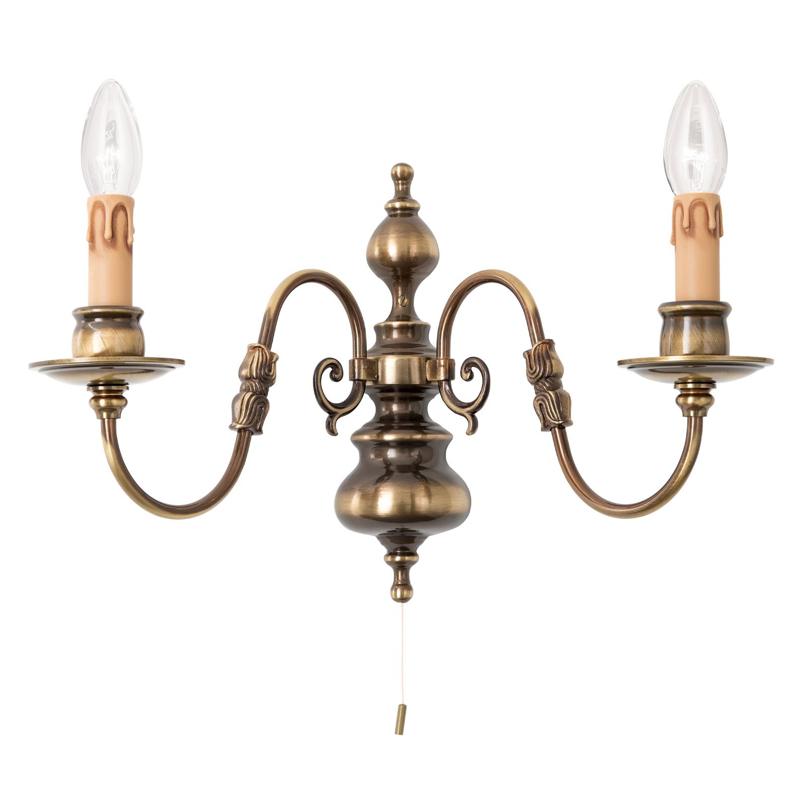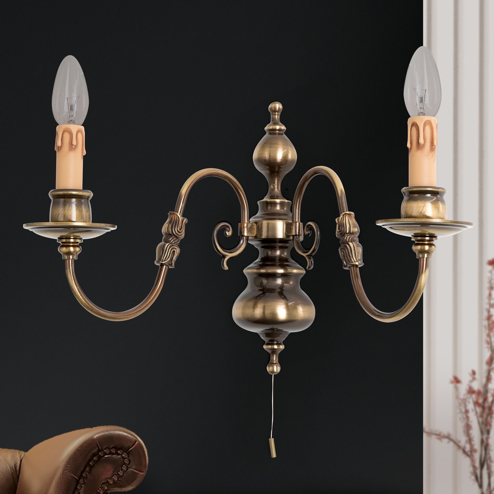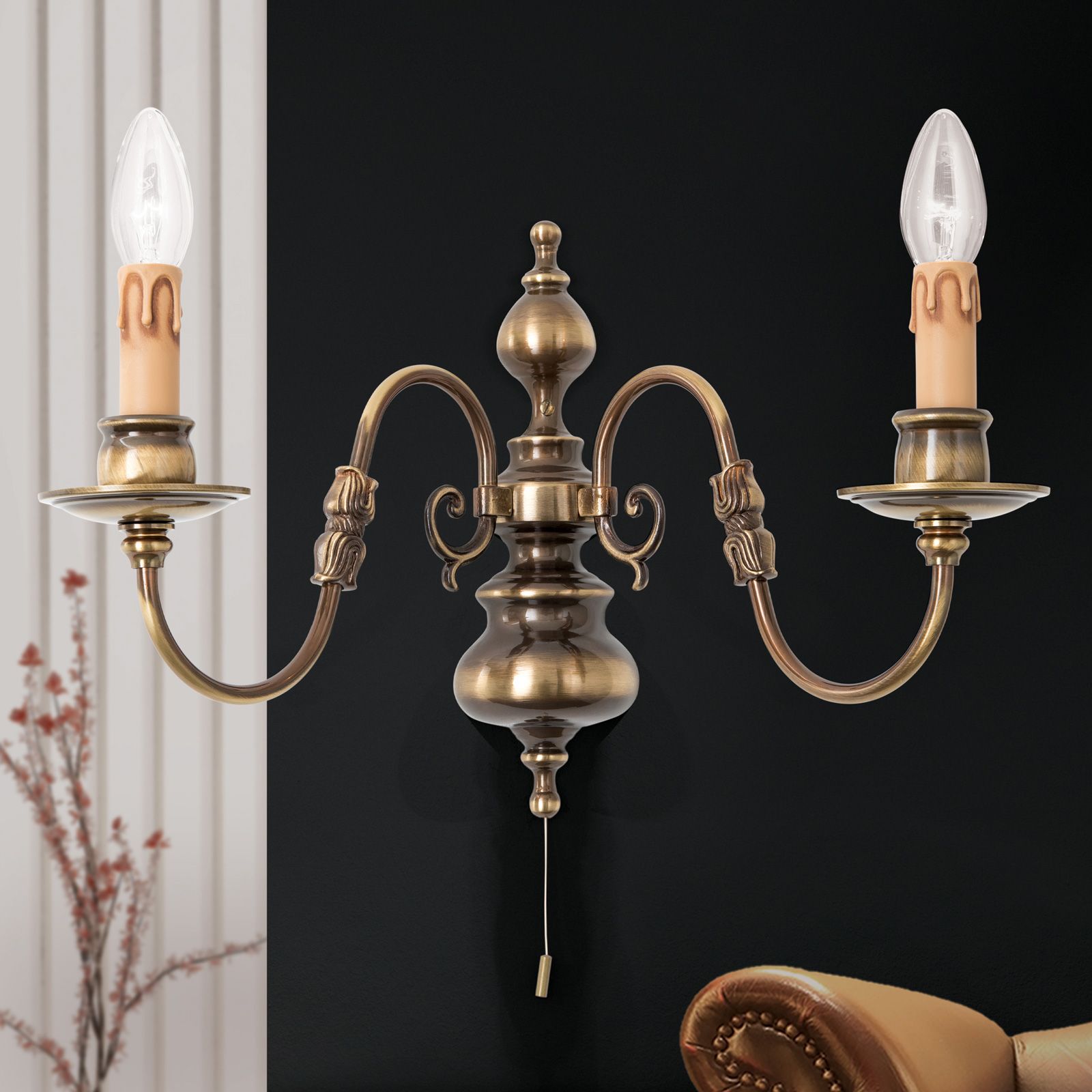 Die 2-flammige Wandarmleuchte aus der FLÄMISCH-Reihe teilt einem Raumbereich eine warm-behagliche Atmosphäre zu. Umgeben von Holzeinrichtungselementen, kassettierten Möbeln, Draperien, stilvollen Tapisserien, wird die Wandleuchte den Besitzer, die Besitzerin, höchlichst erfreuen. Die Arme mit Blütenverzierung und Ranken sowie der gegliederte Baluster im Zentrum erzeugen den Glanz verstärkende Lichtreflexe. Das macht die Wandarmleuchte zu einem erbaulichen Blickfang. Der Zugschalter am unteren Ende des Birnenkörpers ermöglicht eine einfache Betätigung. Der Wandarm liefert über zwei E14-Fassungen je bis zu 40 Watt Leistung.
