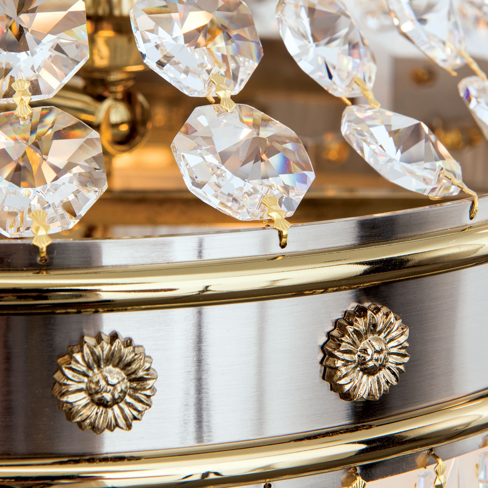 Äußerst imposant im Erscheinungsbild zeigt sich die Wandarmleuchte EMPIRE CRYSTAL. Fünf Flammen verbergen sich hinter filigranen Kristallketten aus dem Hause Schöler und einer im Diamatschliffverfahren mit Kantenschliff geschmückten halbrunden Glasschale. Viele aufwendige Details schmücken die Leuchte und machen sie in klassisch eingerichteten Wohn- und Objekträumen zum Blickfang. Die liebevollen Details reichen von den geschwungenen kannelierten Armen über kunstvoll geprägte Zierbänder bis hin zum eindrucksvollen Kristallbehang, der bei Lichteinfall ein betörendes Funkeln und Glitzern entwickelt.