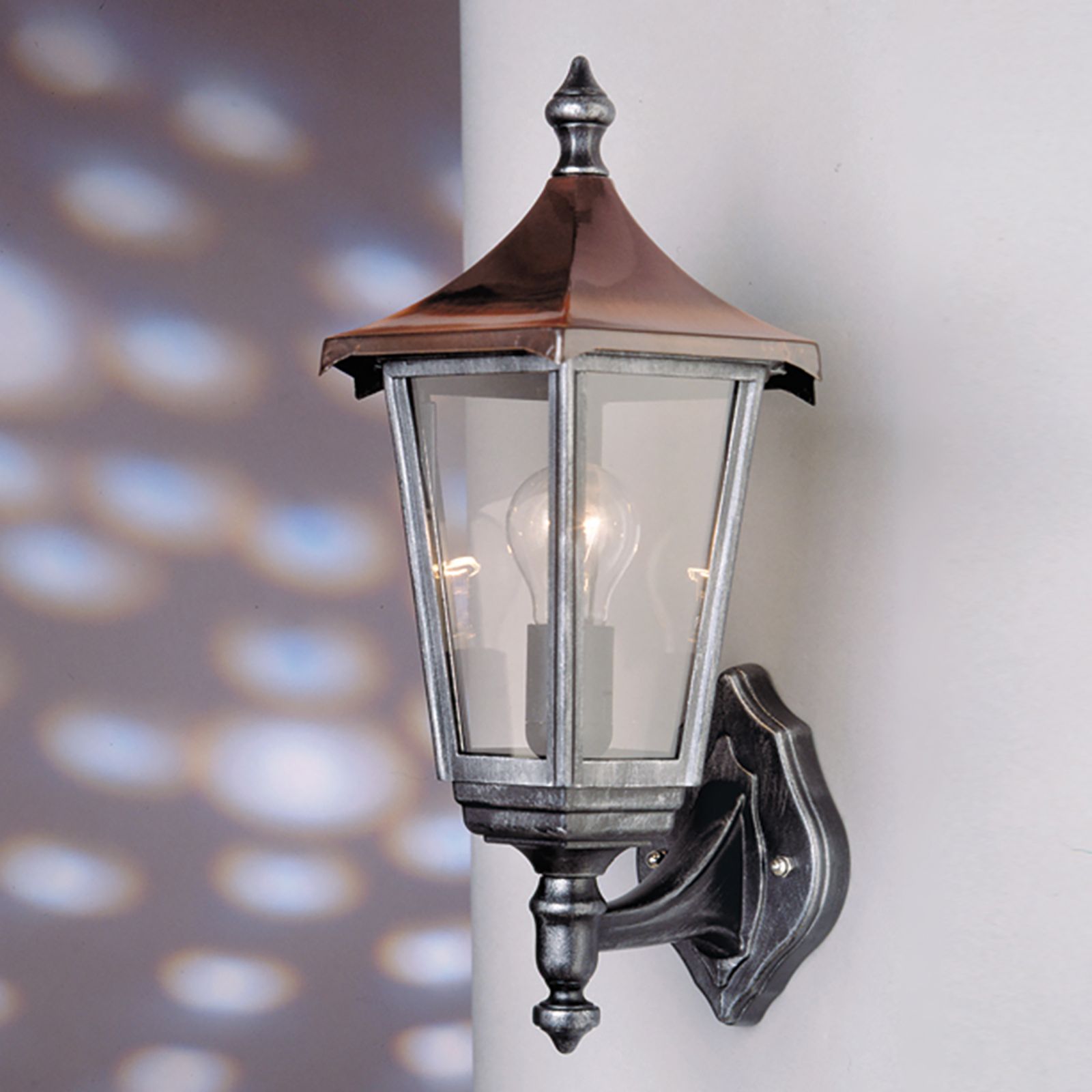 Die Farbgebung in Schwarzsilber gipfelt in einem kupferfarbenen Dach mit schwarzer Spitze und sorgt so für einen rustikalen Touch. In der Laterne befindet sich klares Rauchglas, hinter dem eine E27-Fassung mit maximal 100 Watt betrieben werden kann. Für die Grundbeleuchtung eignen sich vor allem LED-Birnen, die besonders sparsam im Energieverbrauch und langlebig sind. Abgerundet wird das antike Bild vor allem durch ein LED-Leutmittel mit Filamentoptik, die Effizienz und den passenden Retro-Look vereinen. Dank der Dimmbarkeit der Wandleuchte können Sie auch in Sachen Lichtintensität nach Belieben wählen.