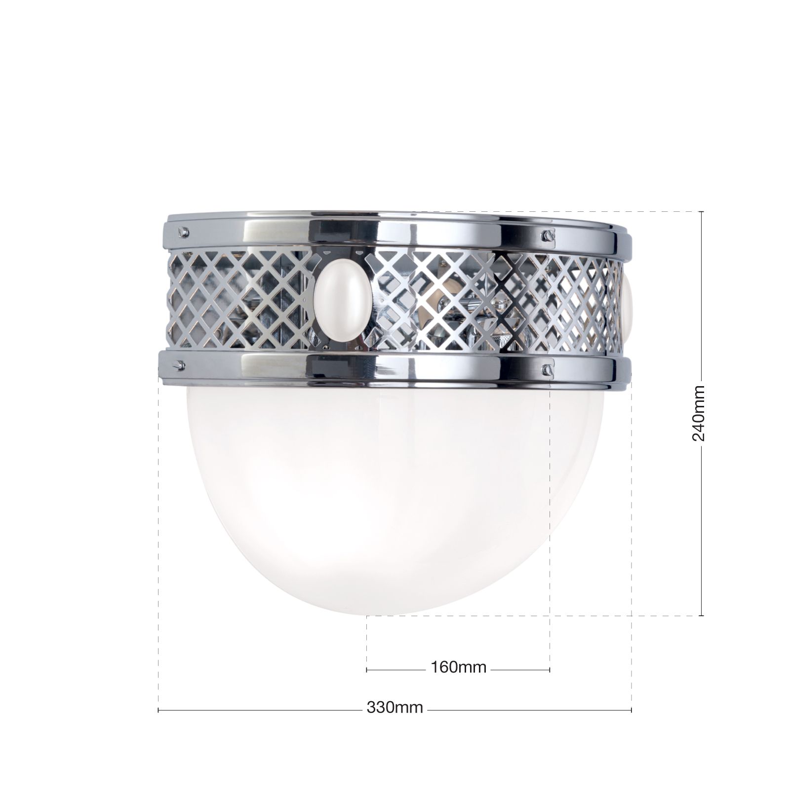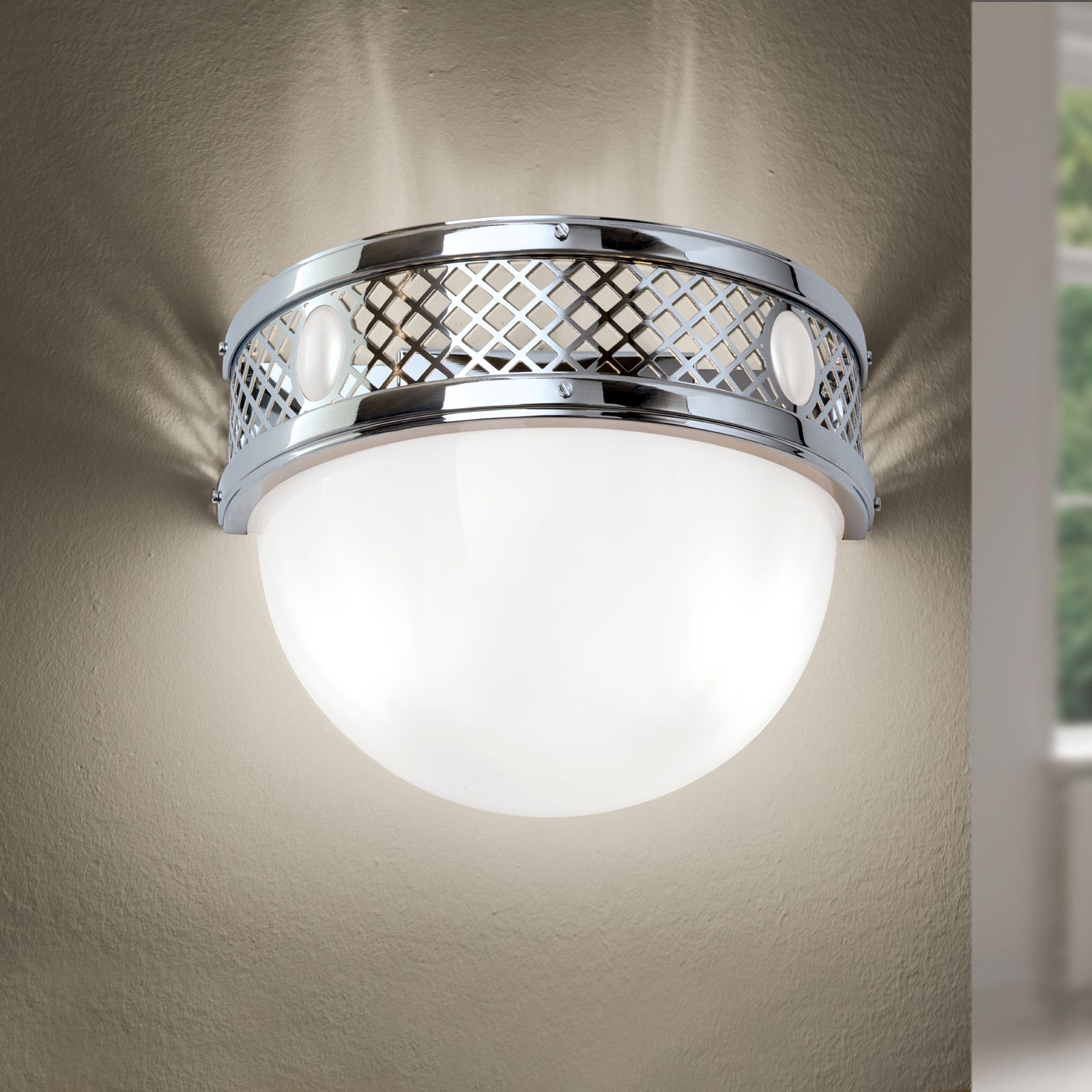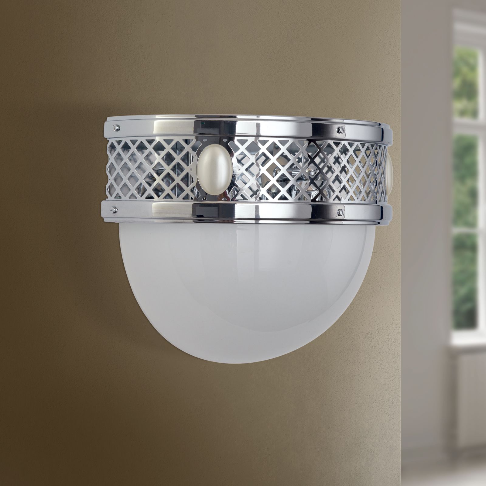 Die Wandleuchte orientiert sich in ihrer Gestaltung am Jugendstil des Wiener Fin de Siècle, wodurch ihre Form und Funktion ästhetisch im Einklang stehen. Das Gestell aus Messing mit einer glänzenden Oberfläche und Schmucksteinen lässt Licht durch das Gitter fallen und wirft einen eleganten Strahlenkranz an die Wand. Der halbkugelförmige Glasschirm ist satiniert und gibt sein Licht sanft an den Raum ab - dies kann ein Wohn-, Schlaf oder Esszimmer sein, ebenso wie ein Flur oder Eingangsbereich. Die Wandleuchte ist mit zwei E27-Fassungen für je bis zu 60 Watt ausgestattet.