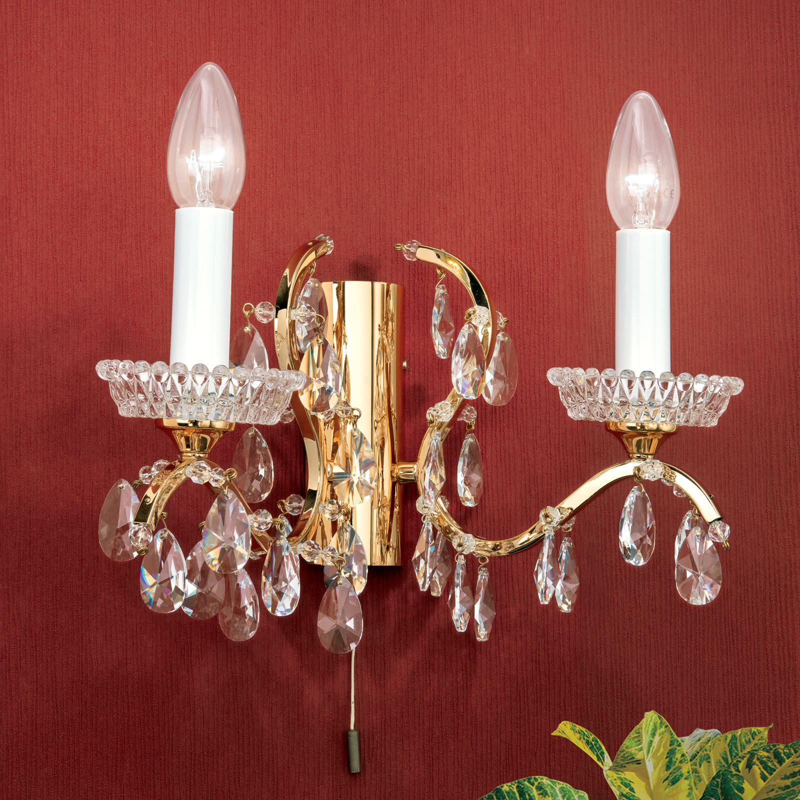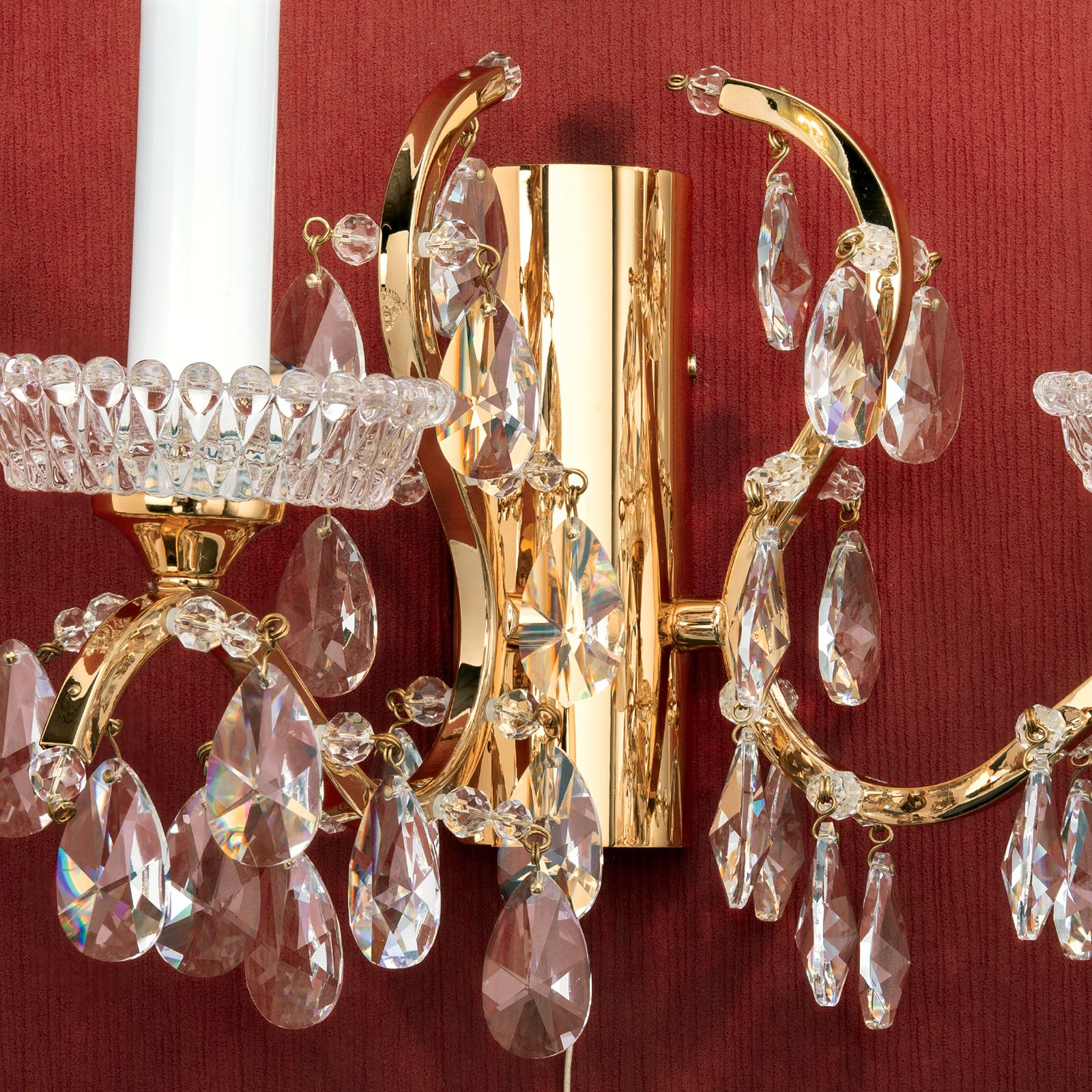 Die HIROHITO-Serie erlaubt einen Einblick in die Ausstattung kaiserlicher Prunkräume. Die 2-flammige Wandleuchte aus dieser Serie besticht durch die sinnvoll eingesetzten reflektierenden Elemente. Kunstvoll geschwungene, vergoldete Arme, glitzernde Kristallbuchteln und Kerzentassen aus Bleikristall wetteifern um das effektvolle Abstrahlen des Lichtes. In einem Wohn- oder Vorzimmer über einer edlen Kommode oder beidseits eines prächtigen Polstermöbels entfaltet diese Leuchte ihre ganze Pracht. In Verbindung mit Tapisserien, Samtstoffen und gediegenem Mobiliar entsteht ein gelungenes Einrichtungsensemble.
