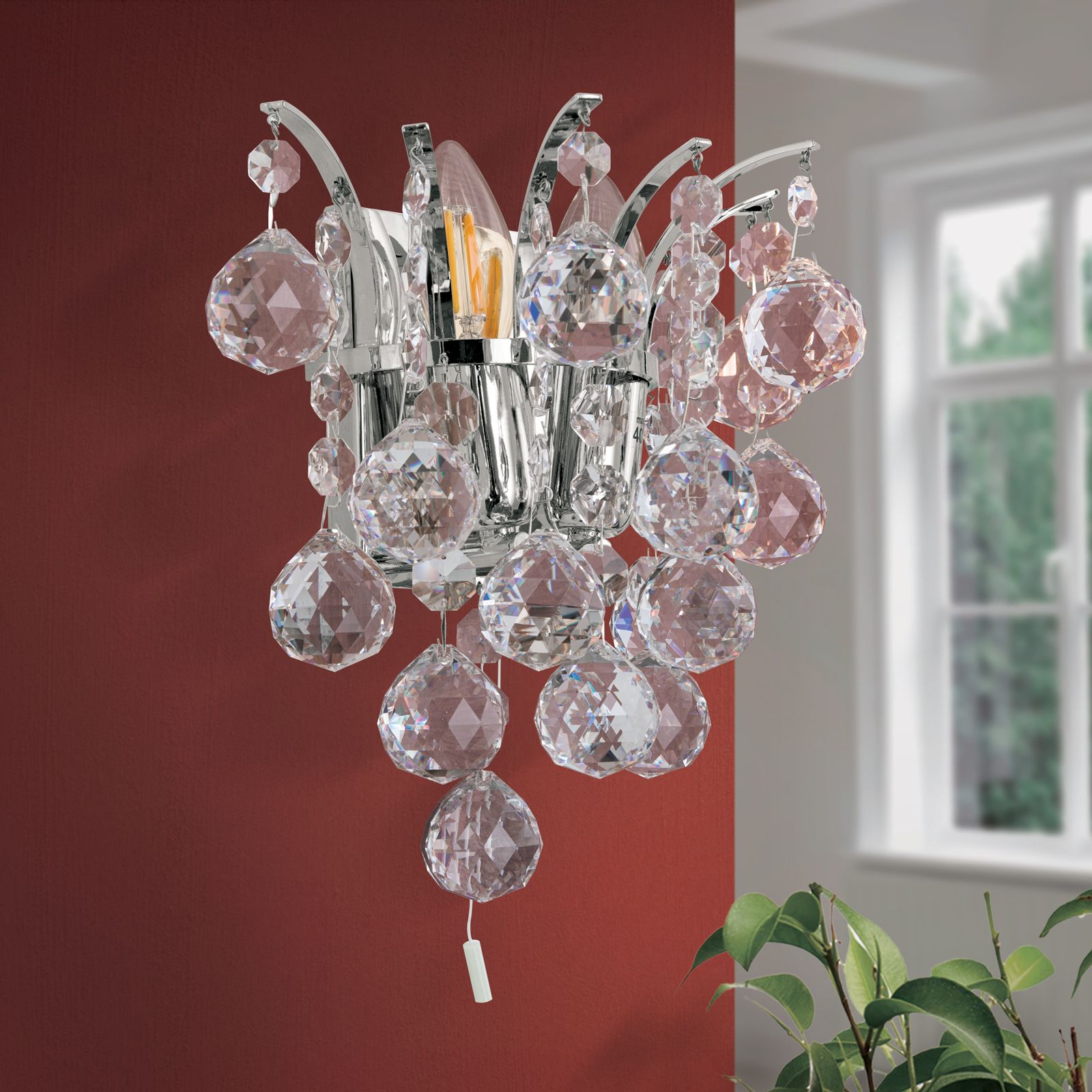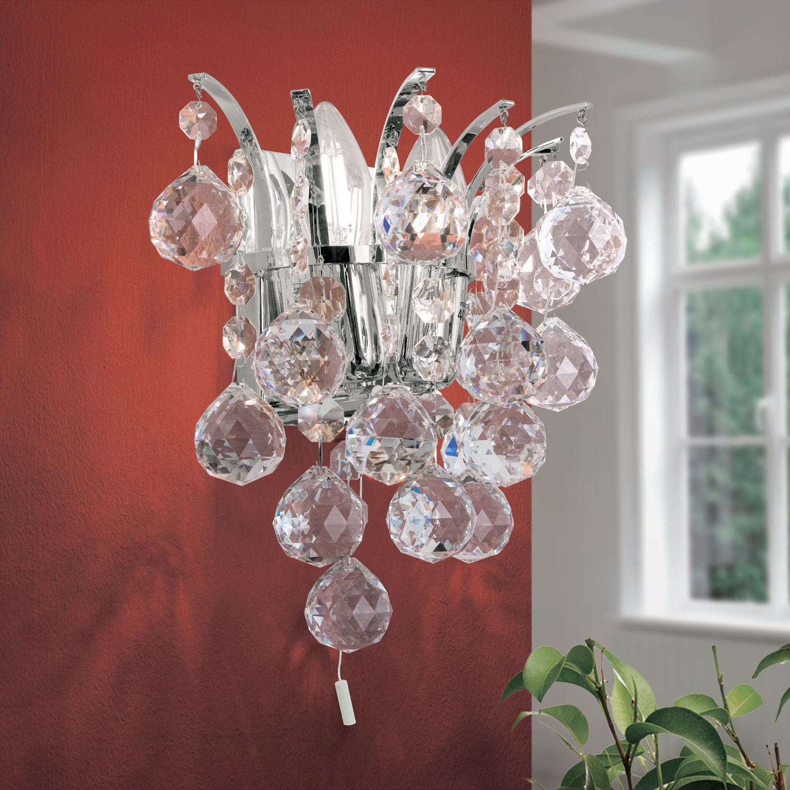 Hauptmerkmal dieser eindrucksvollen Wandleuchte ist mit Sicherheit der wunderbare Asfour-Kristallbehang in Form von Koppen und facettierten Kugeln. Ob in klassischen oder modernen Wohnräumen, die Einsatzmöglichkeiten sind vielfältig und somit lässt sich die Leuchte in Kombination mit anderen Leuchten aus der Serie verbinden oder als dekorative Akzentbeleuchtung einsetzen. An der glänzenden Wandhalterung sind gebogene Streben montiert, an denen die formschönen Kristalle kettenförmig herunterhängen. Bei Lichteinfall beginnen diese zu glitzern und funkeln und sorgen für einzigartige Lichtreflexionen im Raum. Die 2 E14-Fassungen können mit maximal 40 Watt betrieben werden, gegebenenfalls auch mit Dimmer in der Helligkeit eingestellt werden. Mittels Schalter lässt sich die Leuchte ganz einfach und bequem ein- und ausschalten.