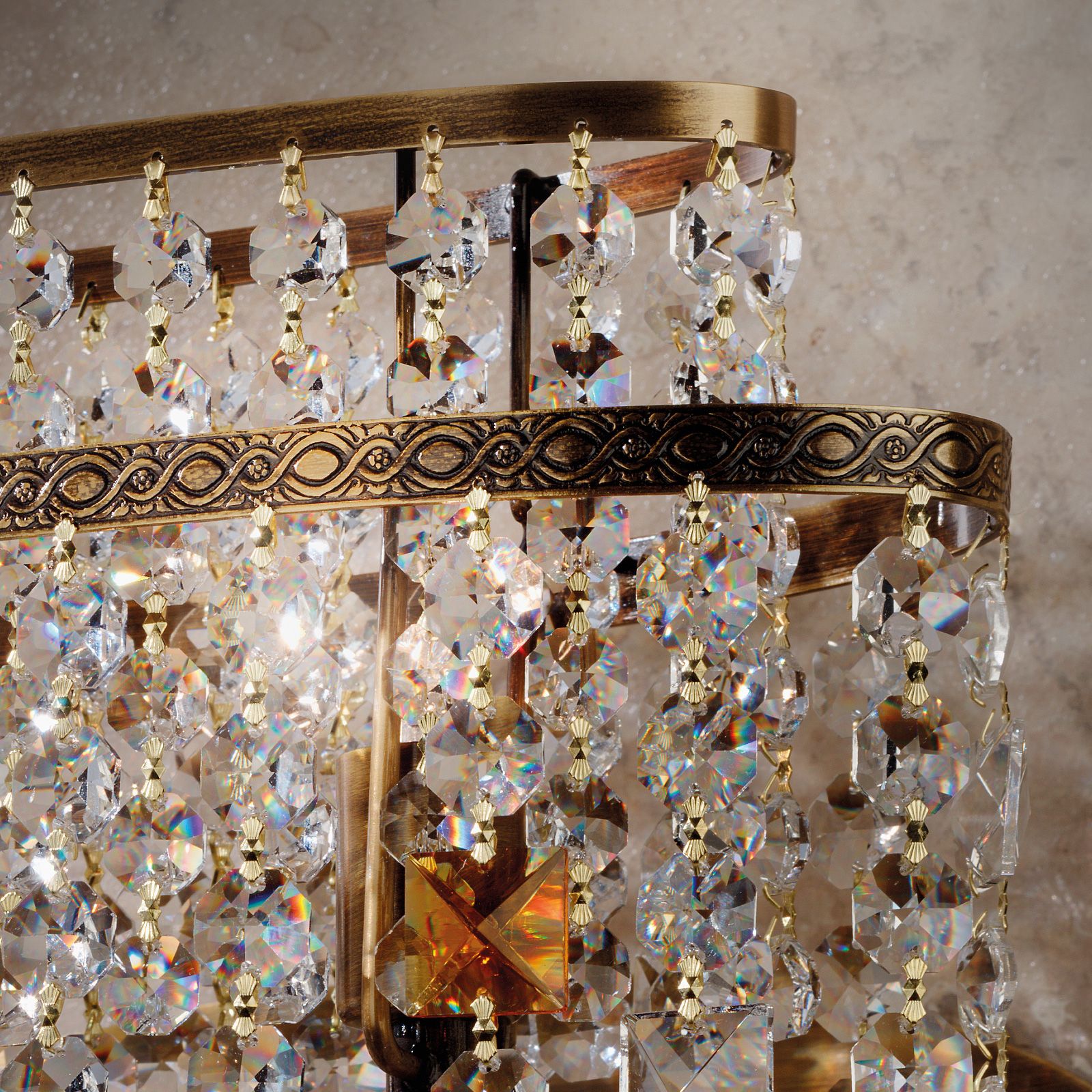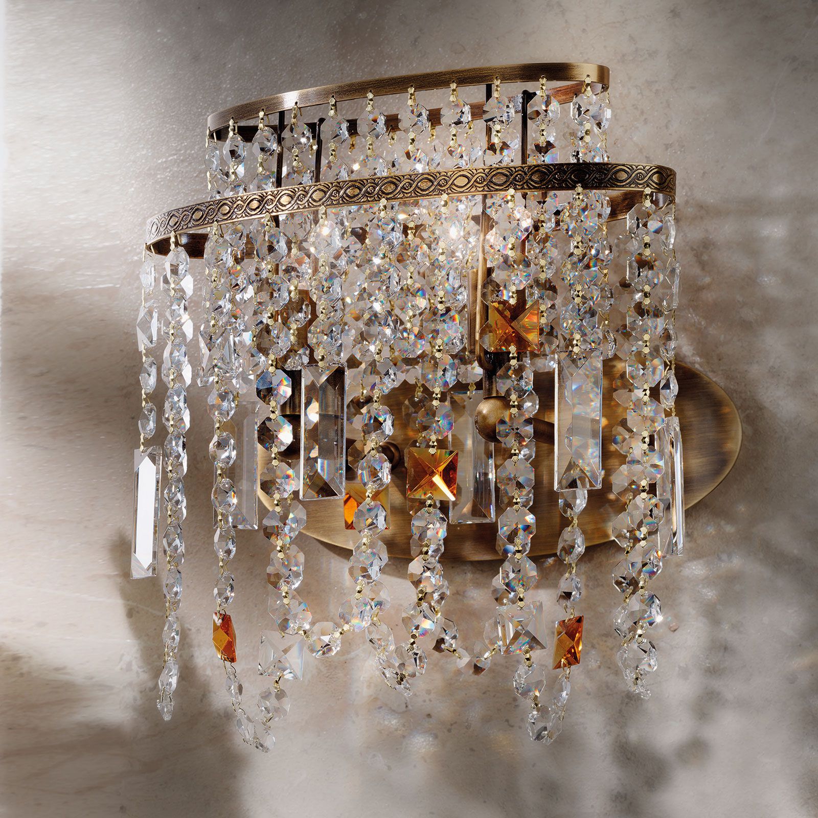 An einer ovalen Wandplatte sind 2 G9-Fassungen montiert. Das filigrane Gestell, bestehend aus zwei ovalen Ringen, dessen äußerer kunstvoll verziert ist, hält jeweils eine Vielzahl an Ketten von Kristallen unterschiedlicher Form. Für ein besonderes Highlight sorgen die bernsteinfarbenen Kristalle, die eine Verbindung zur patinaveredelten Montur herstellen und den Behang farblich akzentuieren.