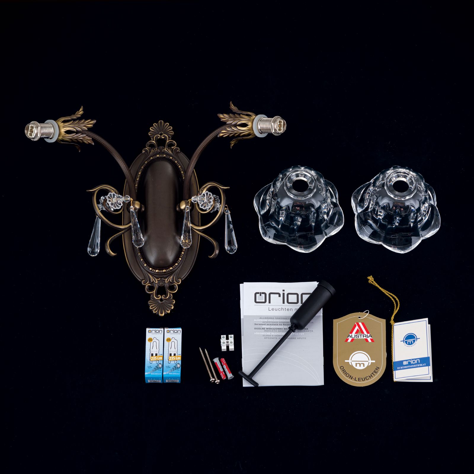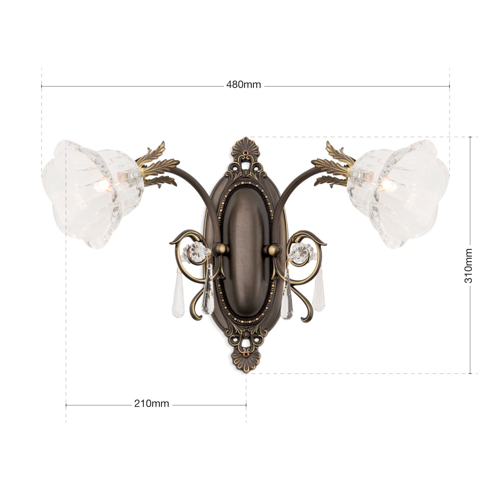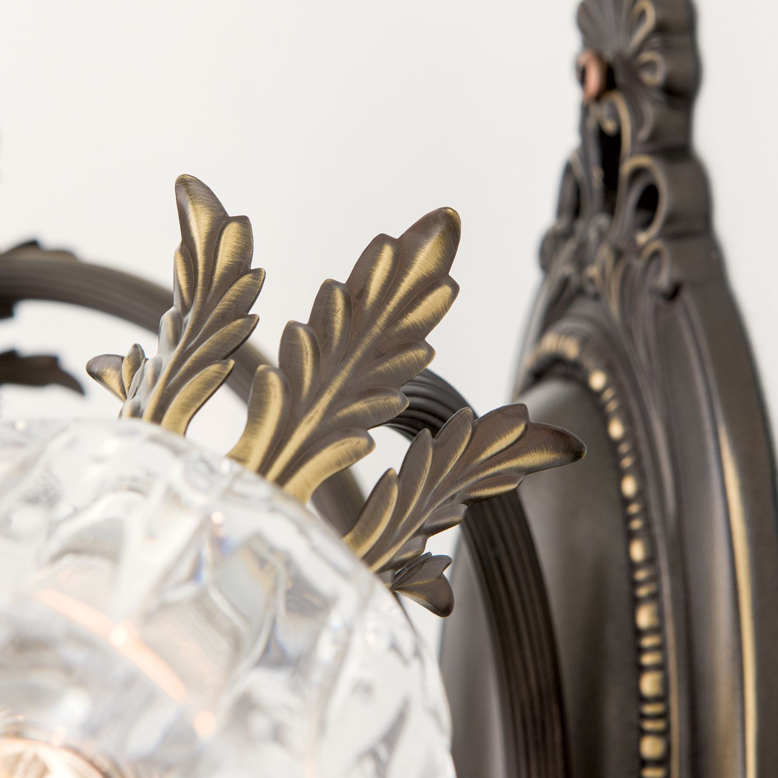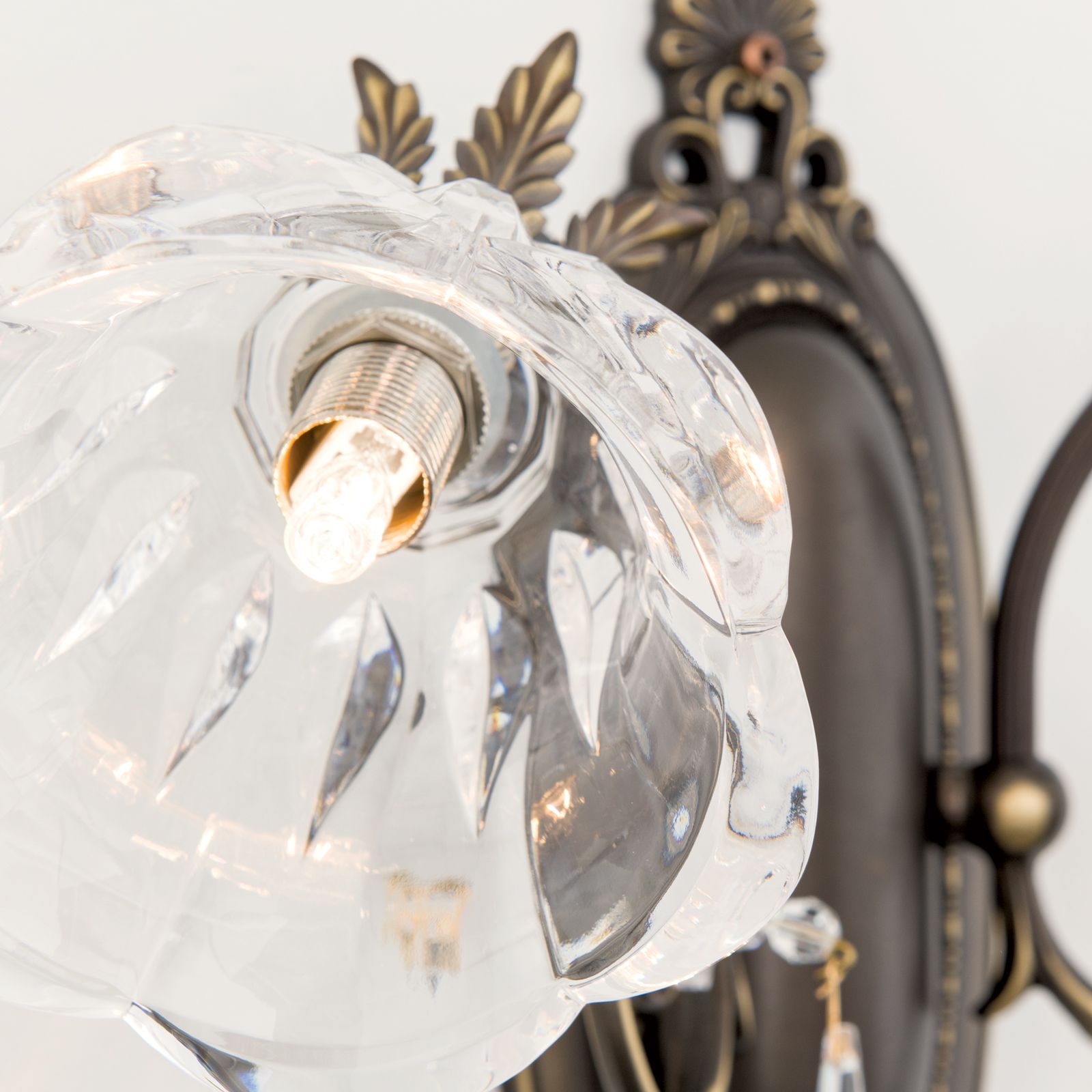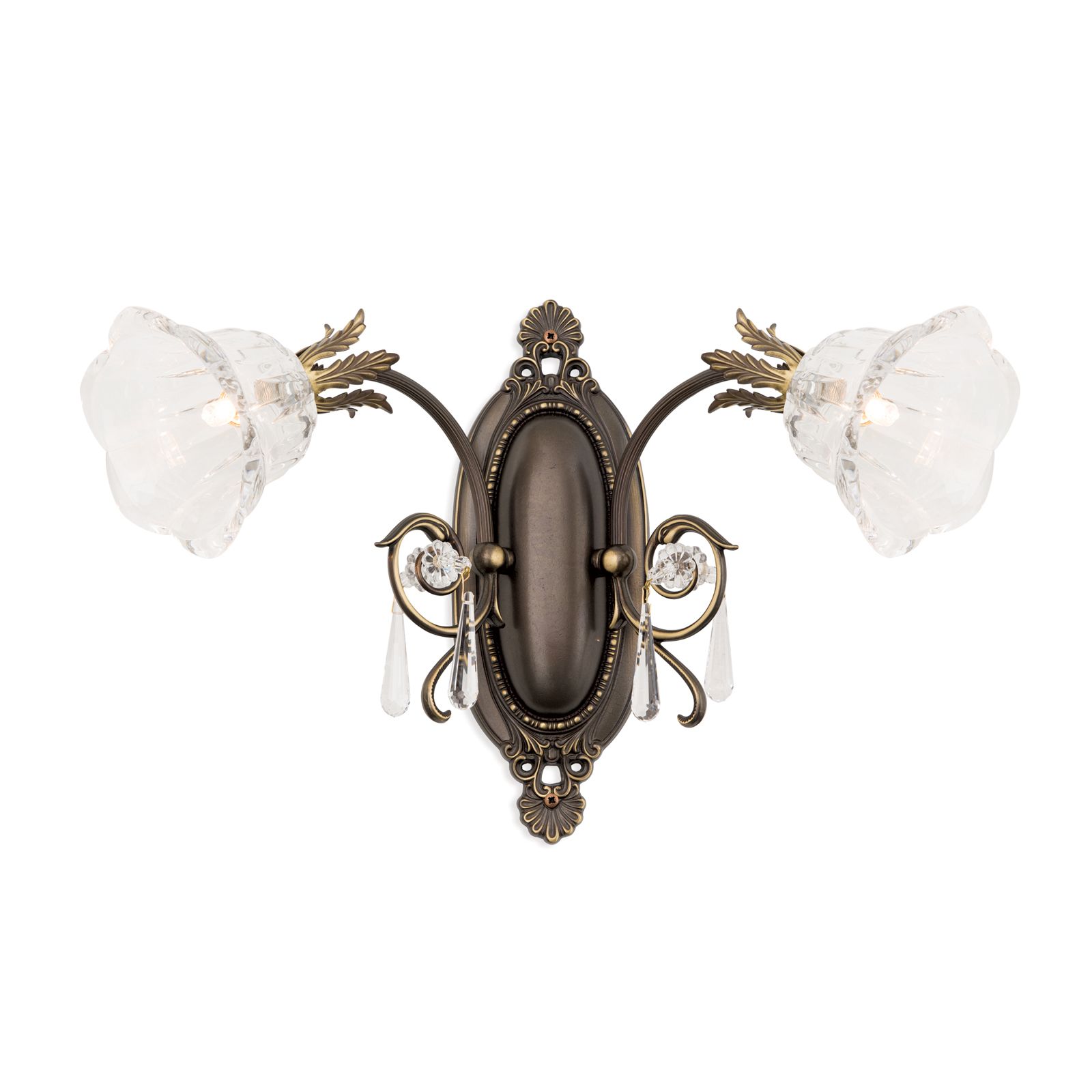 Die Leuchtenmontur besteht aus Vollmessing. An der verzierten ovalen Wandhalterung sind 2 schwungvolle gebogene Arme befestigt, die jeweils einen Kristallschirm tragen. Akanthusblätter zieren diese und sorgen für ein üppig florales Erscheinungsbild. Für mehr Funkeln sind die 1A Vollschliff Kristalle in Tropfenform verantwortlich, die ihren Platz ebenso an den Armen wiederfinden.