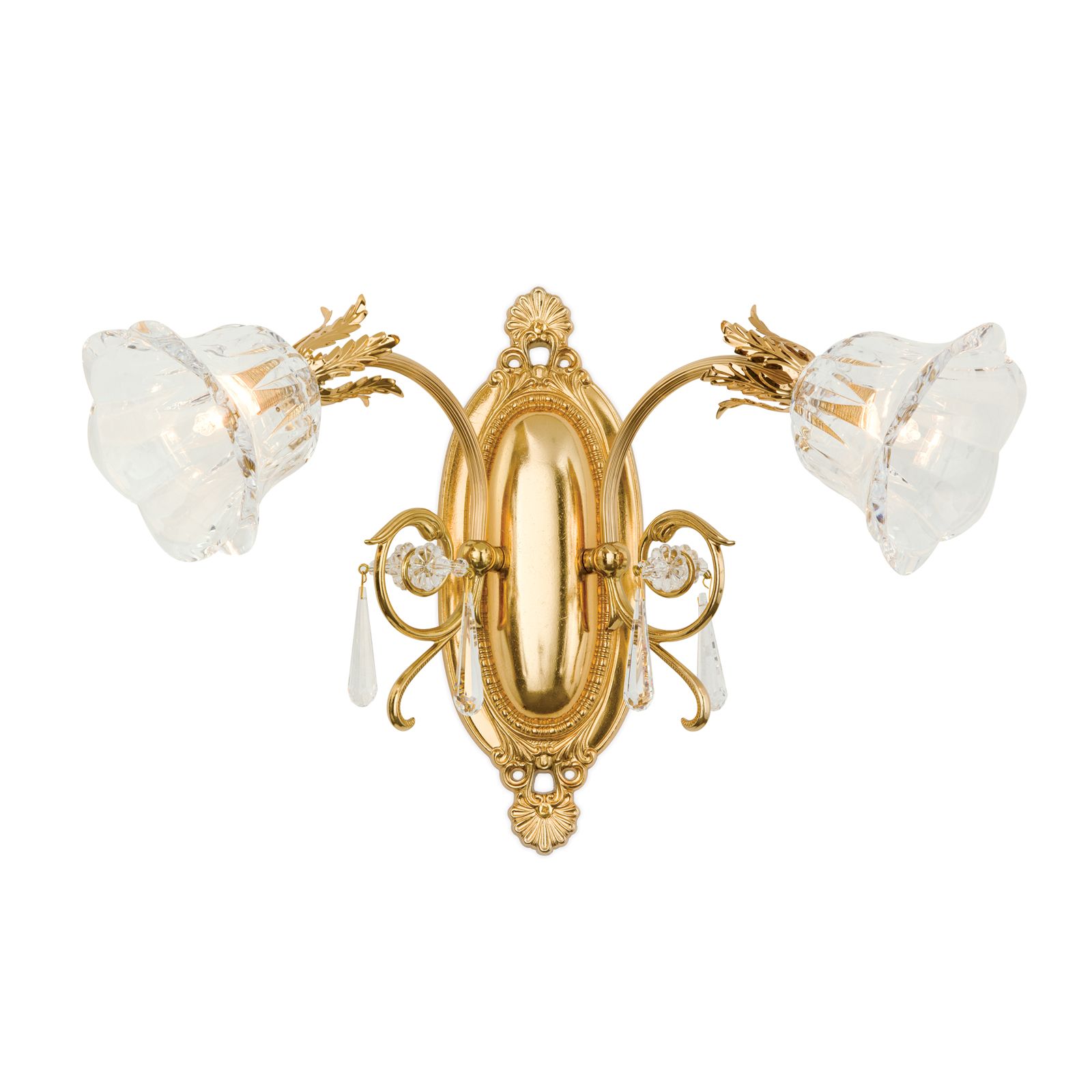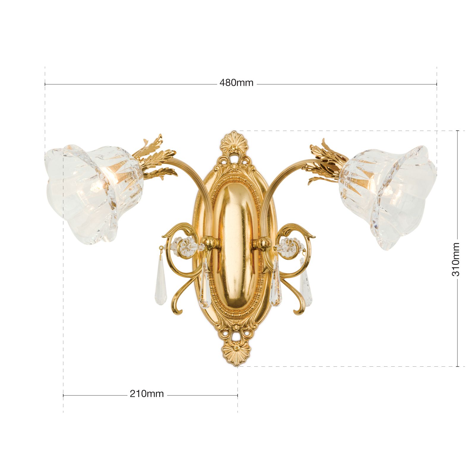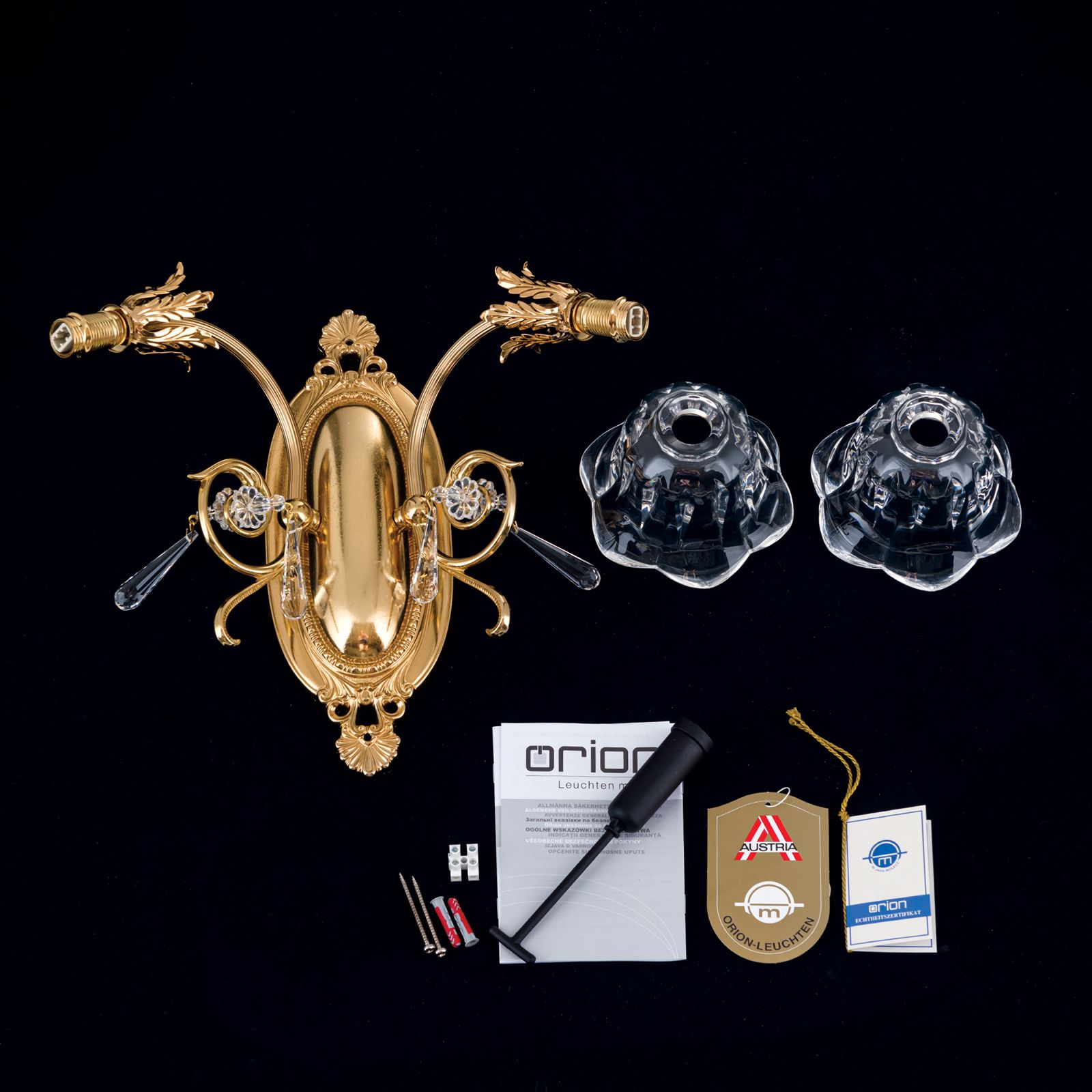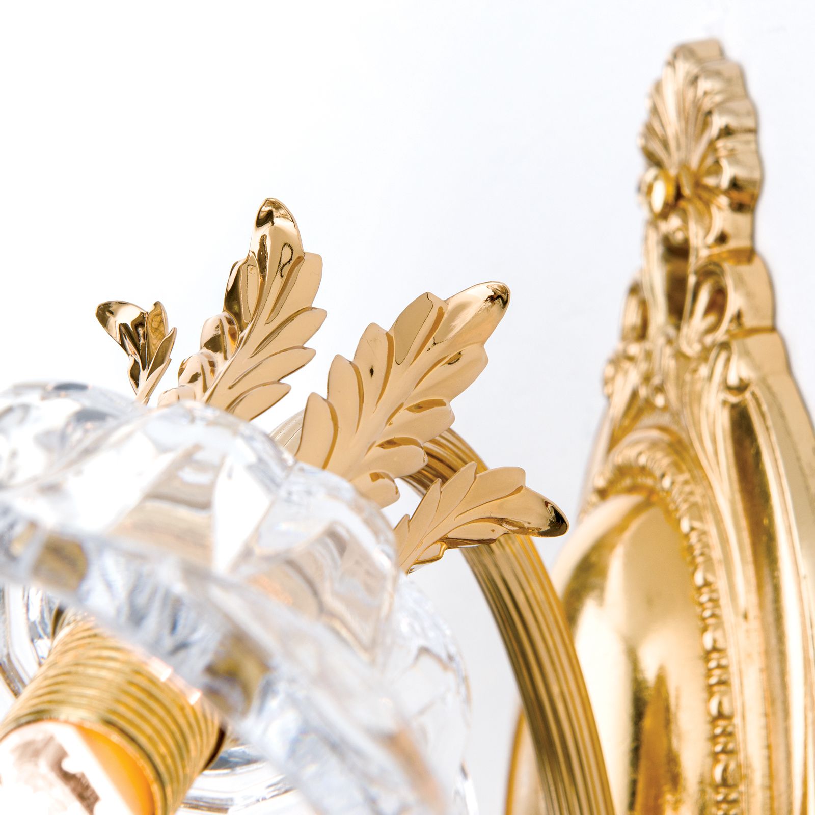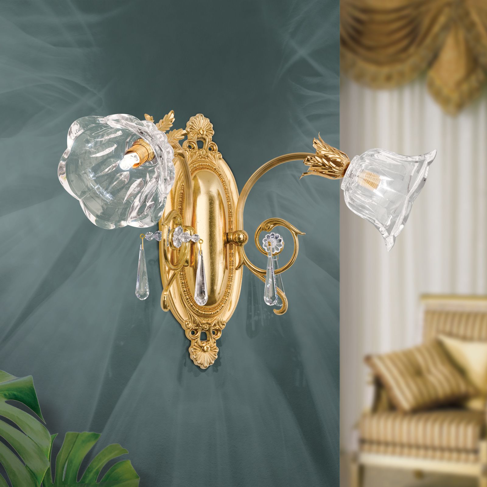 Die Leuchtenmontur besteht aus Vollmessing. An der verzierten ovalen Wandhalterung sind 2 schwungvolle gebogene Arme befestigt, die jeweils einen Kristallschirm tragen. Akanthusblätter zieren diese und sorgen für ein üppig florales Erscheinungsbild. Für mehr Funkeln sind die 1A Vollschliff Kristalle in Tropfenform verantwortlich, die ihren Platz ebenso an den Armen wiederfinden.