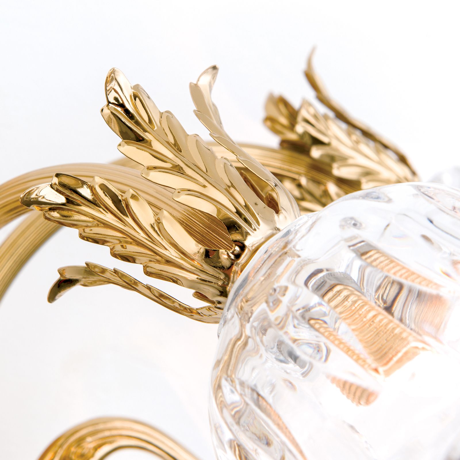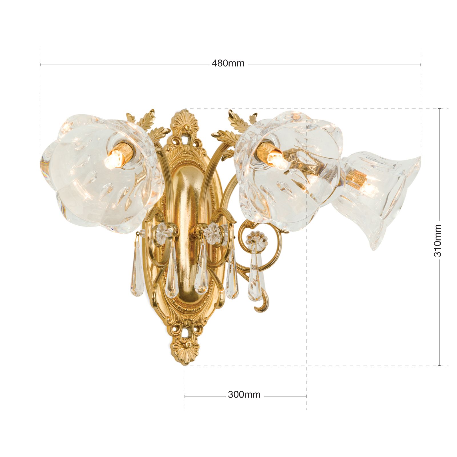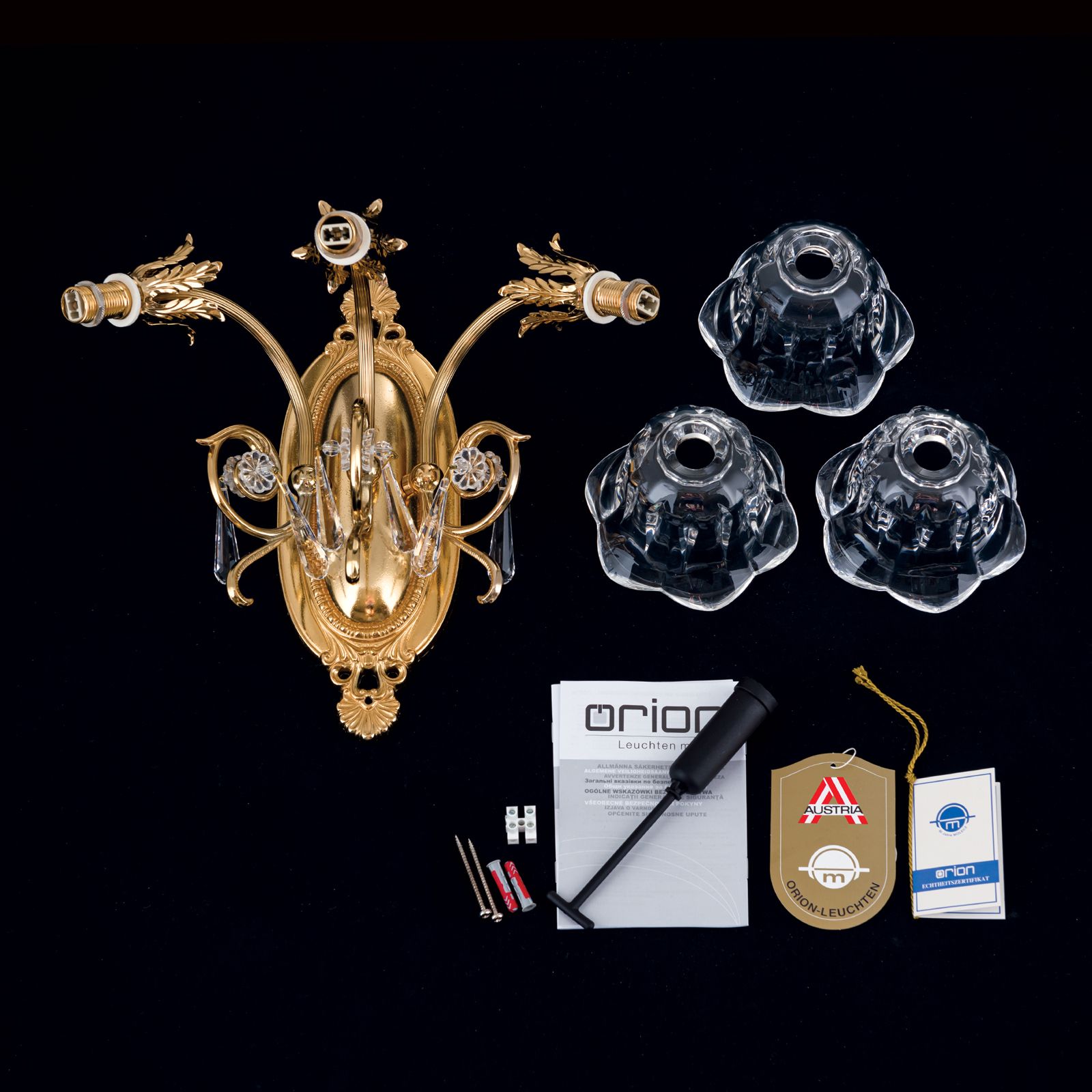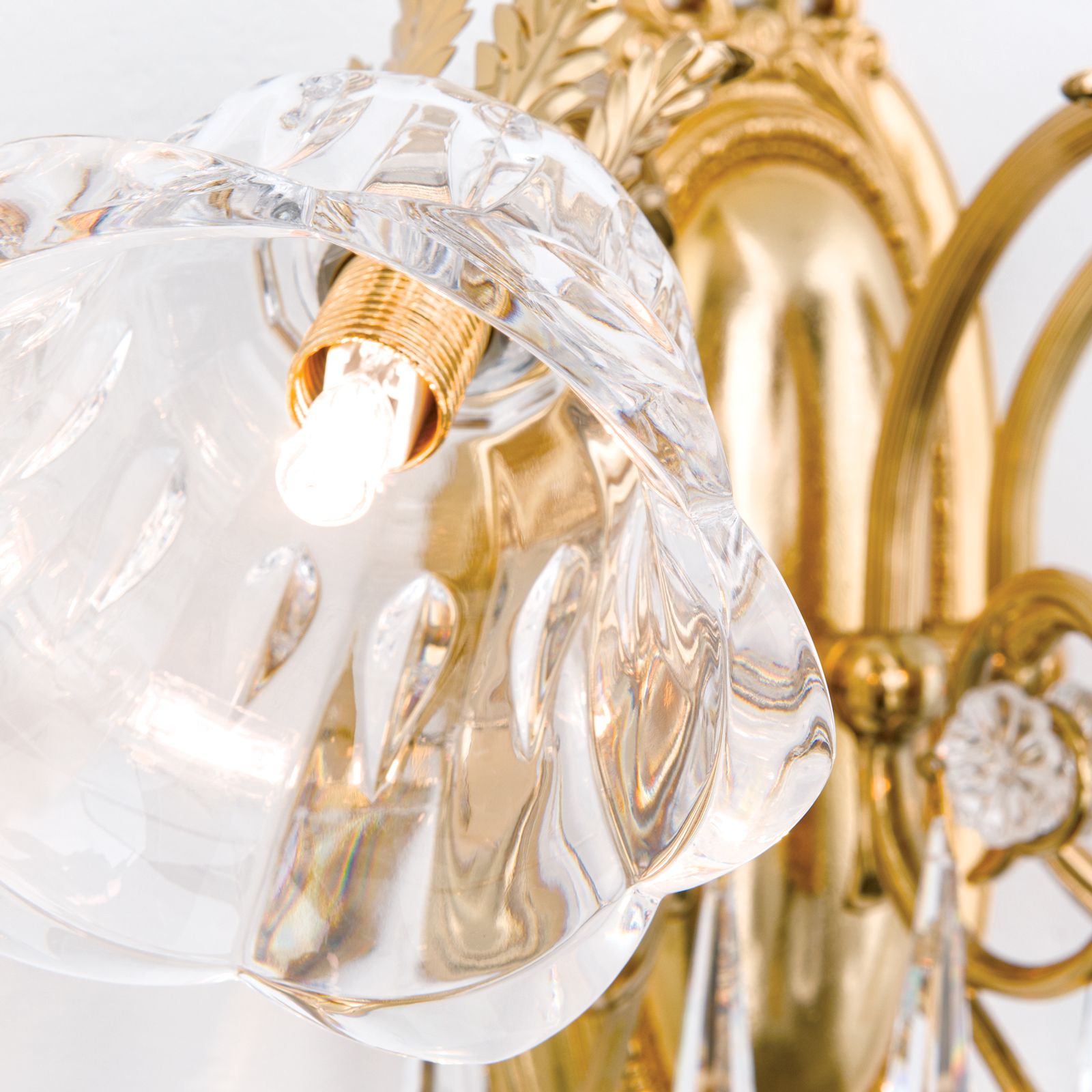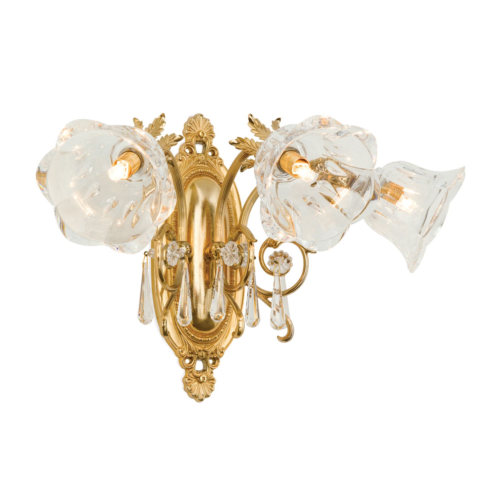 Die floral verzierte ovale Wandhalterung aus Vollmessing trägt 3 schwungvoll gebogene kannelierte Arme, die mit tropfenförmigen 1A Vollschliff Kristallen bestückt sind. Die im Diamantschliffverfahren hergestellten blütenförmigen Schirme bestehen aus klarem Kristallglas, wodurch das Licht breit gestreut wird.