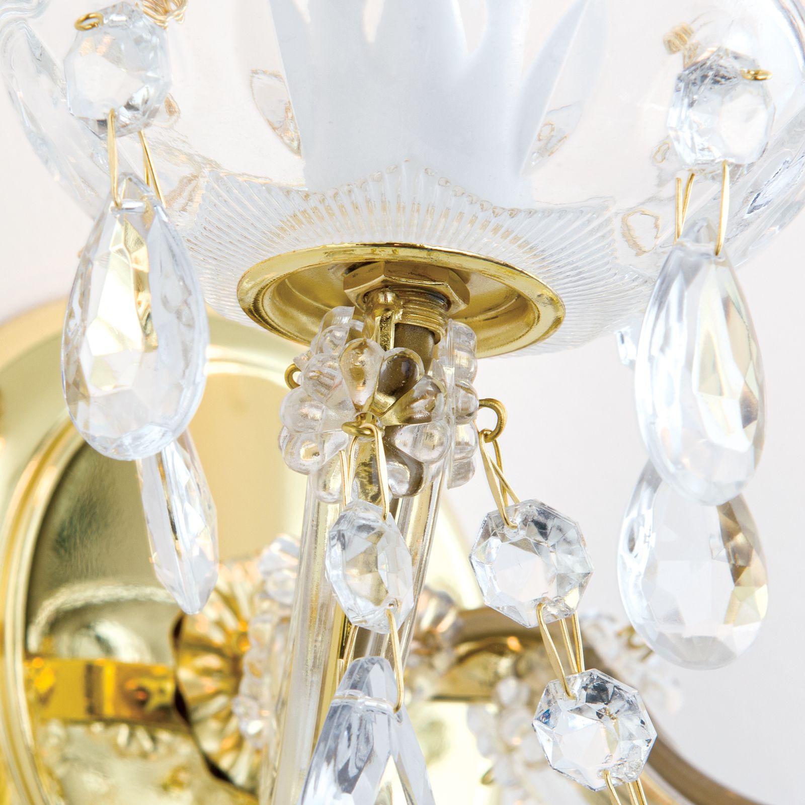 Die 2-flammige Wandleuchte aus der MARIE CLAIRE-Produktreihe kann man aufgrund ihres erhabenen Äußeren als Wandschmuck bezeichnen. Gleich einem Diadem, das ein edles Haupt krönt, erhebt diese Leuchte einen Raum in den Adelsrang. Die hochwertigen Glasarbeiten, Kristalle, Ketten, die goldene Wandrosette: Alles strahlt gelassene Schönheit aus. Setzt man zudem Windstoßkerzen in die Fassungen, ist das Bild perfekt. Die Wandleuchte mit zwei E14-Fassungen liefert zweimal bis zu 40 Watt Leistung. Klima und Umwelt sind noch einen letzten Gedanken wert: Energieeffiziente LED-Lampen helfen.