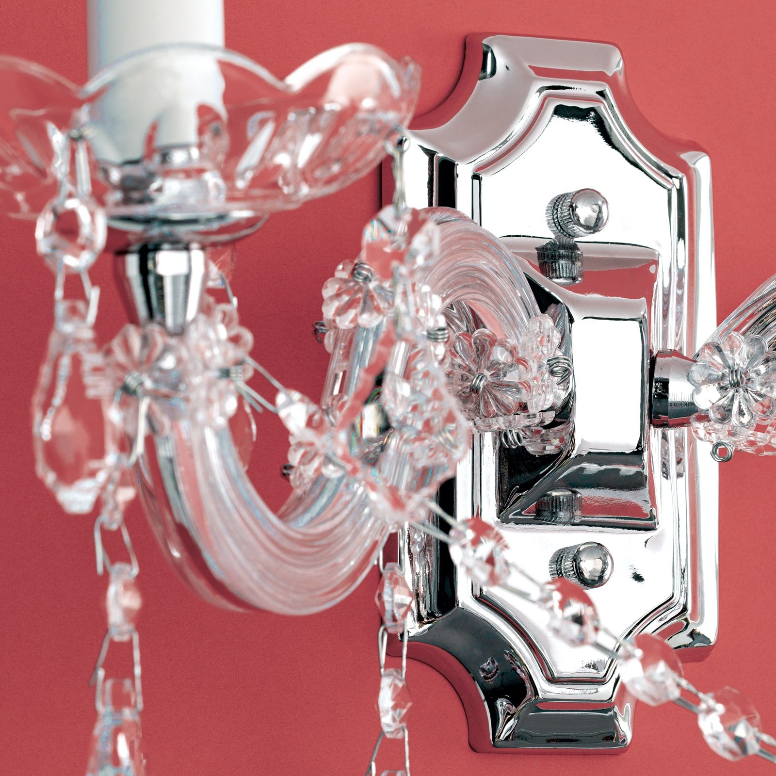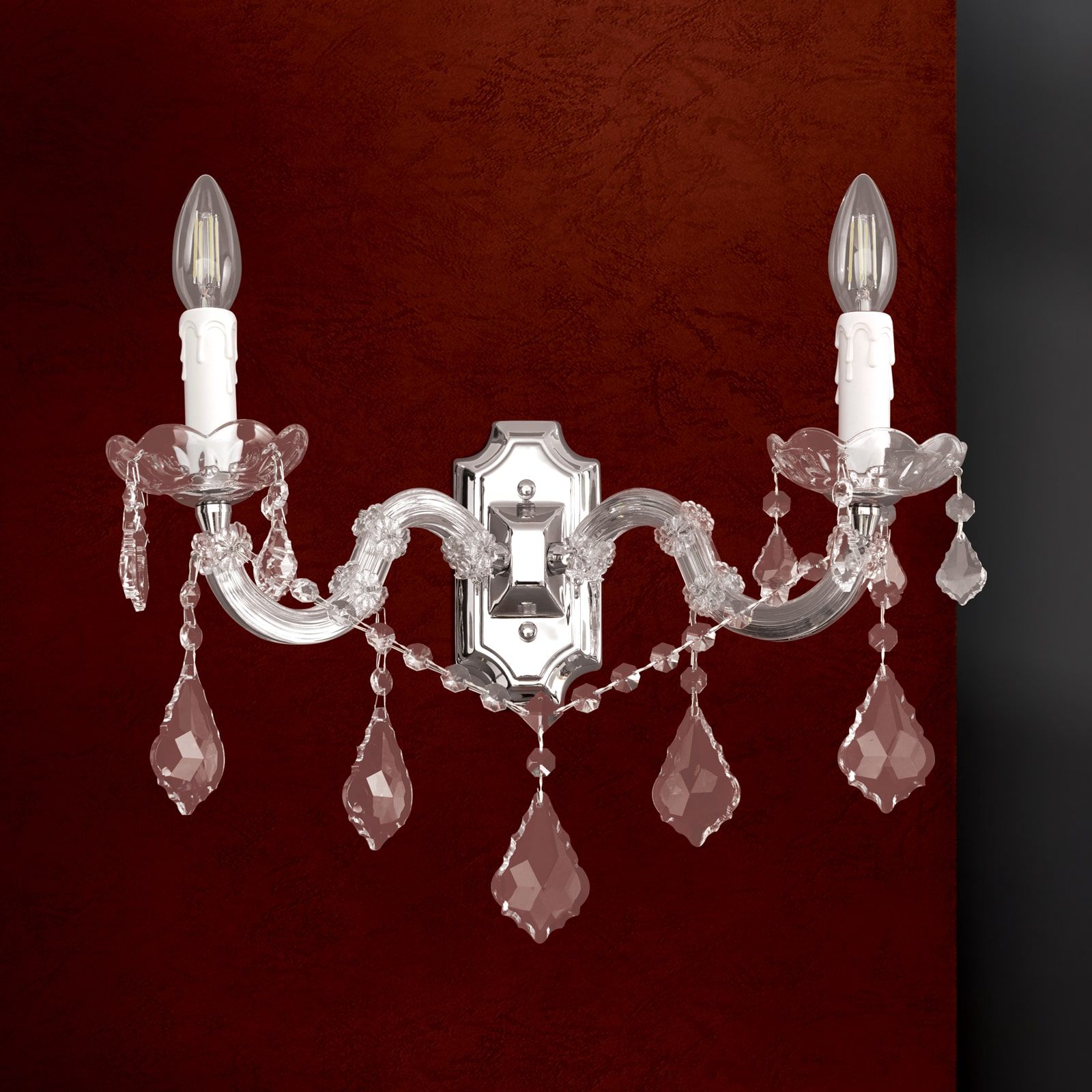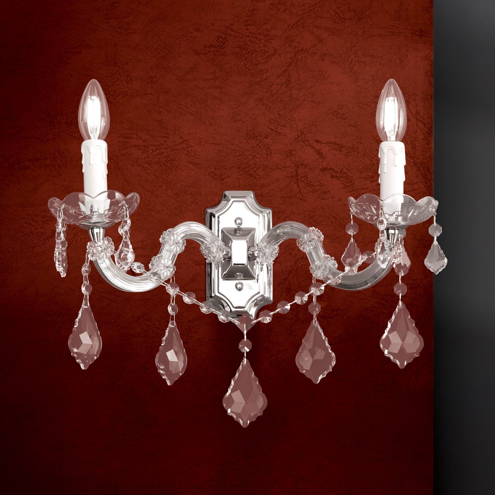 Die 2-flammige Leuchte aus der Produktreihe THERESA verschreibt sich dem Stil der weltberühmten böhmischen Glaskunst. So stand die böhmische gläserne Krone etwa den Murano-Lustern Pate. Nicht fehlen dürfen natürlich Kristallbehang in Pendelform, Perlenketten und gläserne Wachstropfenschalen von denen die beiden S-bogenförmigen Arme an der Wand zusammenlaufen. Brokattapeten, dunkle gedämpfte Farben, Stoffe und dunkles nach Harz duftende Möbel werden das edle Bild abrunden. Die Leuchte verfügt über zwei E14-Fassungen zu je bis zu 40 Watt - zum Beispiel mit stilgerechten flackernden Kerzenleuchten.