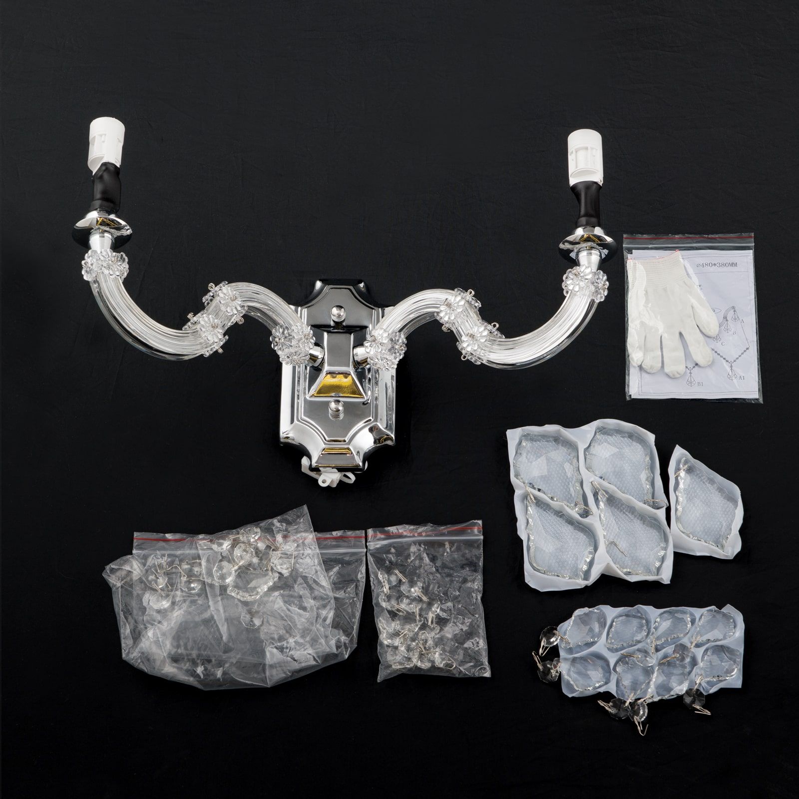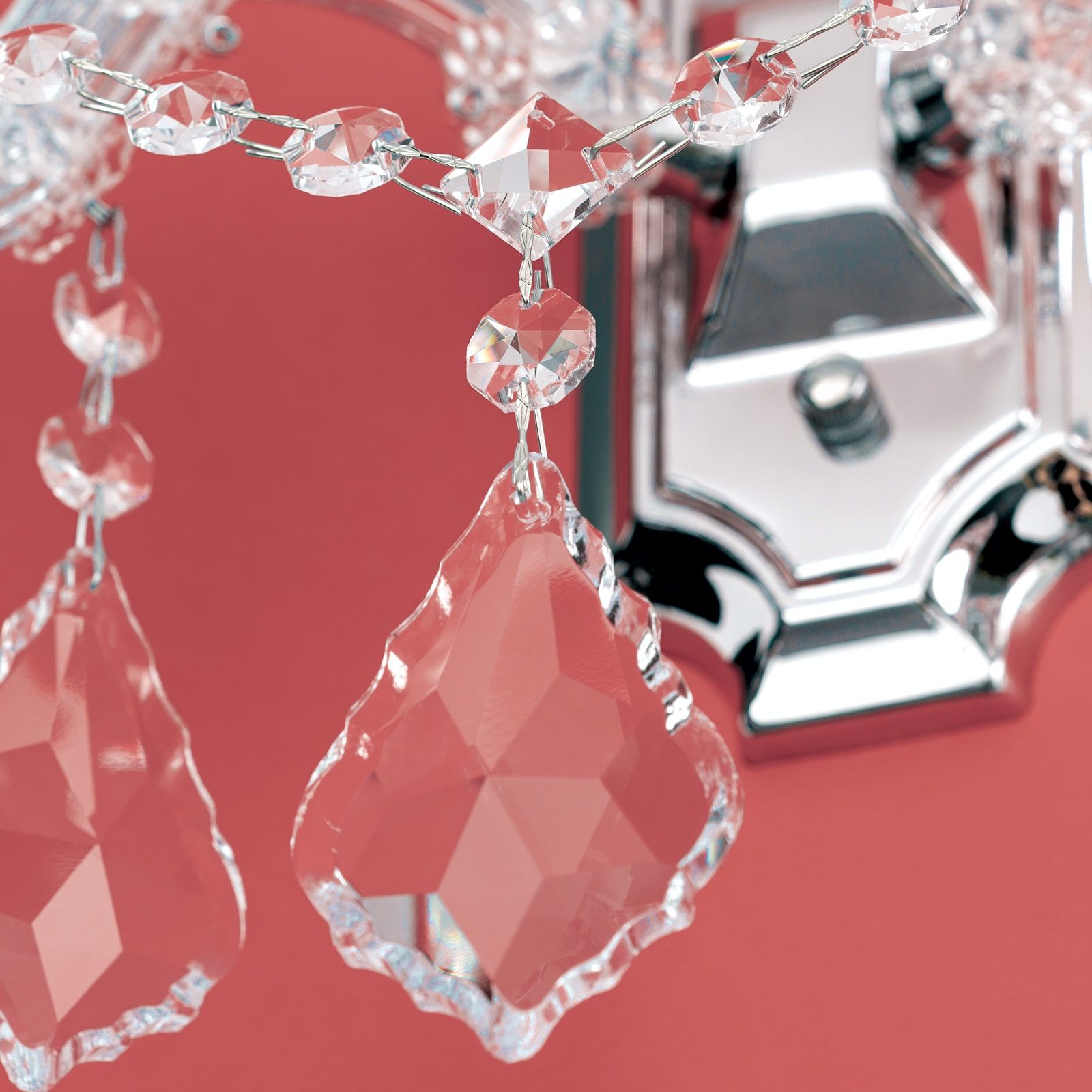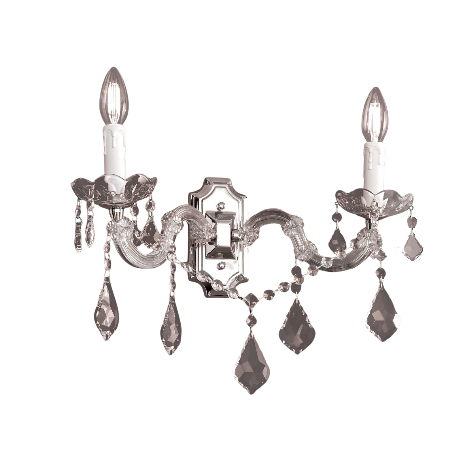 Die 2-flammige Leuchte aus der Produktreihe THERESA verschreibt sich dem Stil der weltberühmten böhmischen Glaskunst. So stand die böhmische gläserne Krone etwa den Murano-Lustern Pate. Nicht fehlen dürfen natürlich Kristallbehang in Pendelform, Perlenketten und gläserne Wachstropfenschalen von denen die beiden S-bogenförmigen Arme an der Wand zusammenlaufen. Brokattapeten, dunkle gedämpfte Farben, Stoffe und dunkles nach Harz duftende Möbel werden das edle Bild abrunden. Die Leuchte verfügt über zwei E14-Fassungen zu je bis zu 40 Watt - zum Beispiel mit stilgerechten flackernden Kerzenleuchten.