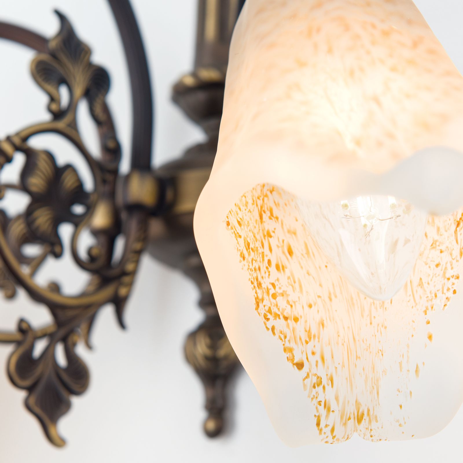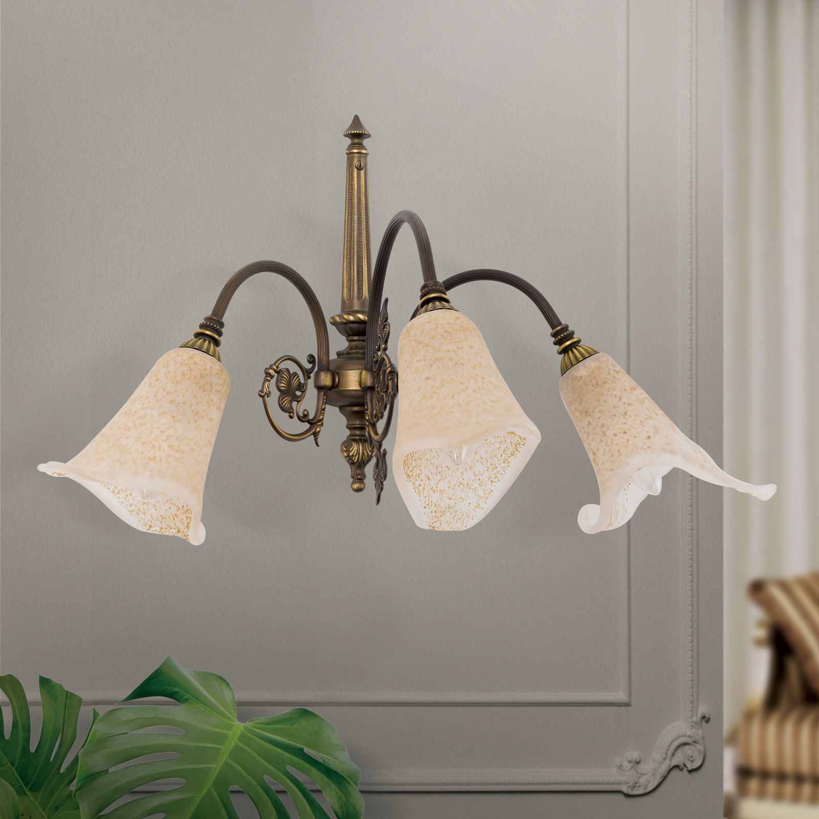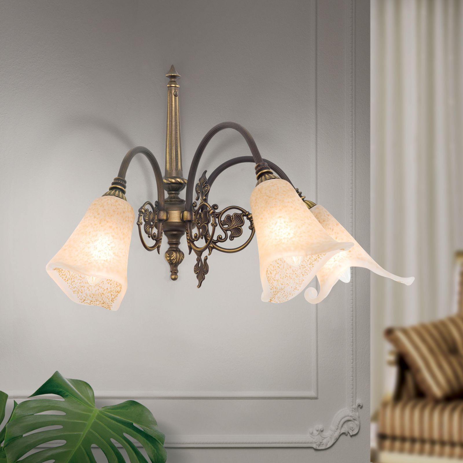 Die Reihe TOSCA liefert Leuchten von verträumter Schönheit. Die 3-flammige Wandleuchte aus dieser Kollektion beschenkt den Raum mit einem weichgezeichneten, pastellfarbenen Licht. Drei Schirme in Blütenform streuen eine romantische Lichtaura über einem bequemen Fauteuil, einer Kommode in einem Vorzimmer, einem Spiegel in einem Schlafzimmer. Voluten, Kanneluren und Blattwerk zieren die barockisierenden Arme. Die handschattierte Altpatina verleiht der Leuchte eine sanfte Anmutung. Ensembles mit edlen Stoffen, warmen Farben und stilvollen Einrichtungsgegenständen werden sehr von der Ausstrahlung dieses Leuchtkörpers profitieren. Die Leuchte wird über drei E14-Fassungen mit je bis zu 40 Watt betrieben.