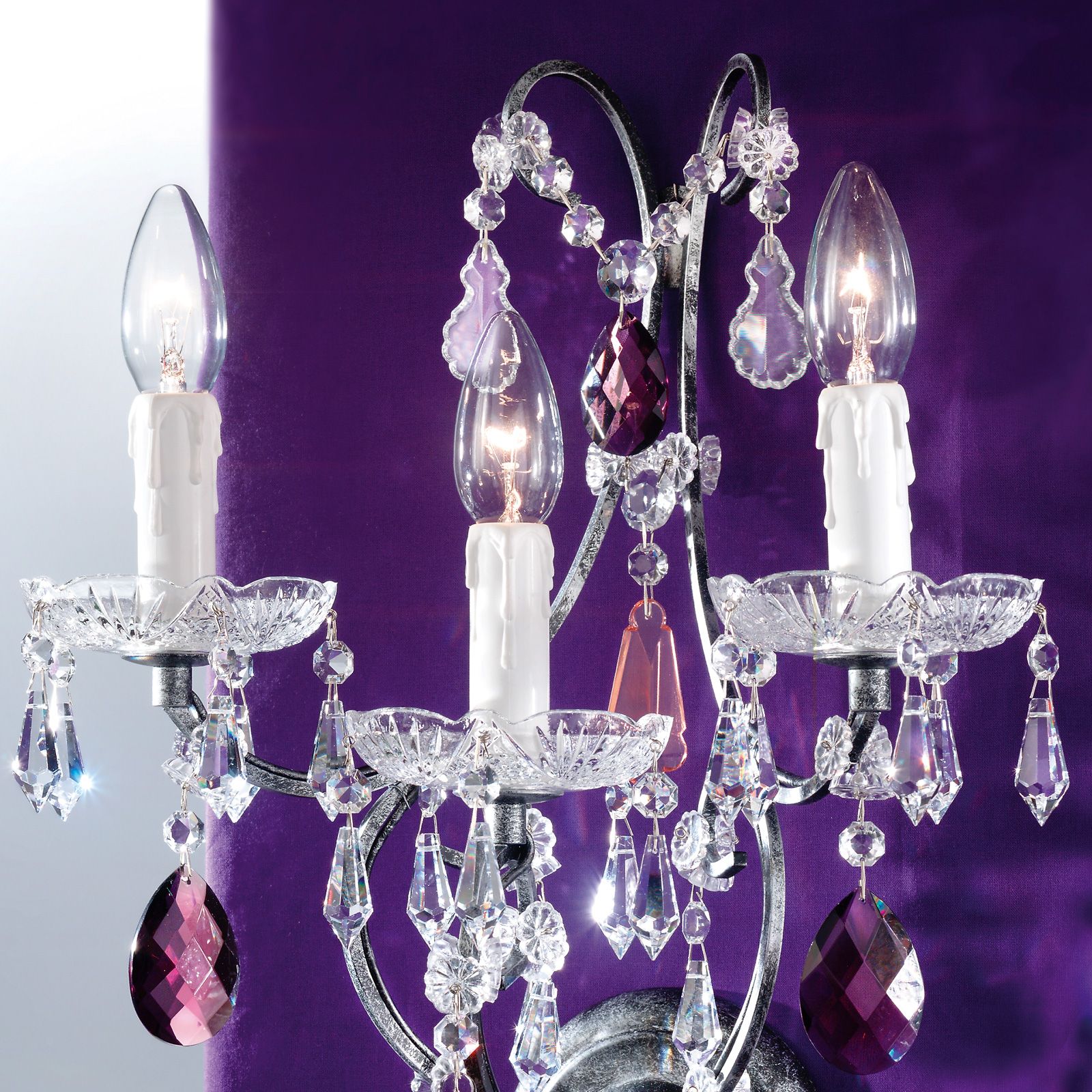 Edle und rustikale Elemente miteinander kombiniert, ergeben die Wandleuchte VERONA, die durch eine antiksilberne Oberfläche und ihren klaren und bunten 1A Vollschliff Kristallbehang überzeugt. Flure, Wohn-, Ess- und Schlafzimmer im Privatbereich leuchtet sie gut aus, kann aber durchaus ihren Platz in Objekträumen finden und dort mit anderen Leuchten aus der gleichnamigen Serie kombiniert werden. An dem schwungvollen Gestänge sind zahlreiche unterschiedlich geschliffene Kristalle angebracht, die sich auch in ihrer Farbe unterscheiden. Besonders schön sind auch die 3 Kerzenschalen, die aus Kristallglas bestehen und jeweils eine G9-Fassung halten, die mit maximal 40 Watt betrieben werden kann. Durch die direkte Bestrahlung fangen dabei die Kristalle und Kerzenschalen zum Glitzern und Funkeln an und laden zum Bestaunen ein.