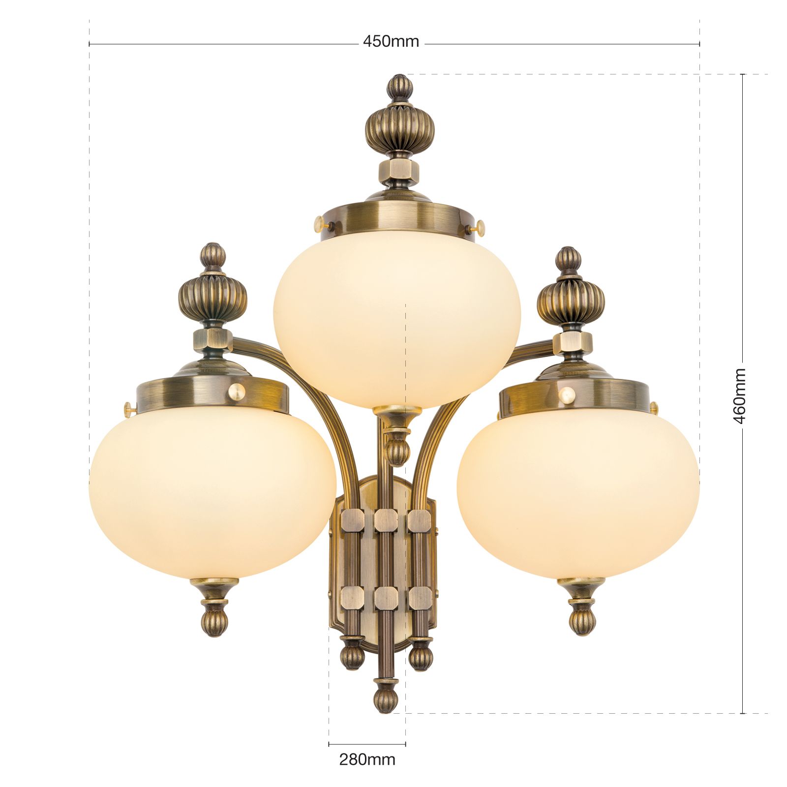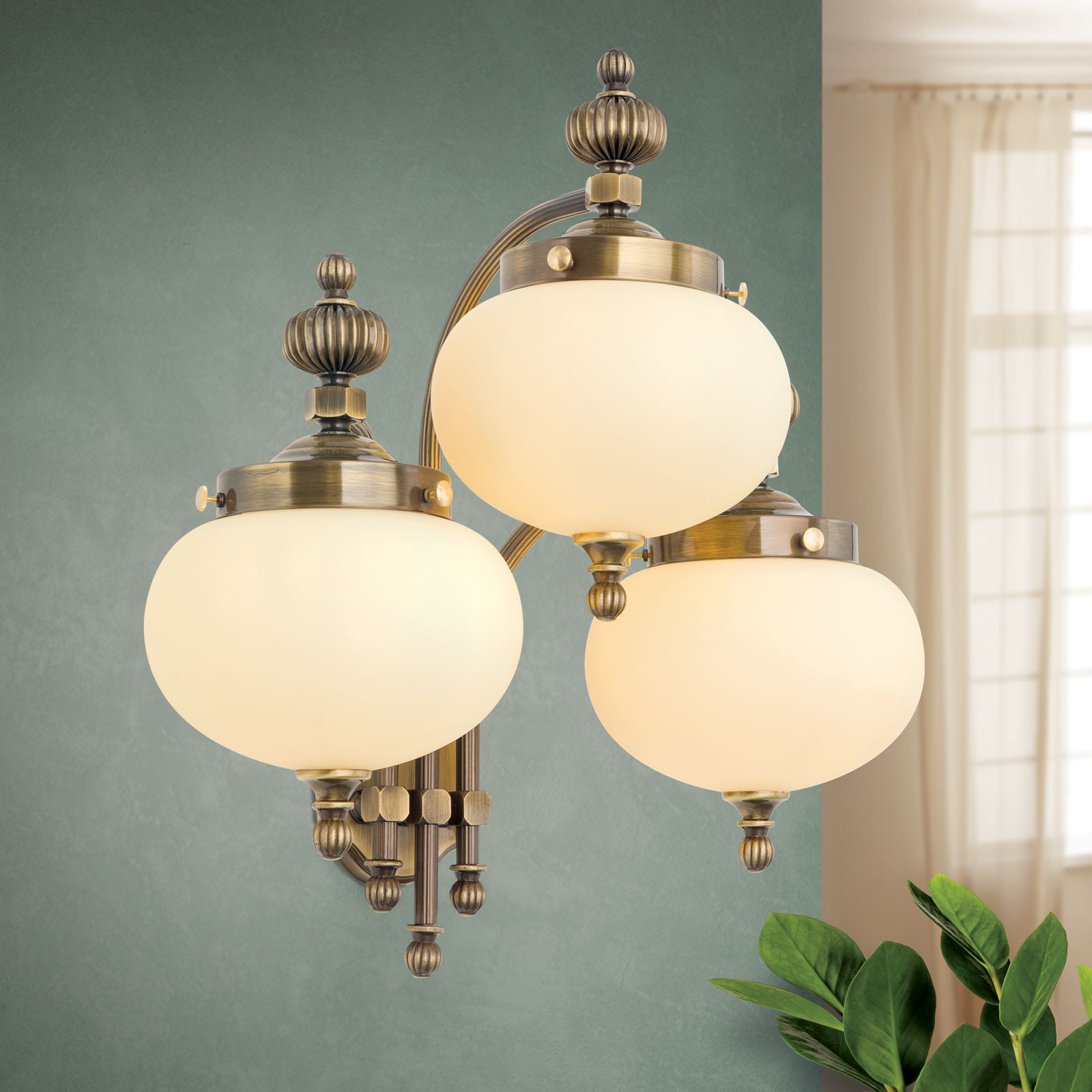 Die drei Flammen der Wandleuchte aus der Reihe WIENER NOSTALGIE treten mit ihren kraftvoll geschwungenen Armen selbstbewusst aus der Wand hervor. Die Messingarbeiten, Einfassungen und Verzierungen reflektieren Tages- wie elektrisches Licht und erzeugen dabei eine elegante Pracht. Faltkugeln und Zierknäufe vervollkommnen das edle Ensemble. An einer Wand mit hellen Tönen wird die ohnedies große Leuchtkraft durch Zurückwerfen des Lichtes verstärkt. Bei dunklen Tönen entsteht ein mystisch anmutender Hintergrund mit imposanter Lichtaura. Elegante, stilvolle, bequeme Möbel werden durch diesen Leuchtkörper besonders zur Geltung gebracht. Die Wandleuchte ist mit drei E27-Fassung für je maximal 60 Watt versehen.