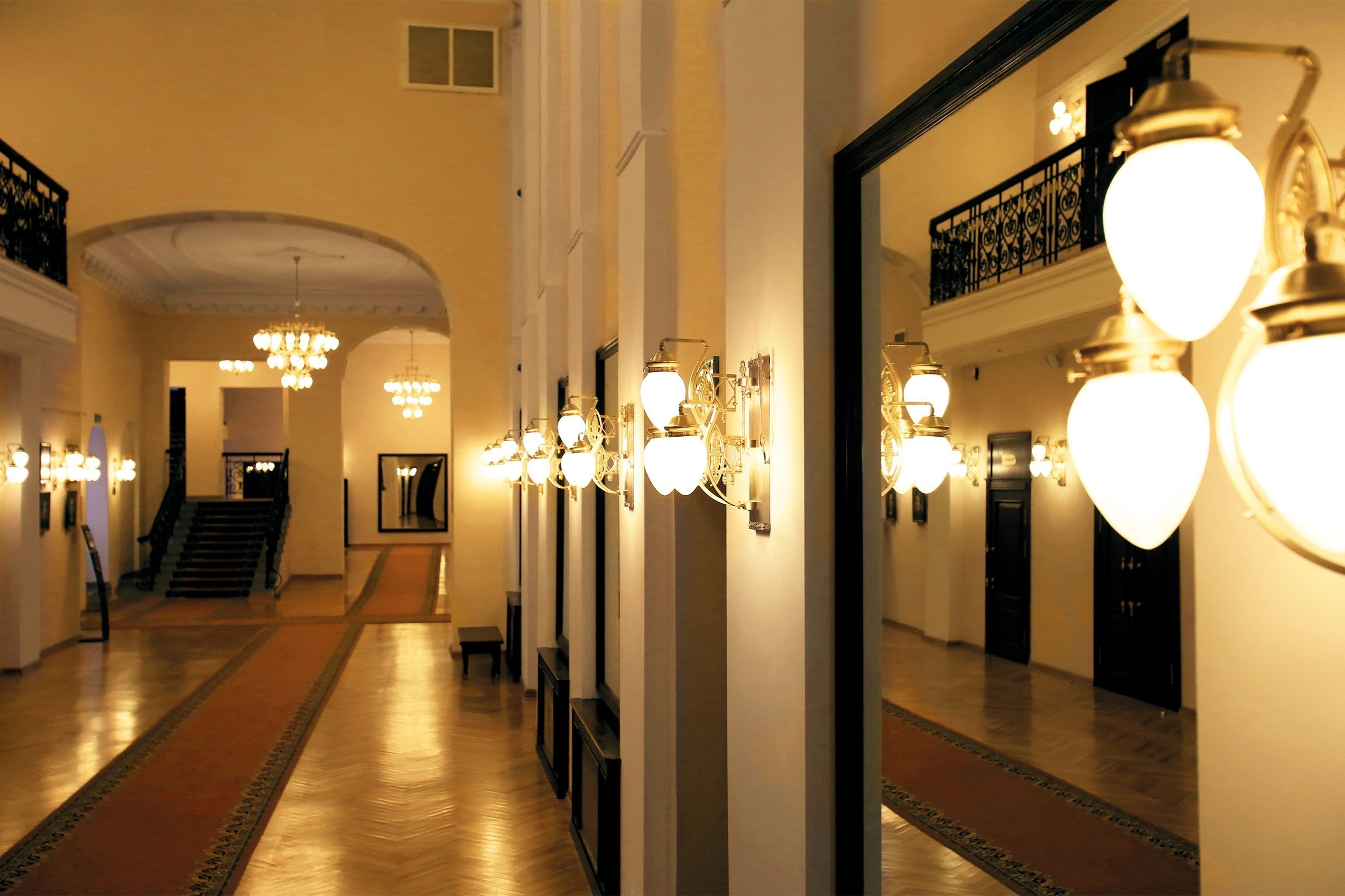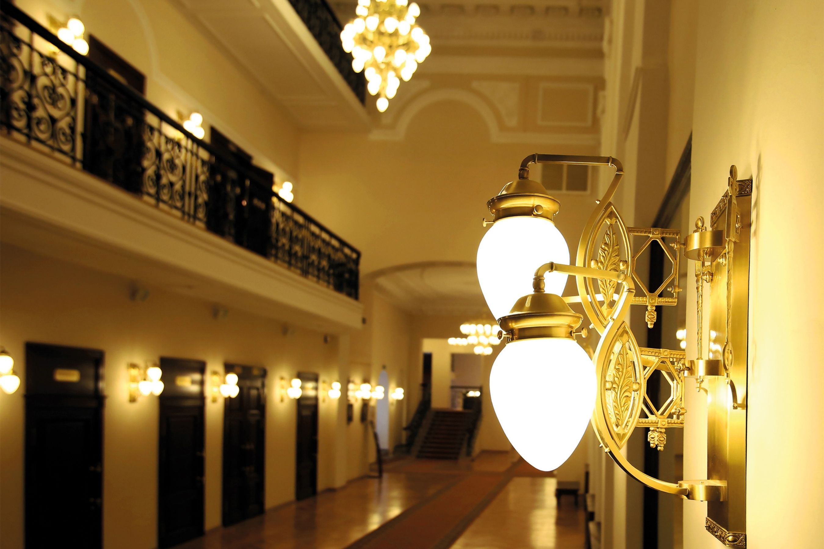 Ausgewählt wurden mehrere Großleuchten der Serie „Design by ORION: BUDAPEST“, wobei die zentralen Luster – ca. drei Meter große Sonderanfertigungen – den Mittelpunkt der dekorativen Beleuchtung des Hauses markieren. Neben diesen Leuchten im Theatersaal hat ORION viele Dutzend Wandleuchten in der Galerie des Saales installiert.