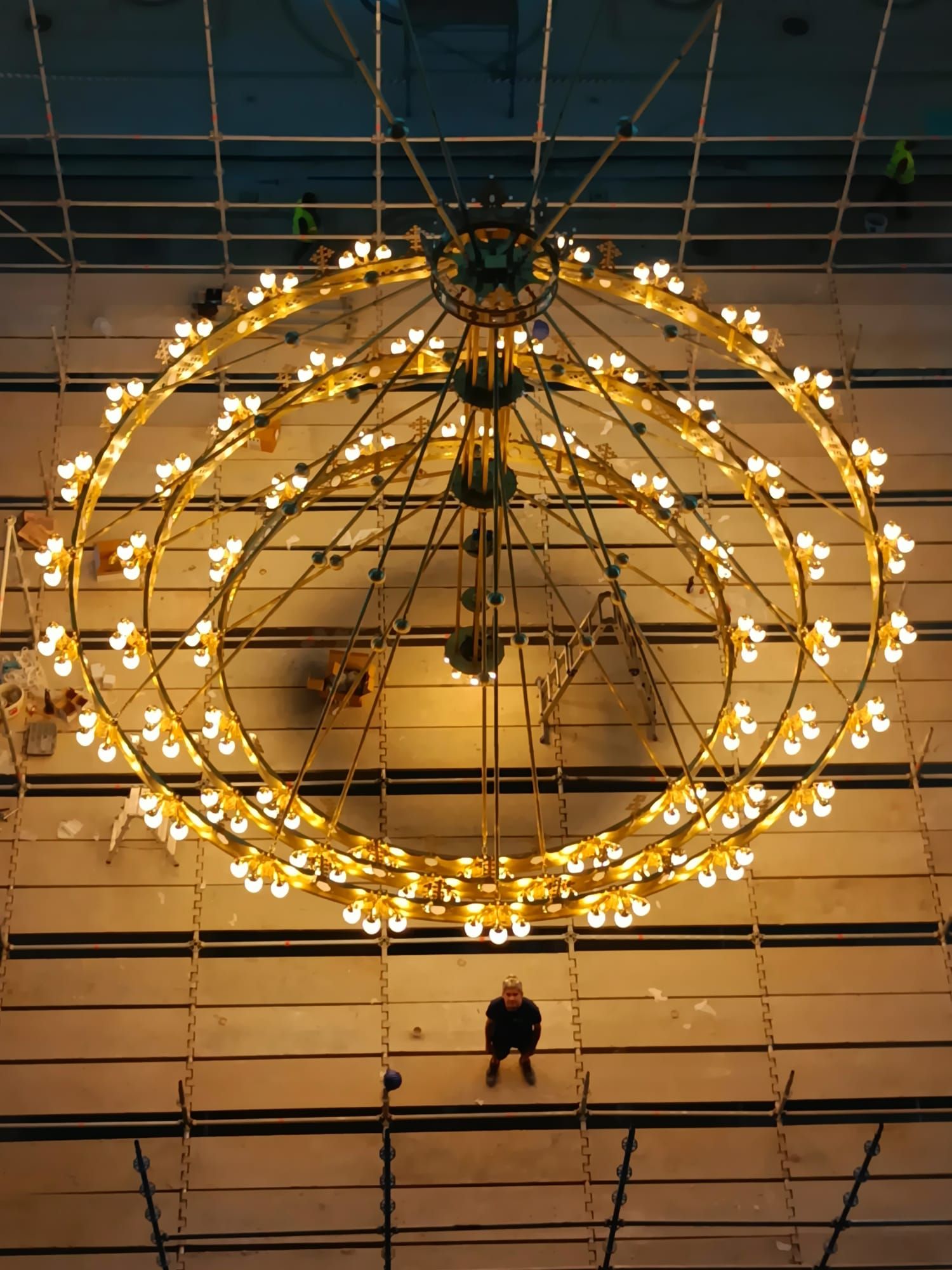 Der größte Luster beeindruckt mit einem Durchmesser von rund 8,5 Metern, einem Gewicht von etwa 1,8 Tonnen und einer edlen Bronze-Oberfläche. Ergänzt wird das imposante Erscheinungsbild durch aufwendig gefertigte Messingguss-Zierelemente sowie exklusive weiße Onyx-Details.