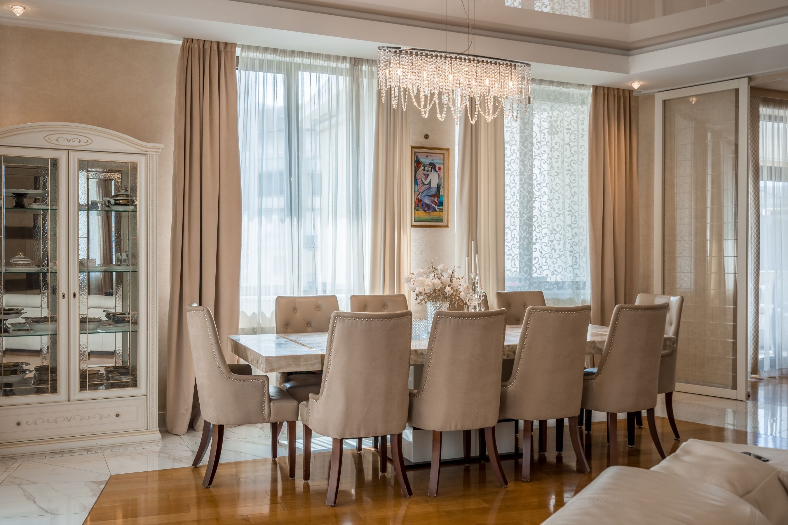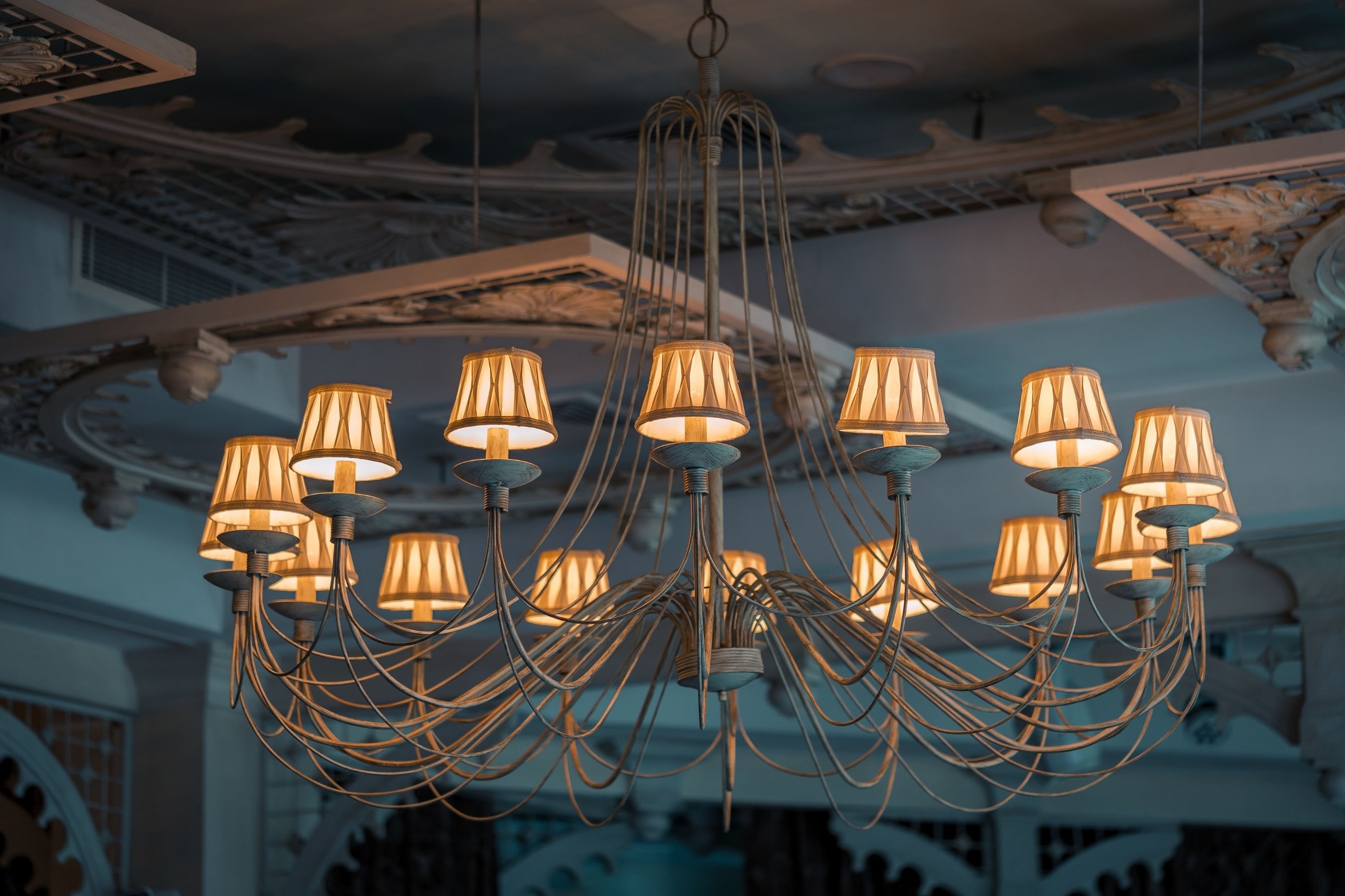 Das historische Ambiente des großen Speisesaals mit dem charakteristischen Dekor aus weißen Gusseisen-Elementen gab den Ausschlag für die Wahl der Leuchtenserie VELA. Die schwungvollen weißen Kronleuchter wurden in diesem Projekt zusätzlich mit cremefarbenen Organzaschirmen kombiniert und fügen sich nahtlos in das Interieur.